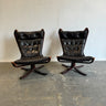 In good vintage condition, these iconic Falcon chairs by Sigurd Russell are both comfortable and stylish. Crafted in Norway, they exhibit only minor scuffs and patina on their leather surfaces, which is natural for their age. No tears or significant damage are present. This set includes both chairs at the listed price.