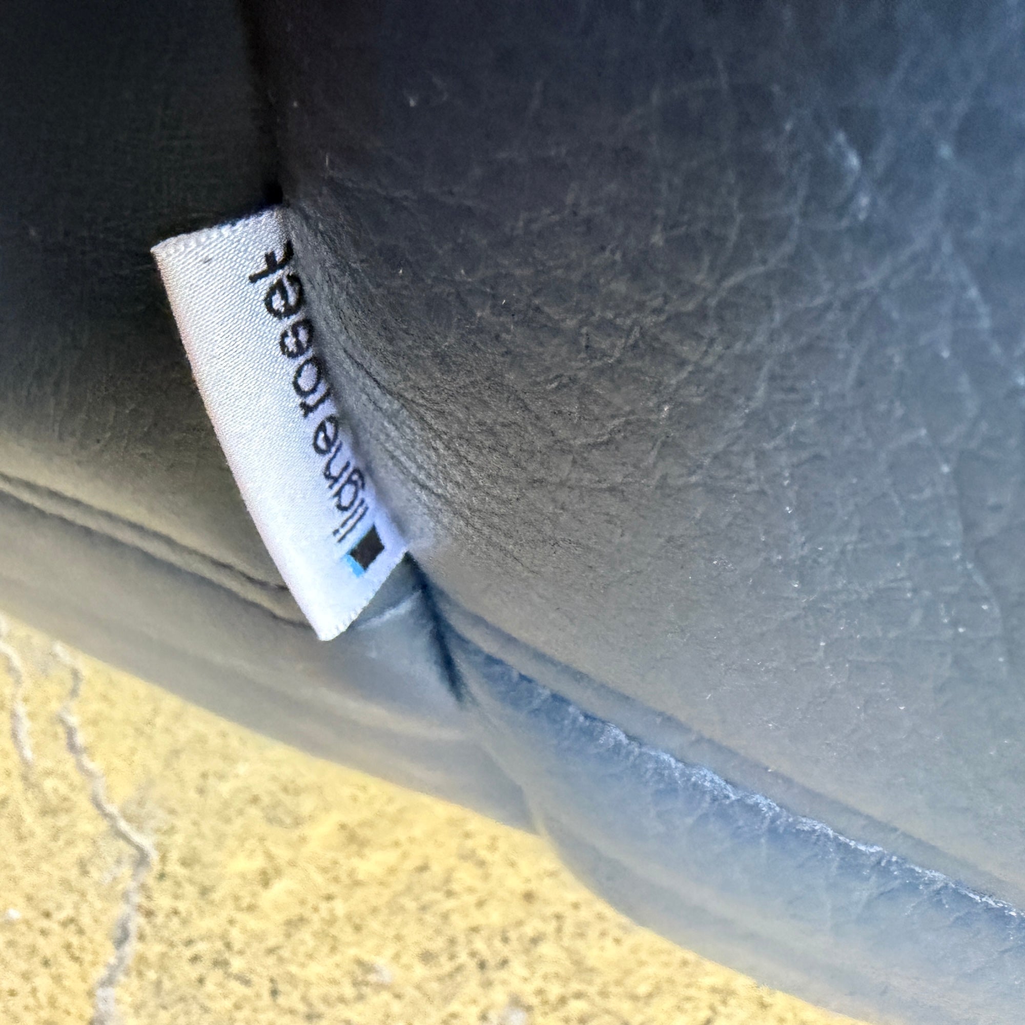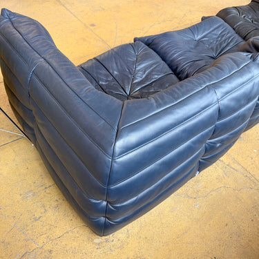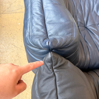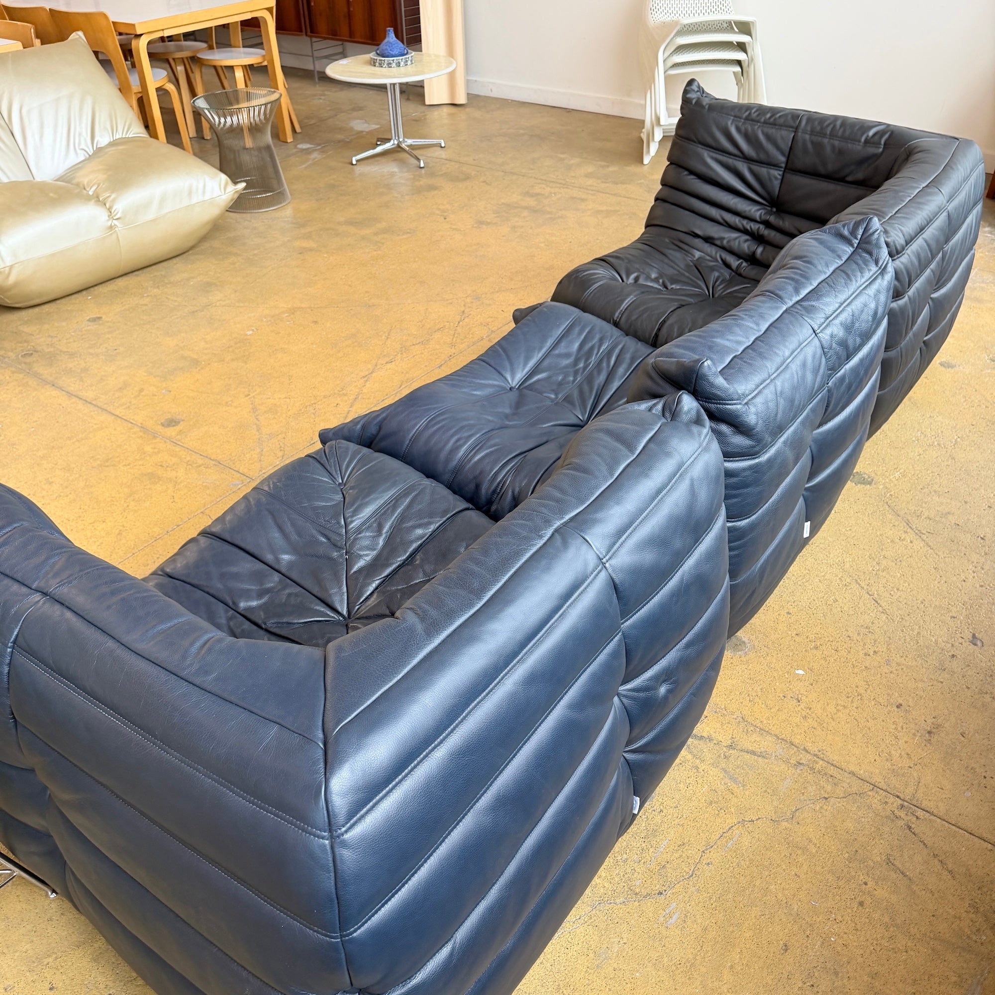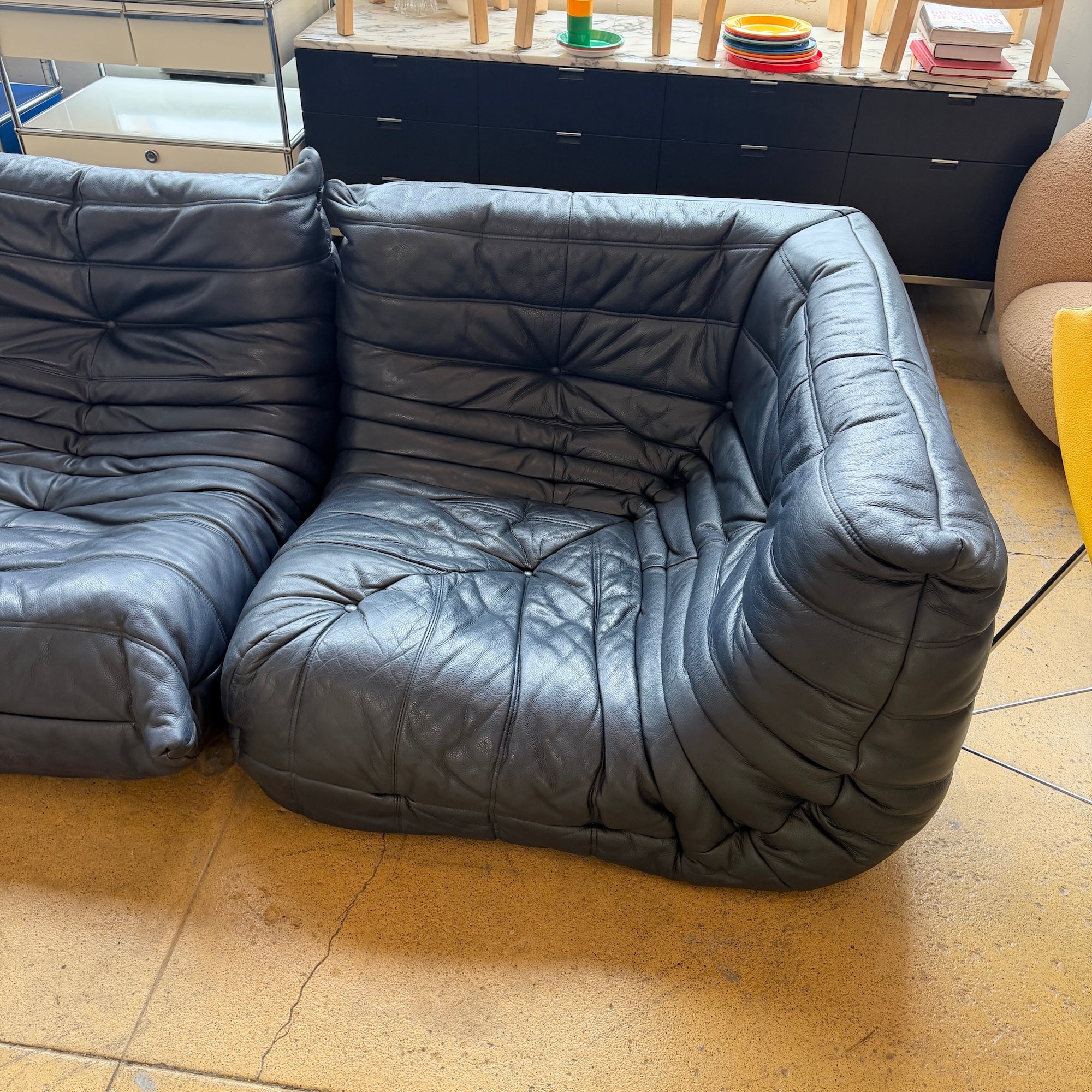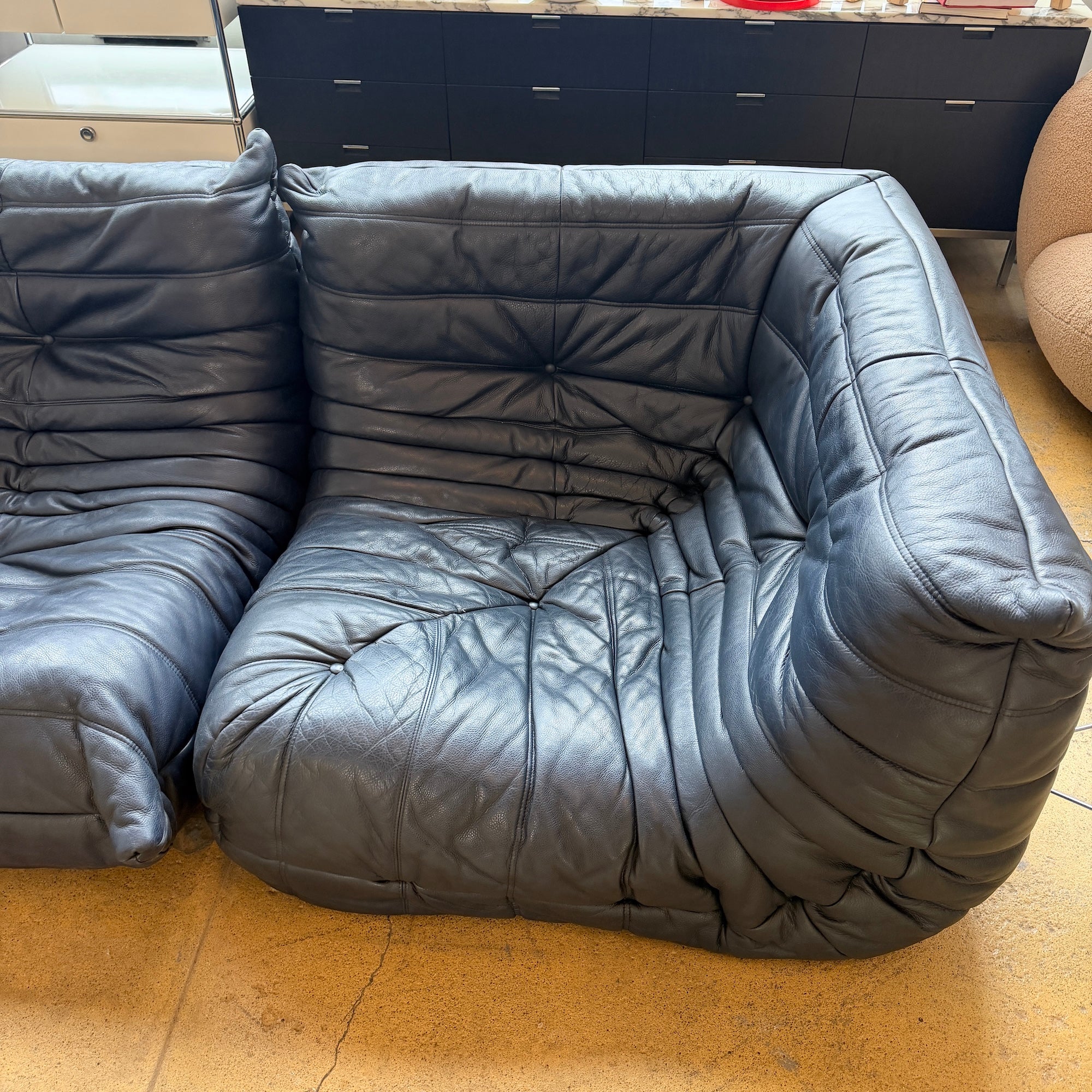 Authentic Ligne Roset Togo set in premium leather, consisting of two corner pieces and one single-seater. One corner piece is in a slightly different leather tone, while the other two pieces are in a deep dark navy. The color variation is very subtle, and the black corner piece is in new condition. Check last photo for the closeup differentiation.