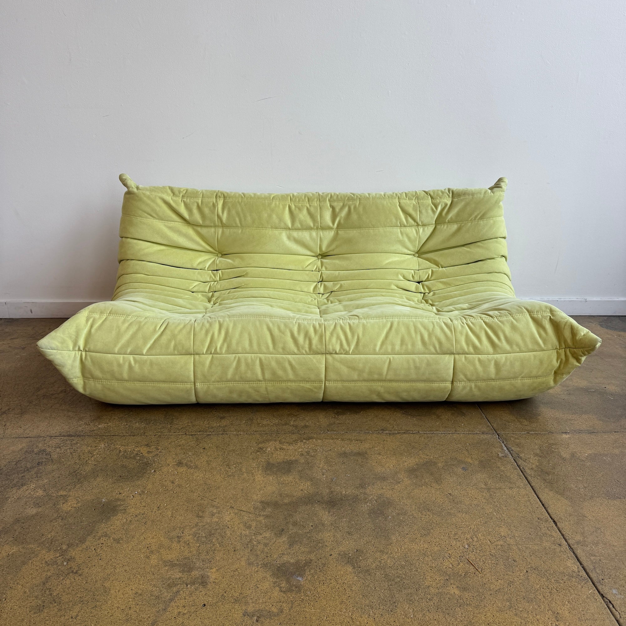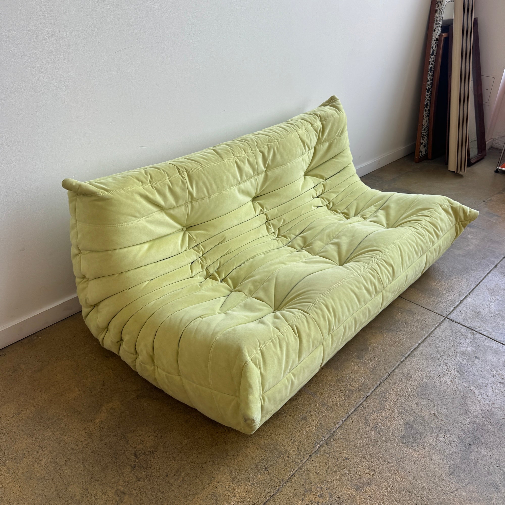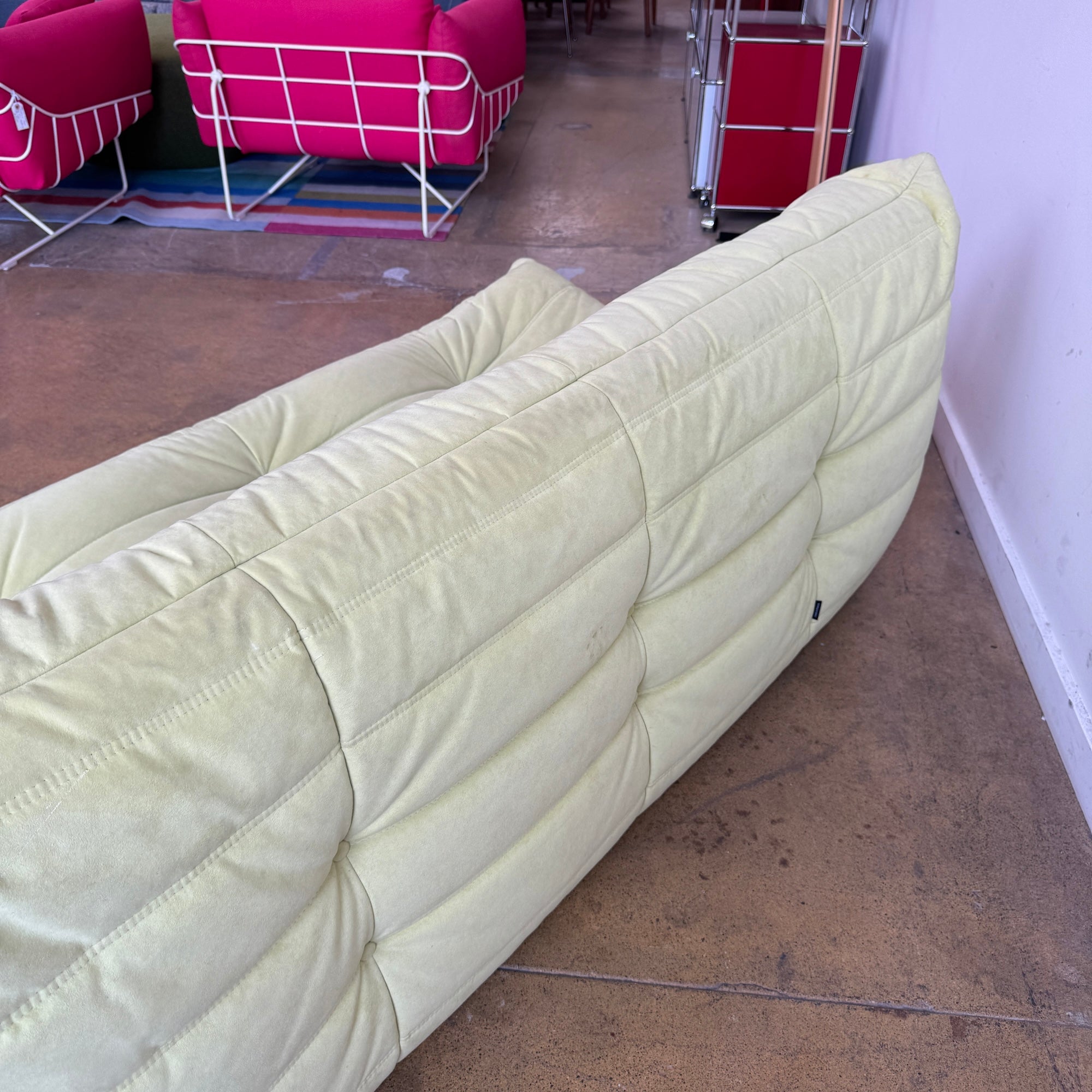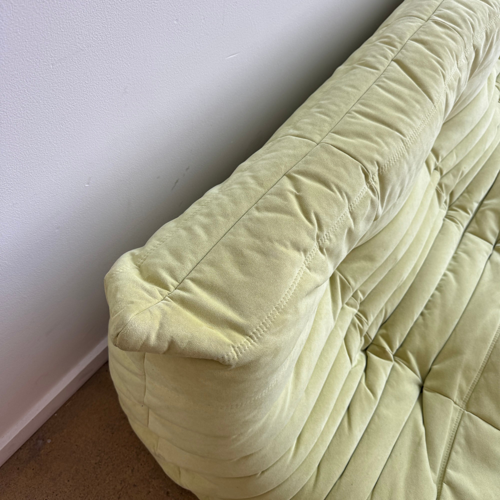 This is an authentic togo three seater sofa in good condition. Color is pastel green. Alcantara A fabric.