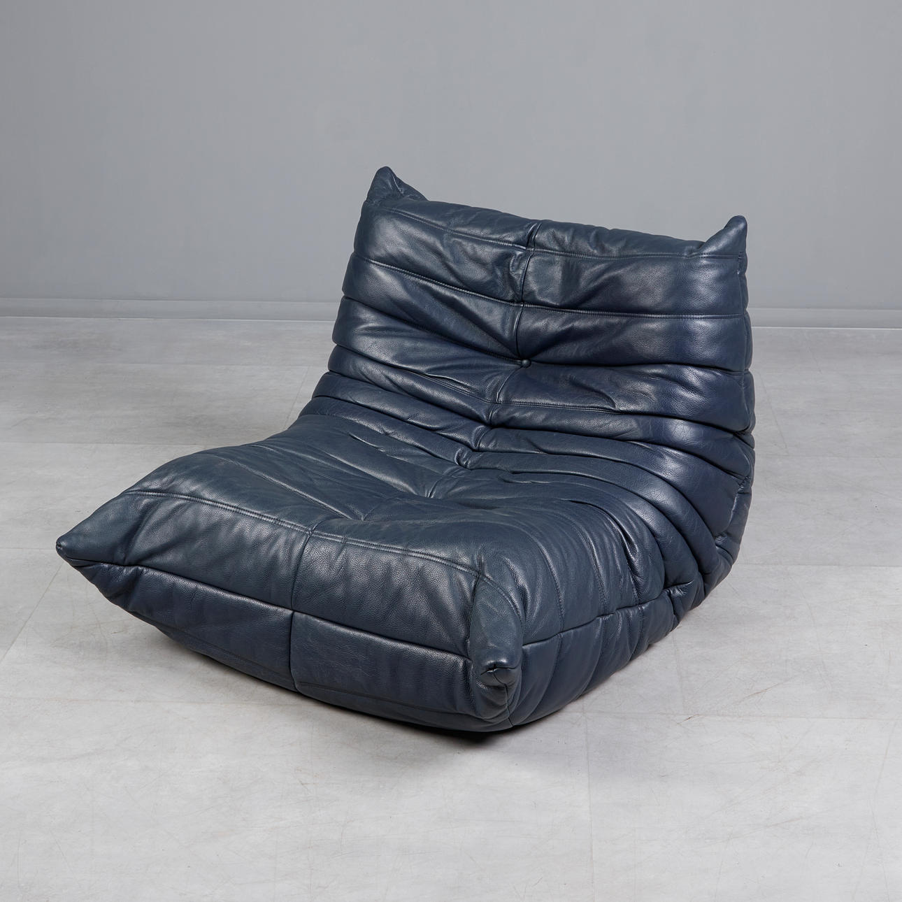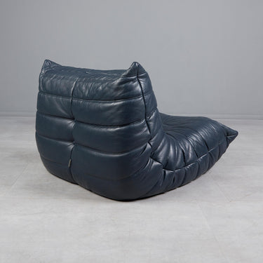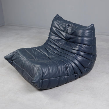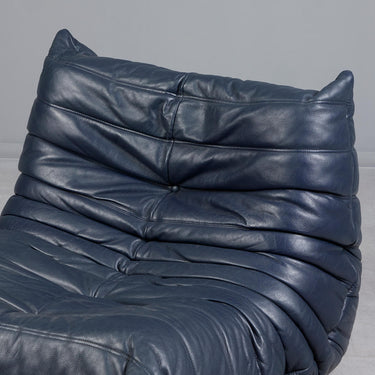 Iconic “Togo” lounge chair designed by Michel Ducaroy for Ligne Roset. This authentic French edition features supple blue calfskin leather upholstery with the signature pleated design and ergonomic silhouette that has made the Togo a timeless modern classic. The all-foam construction provides exceptional comfort and a relaxed, low-slung profile.