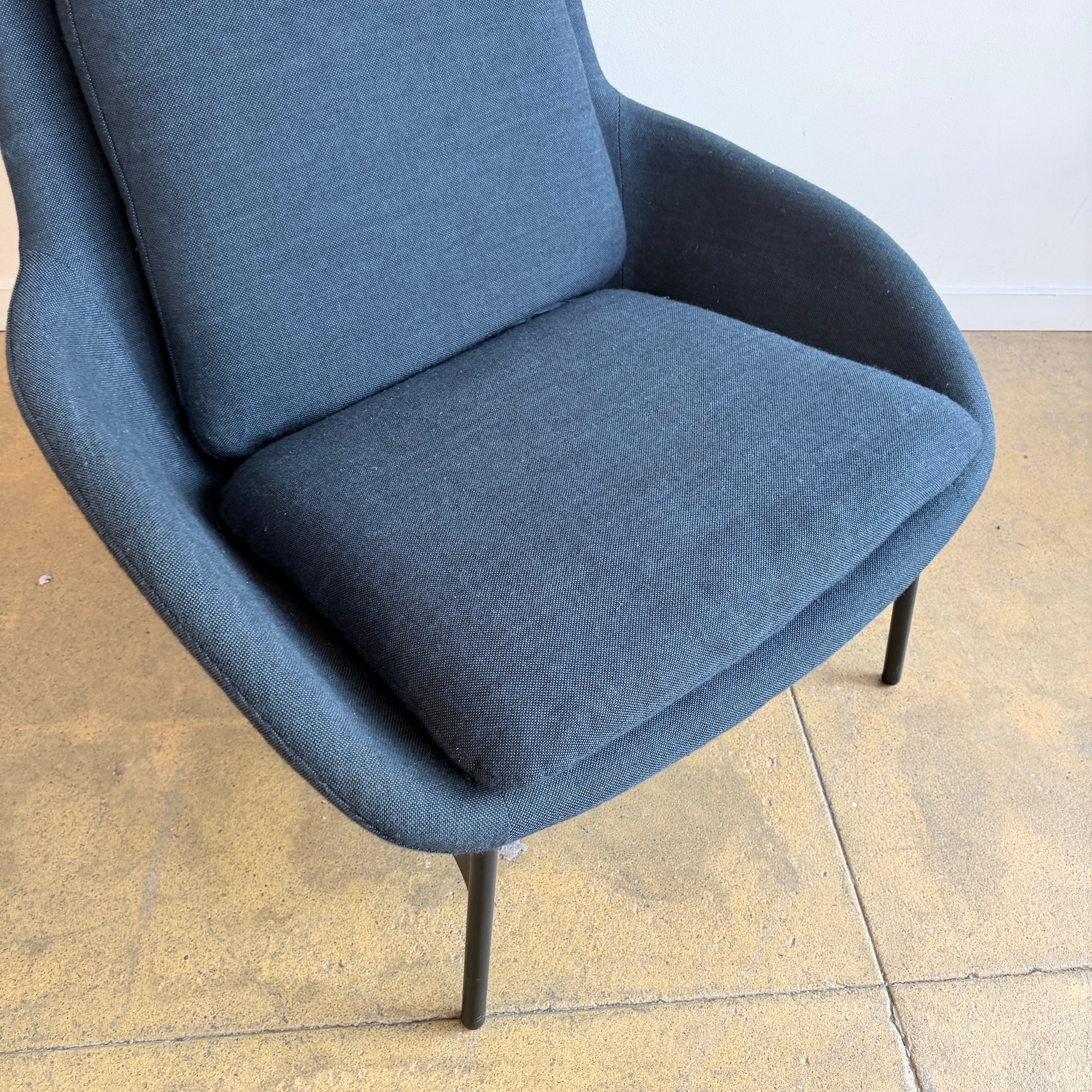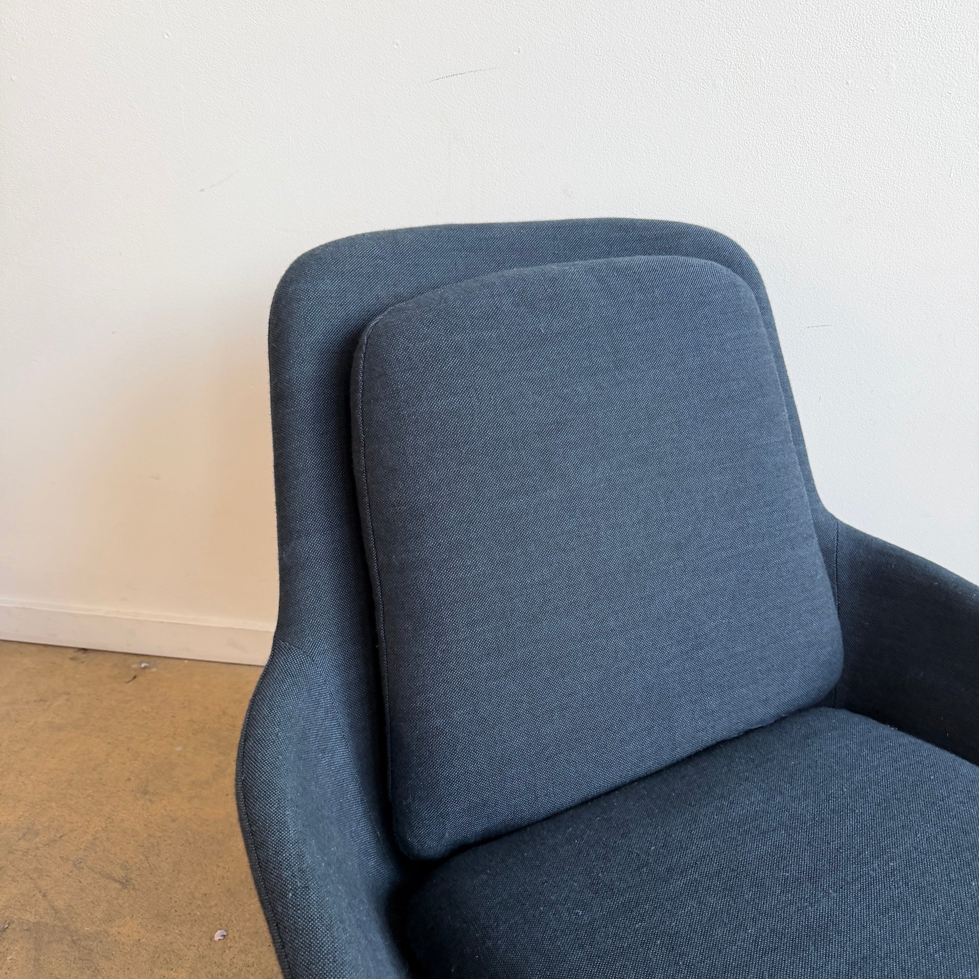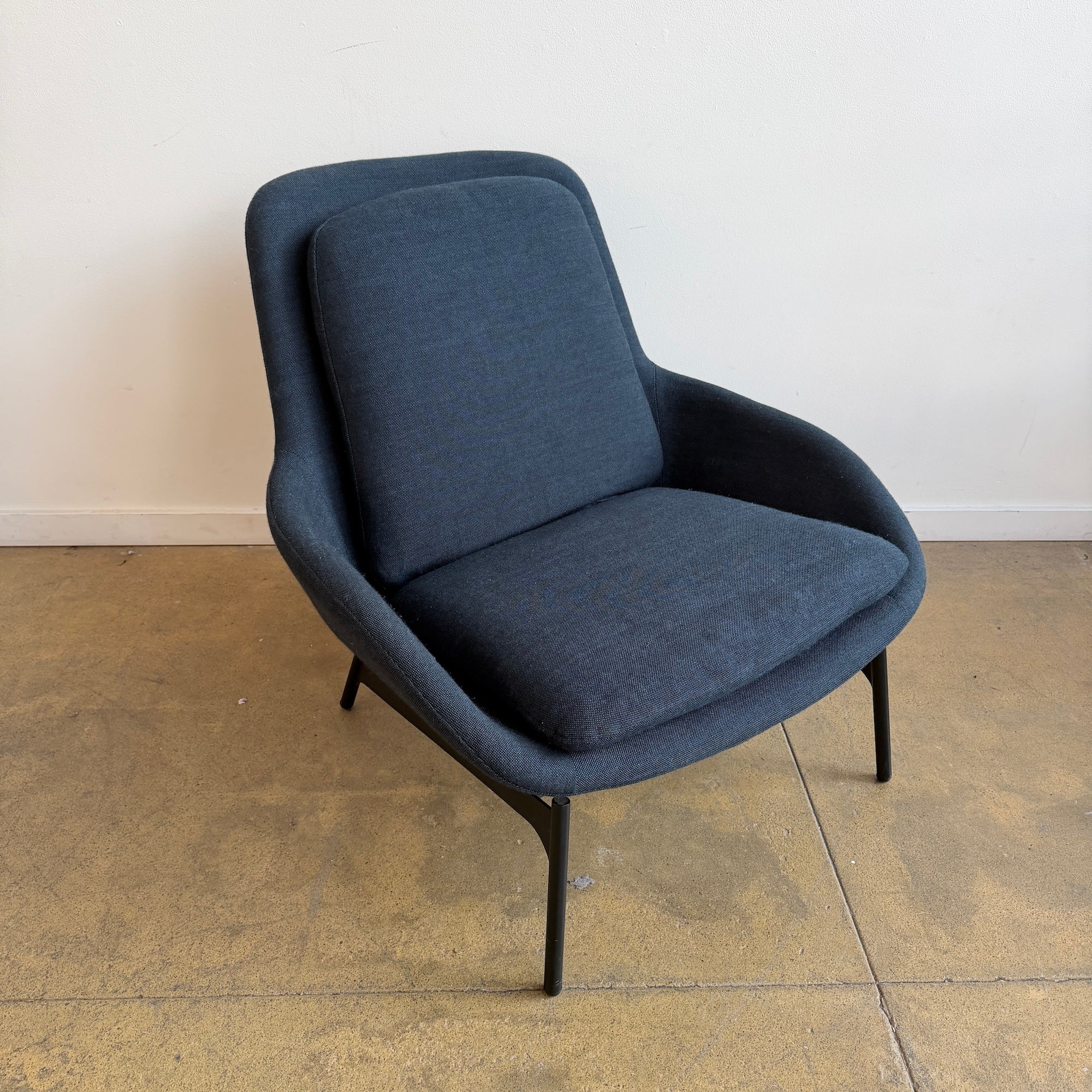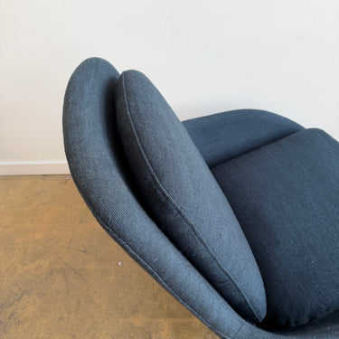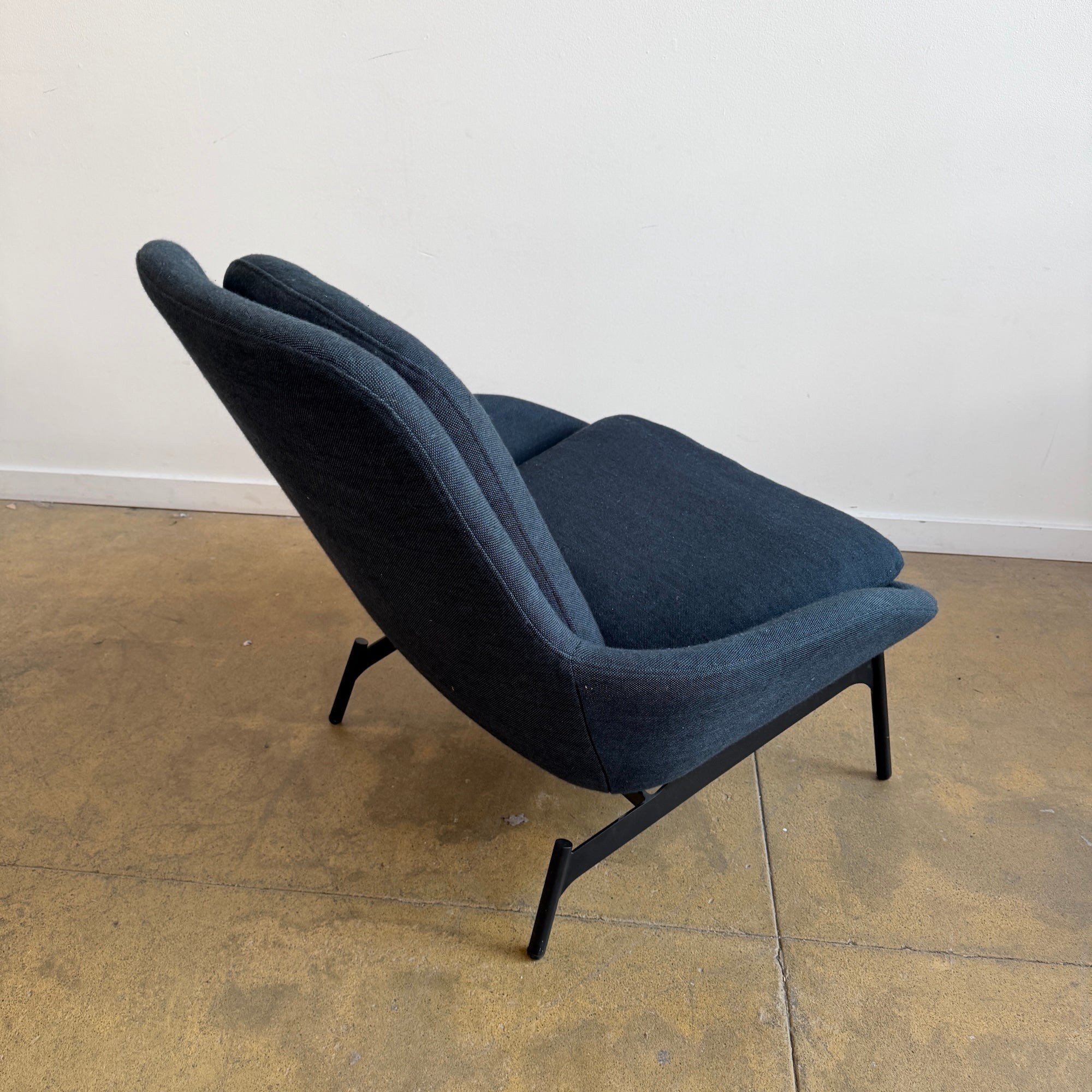 Shapely curves, a gentle recline and “just-right” cushions invite the lost art of unwinding. A sculptural powder-coated steel base sets up the striking profile. Two matching chairs are available. Price is per chair. In good overall condition.