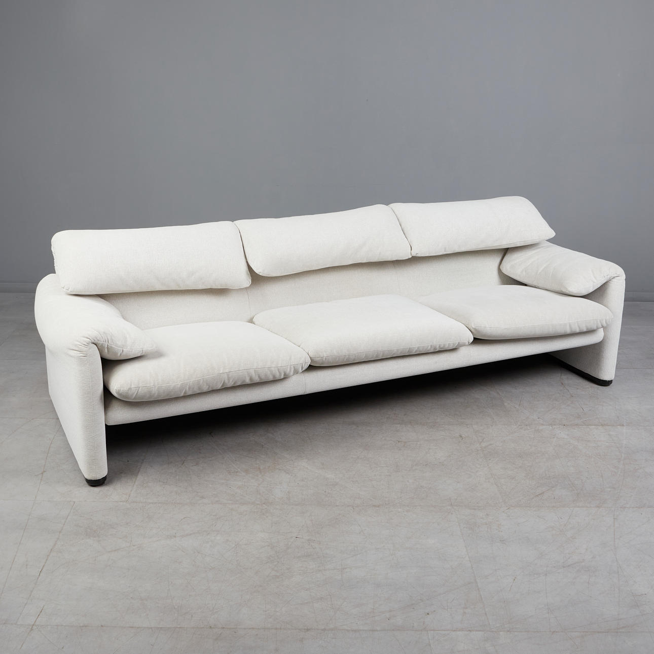 Cassina Maralunga 3-seater in a soft neutral fabric. The signature adjustable headrests fold up for full support or down for a clean low back profile. Sculpted armrests and deep seat cushions create the relaxed, inviting look that made the Maralunga an icon.