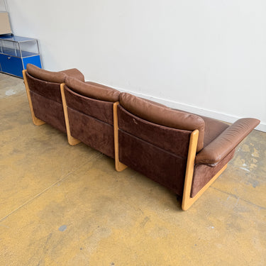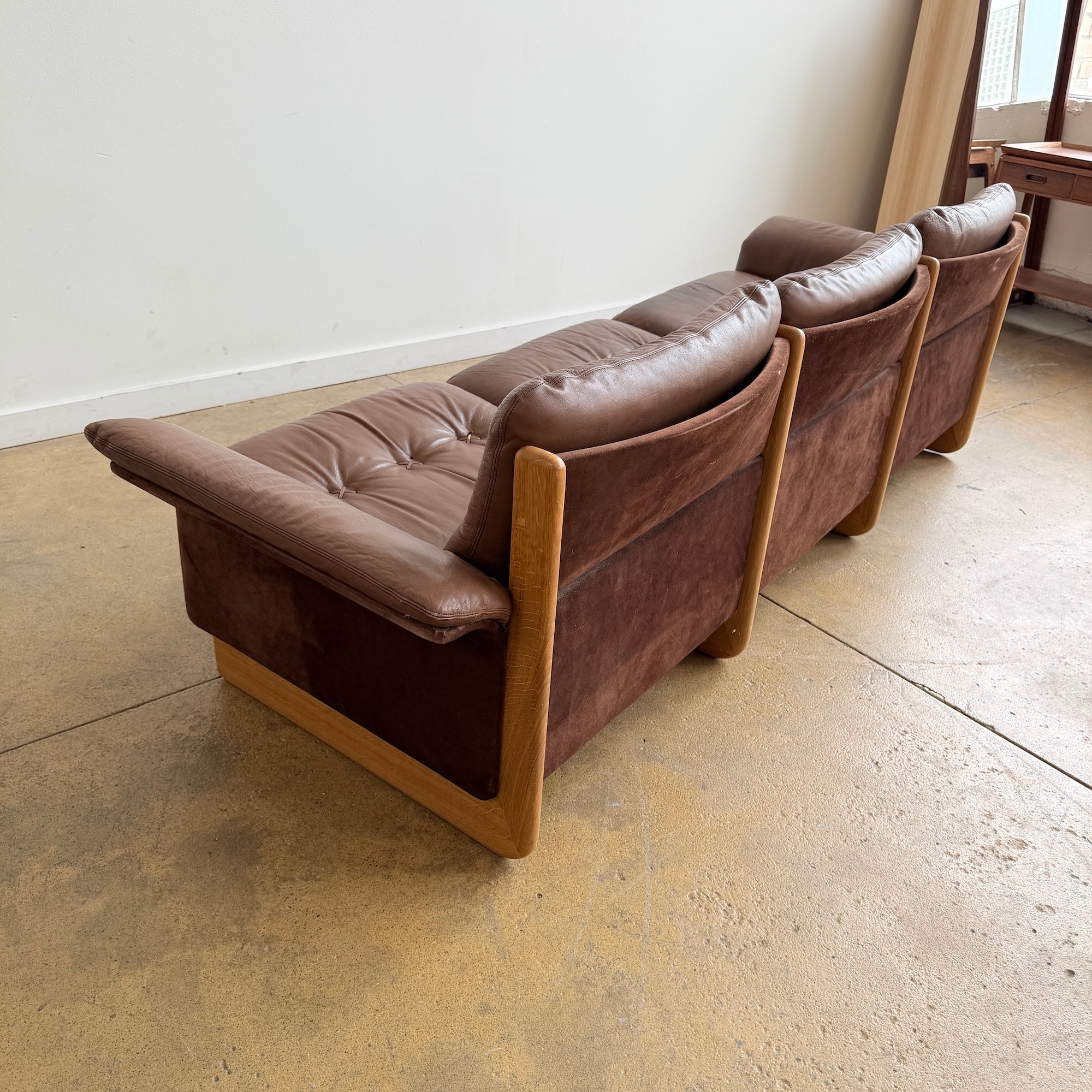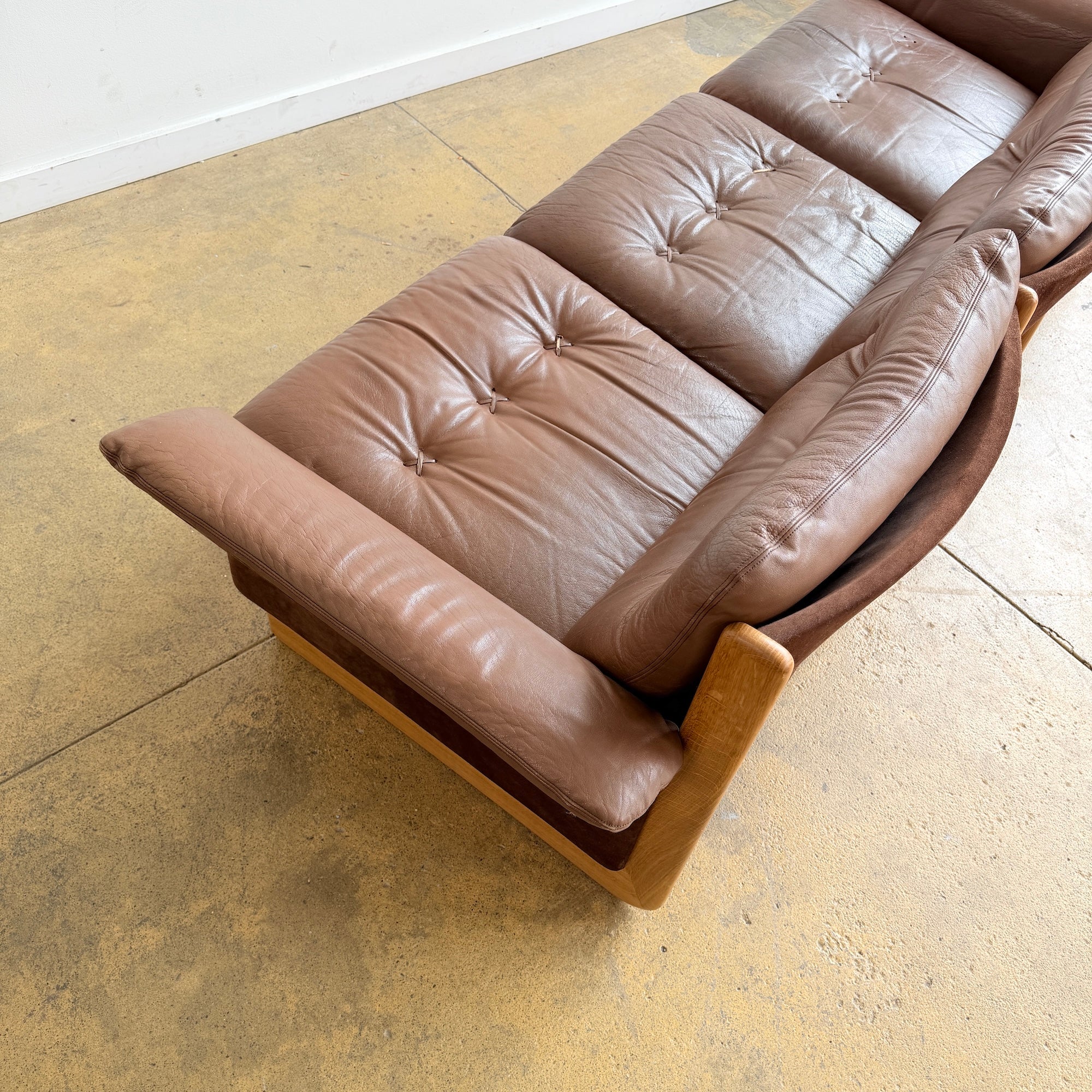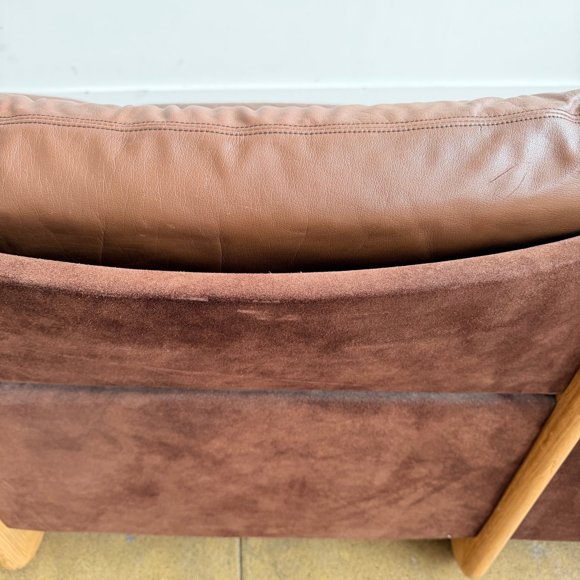 A beautifully designed Danish modern sofa by Georg Thams for A/S Vejen Polstermøbelfabrik, featuring soft leather cushions paired with suede upholstery and sculptural wooden framing. The sofa has a warm, inviting character and offers exceptional comfort, making it perfect for both modern and vintage interiors. The frame remains solid and in good condition, with attractive patina throughout. A matching chair is available and sold separately.