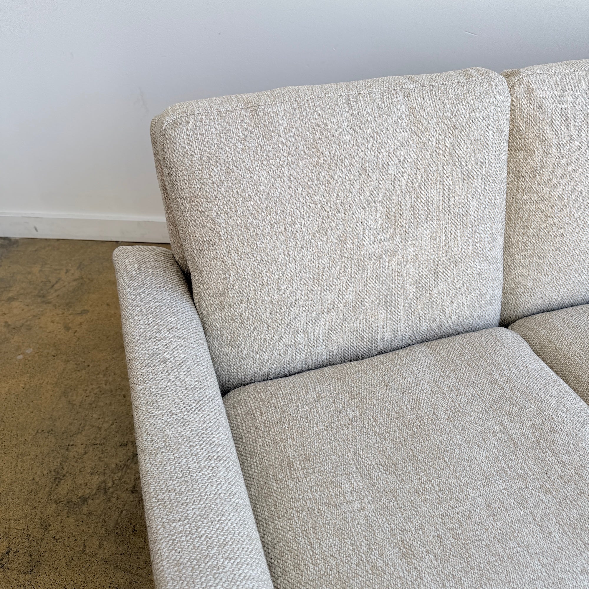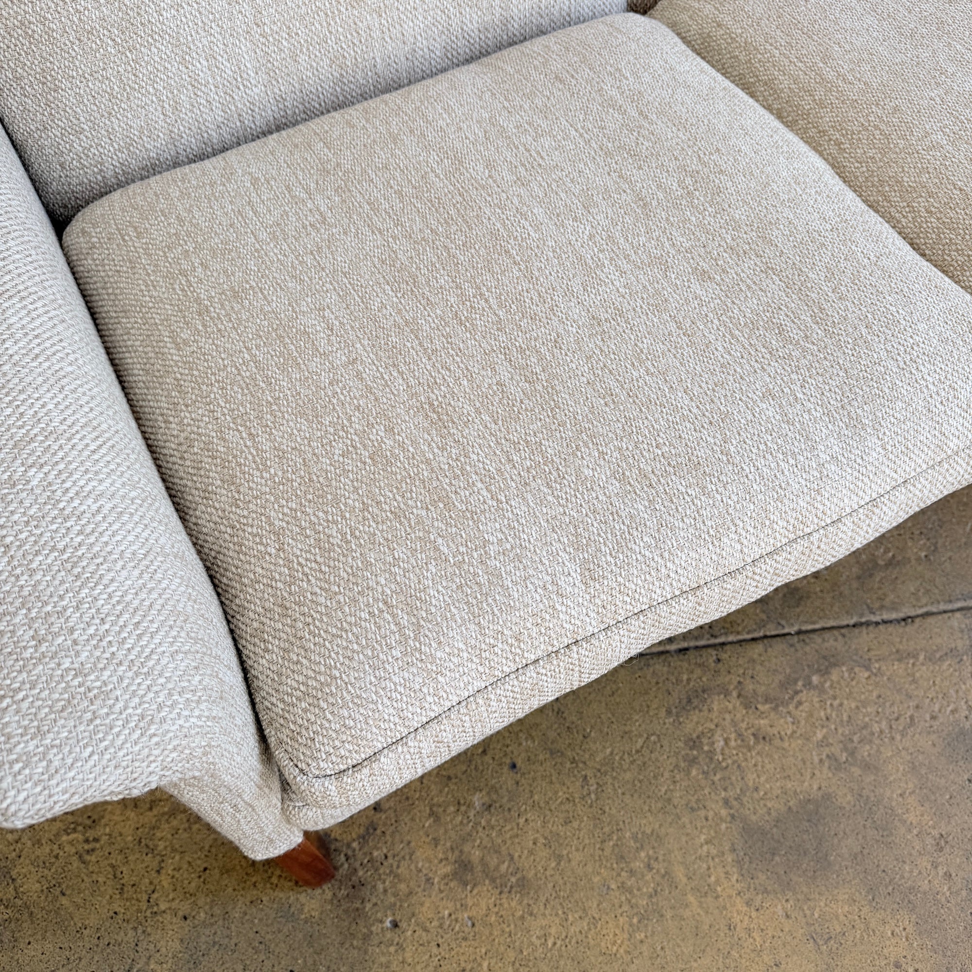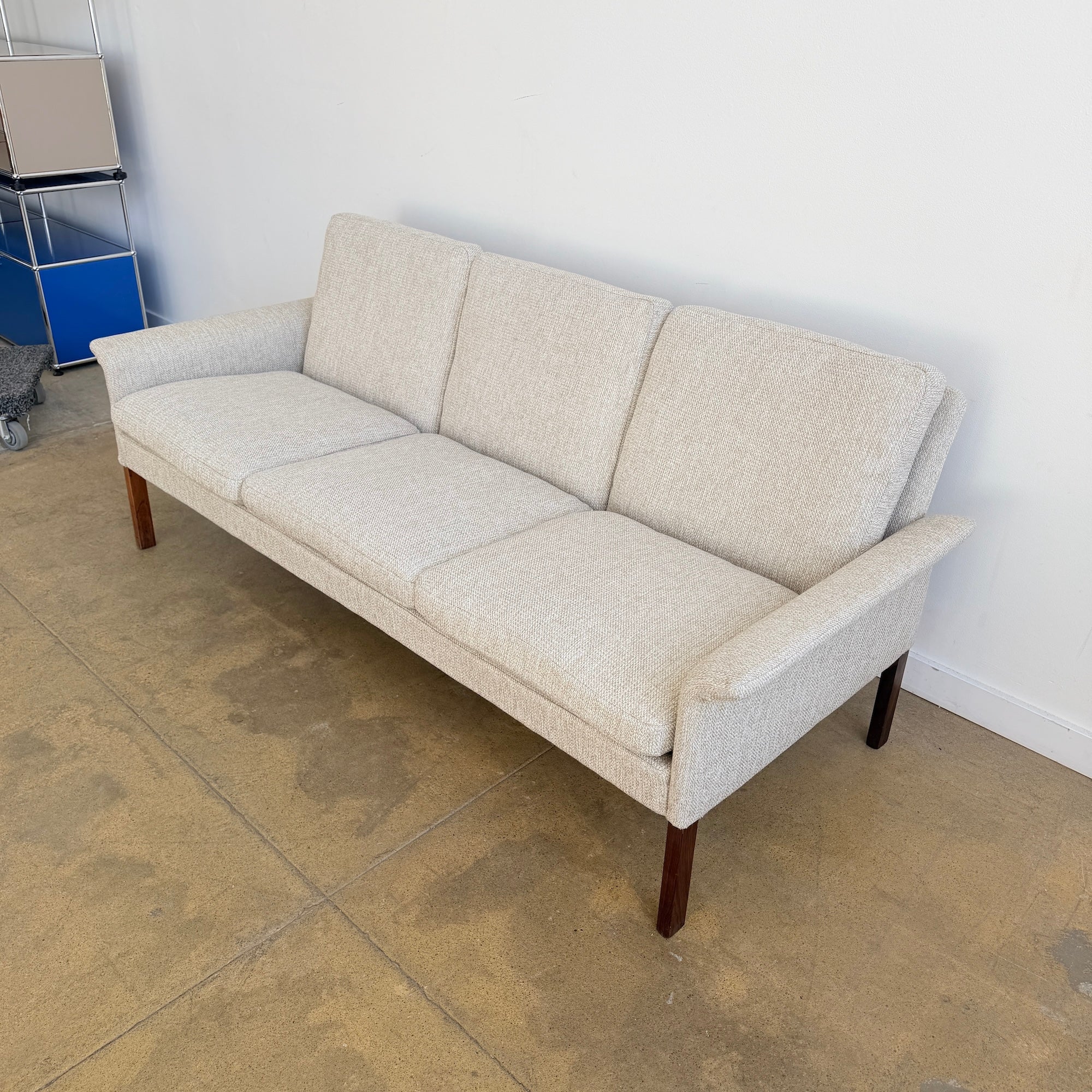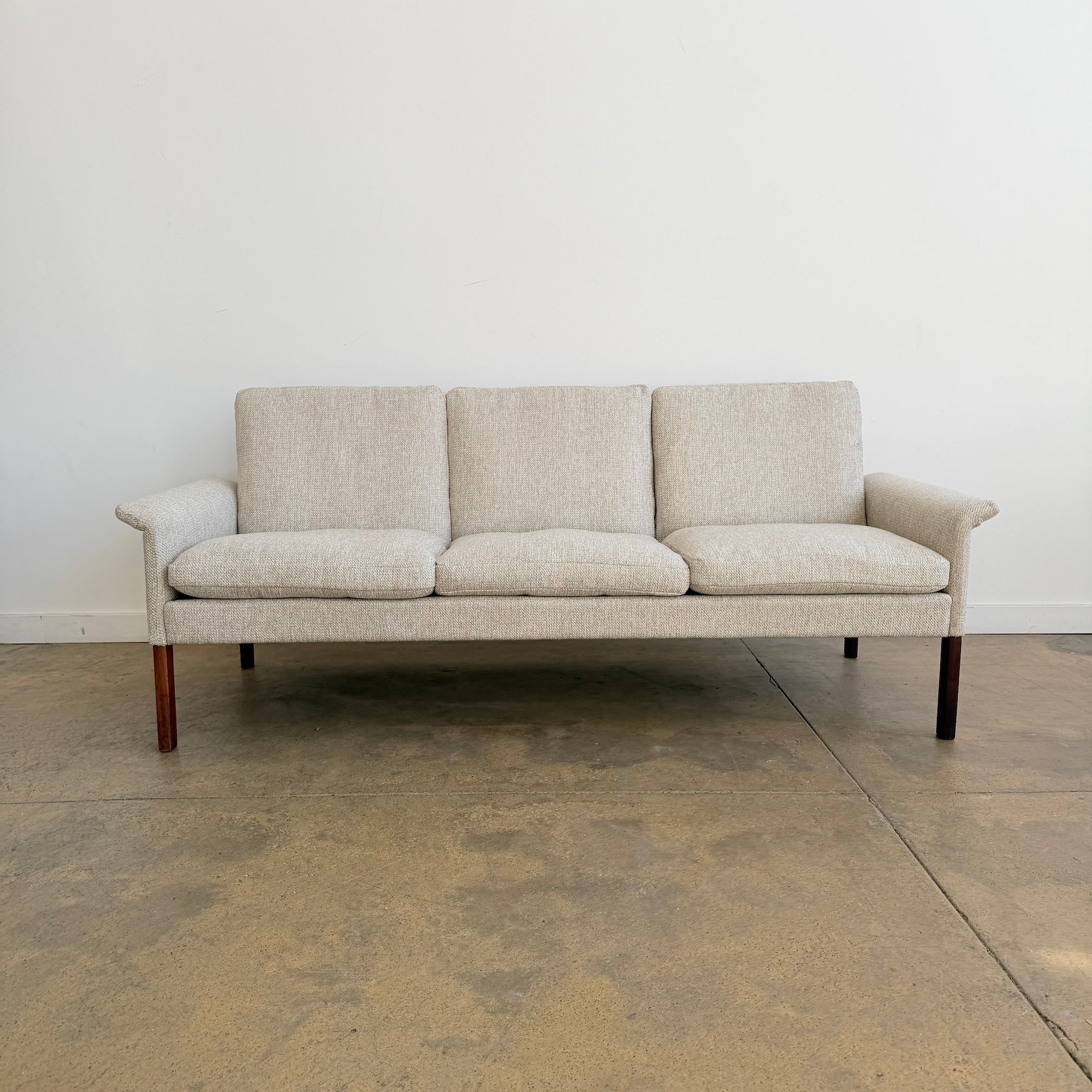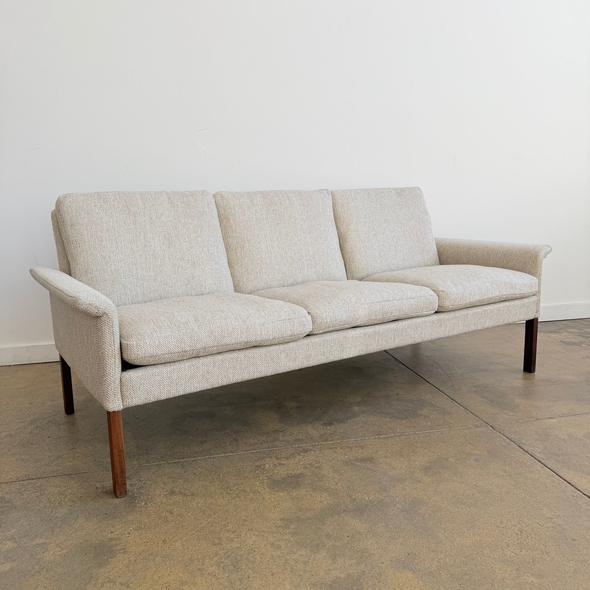 Designed by Hans Olsen for CFC in the 1960s, this Danish modern three-seat sofa features a clean, compact silhouette with sculpted arms and elegant solid rosewood legs. The frame is solid wood and the sofa has been professionally reupholstered with new cushion filling in a period-appropriate performance tweed fabric, offering a crisp vintage look with modern durability. Comfortable, compact, and well-proportioned for contemporary spaces.