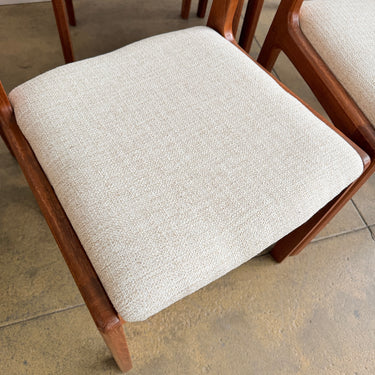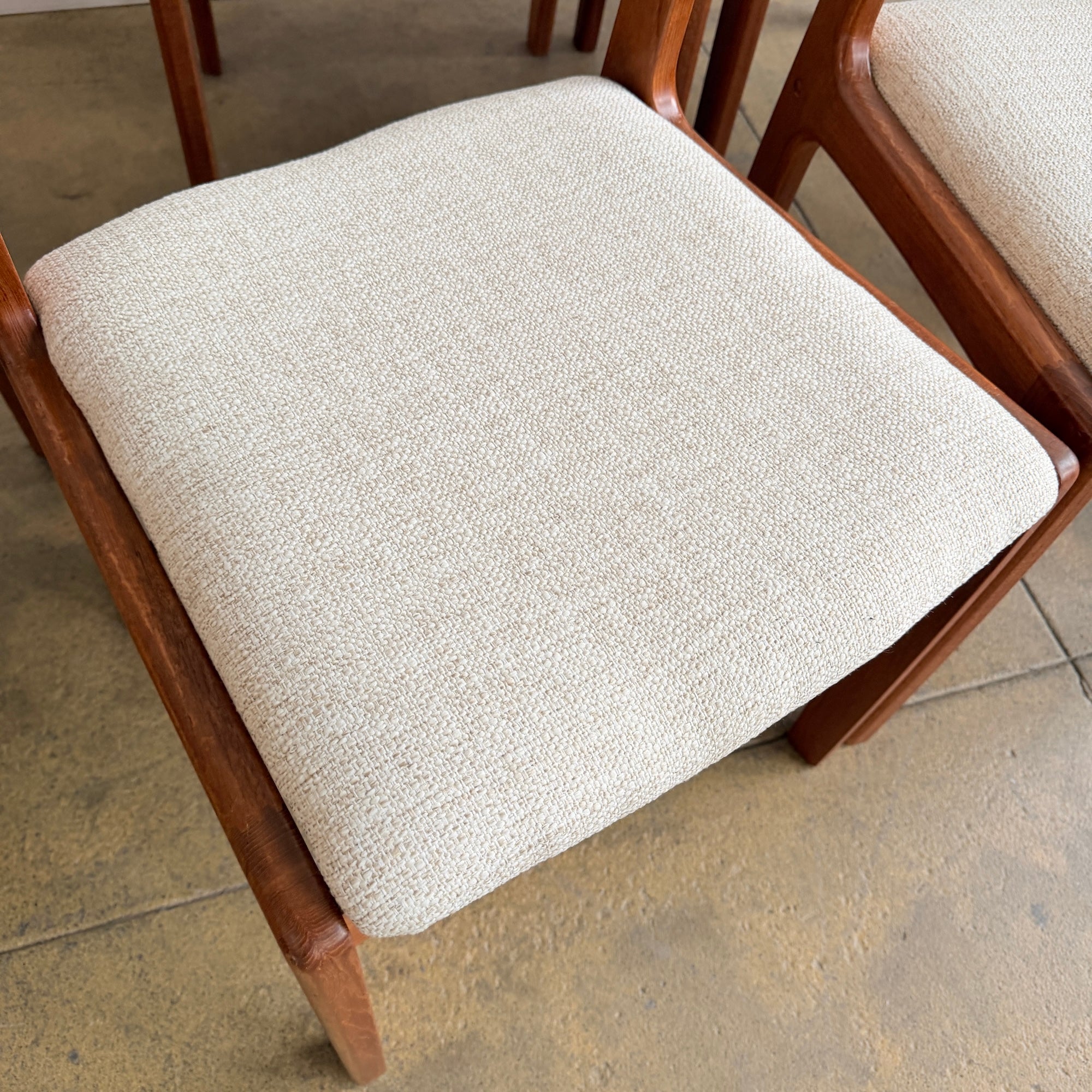 Henning Kjærnulf for Vejle teak dining chairs, a beautifully sculptural design with soft curves and solid teak frames that feel both elegant and comfortable. Frames are in very good condition with no structural damage, and the seats are newly reupholstered in performance tweed fabric.