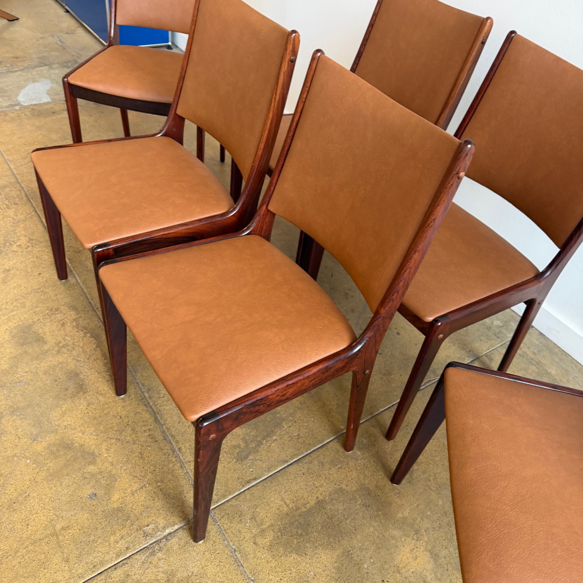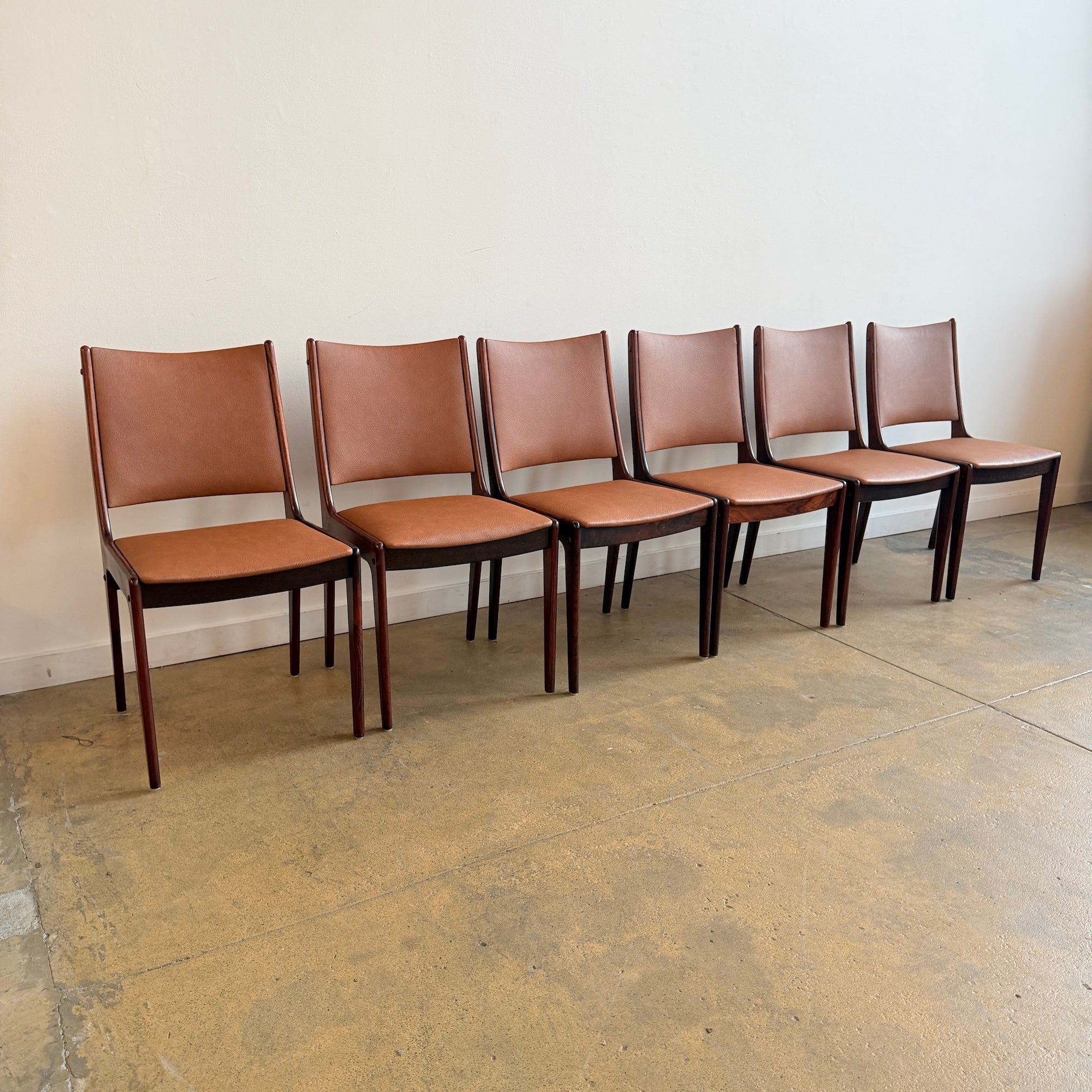Johannes Andersen rosewood dining chairs for Uldum Mobelfabrik. Elegant Danish modern design with softly curved backs and beautifully sculpted solid rosewood frames. The warm tone of the newly upholstered leather pairs perfectly with the rich grain of the rosewood, creating a refined and timeless look. Newly reupholstered in leather. Wood frames are in excellent condition with minimal signs of wear consistent with age.