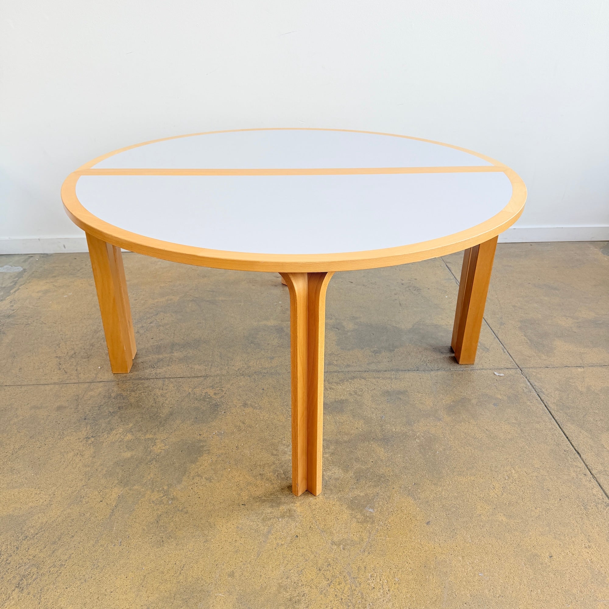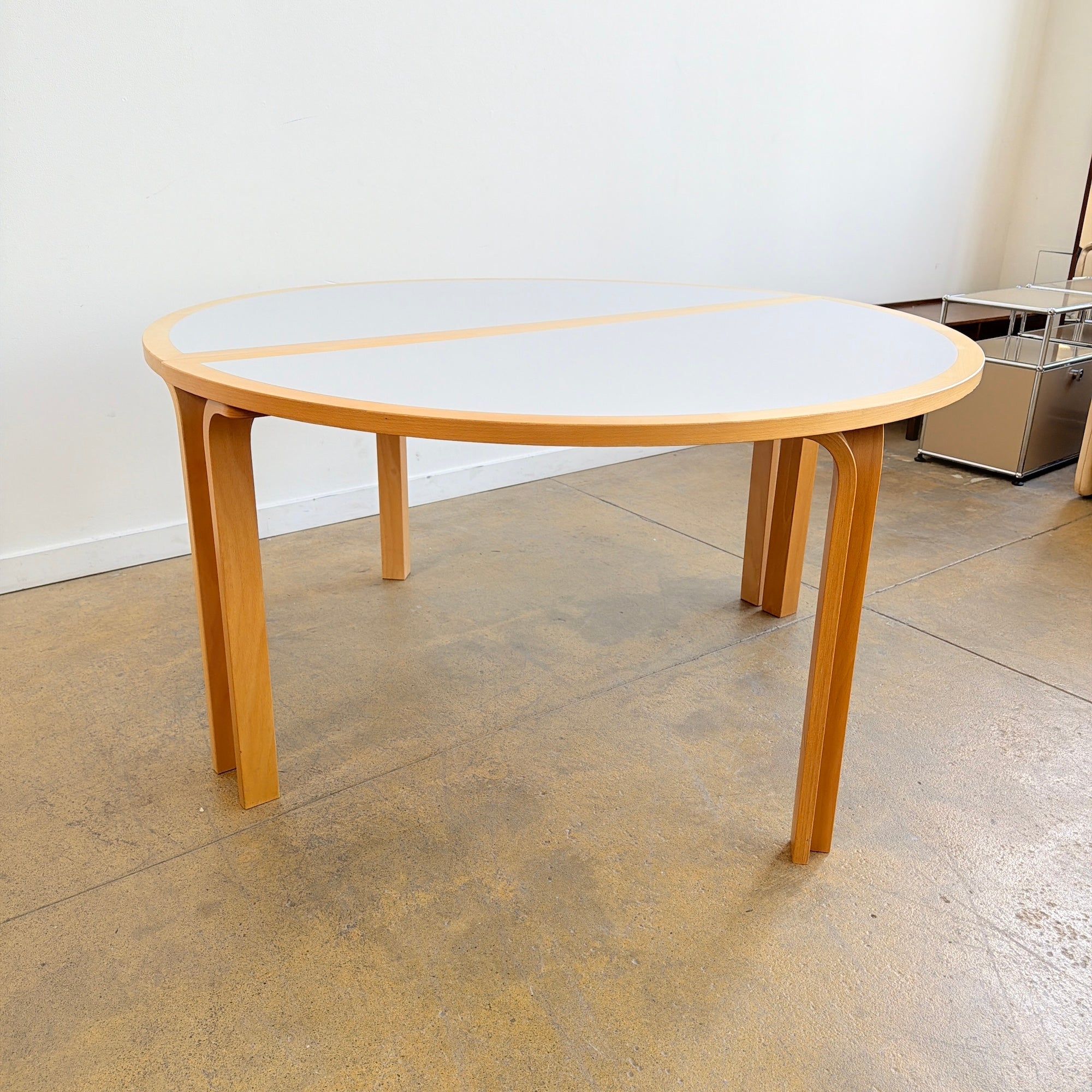 In good condition, this Danish Modern two half-round dining table by Magnus Olesen features a light grey laminate top over beechwood. The beautiful, simple Scandinavian design can be used as individual pieces or combined.