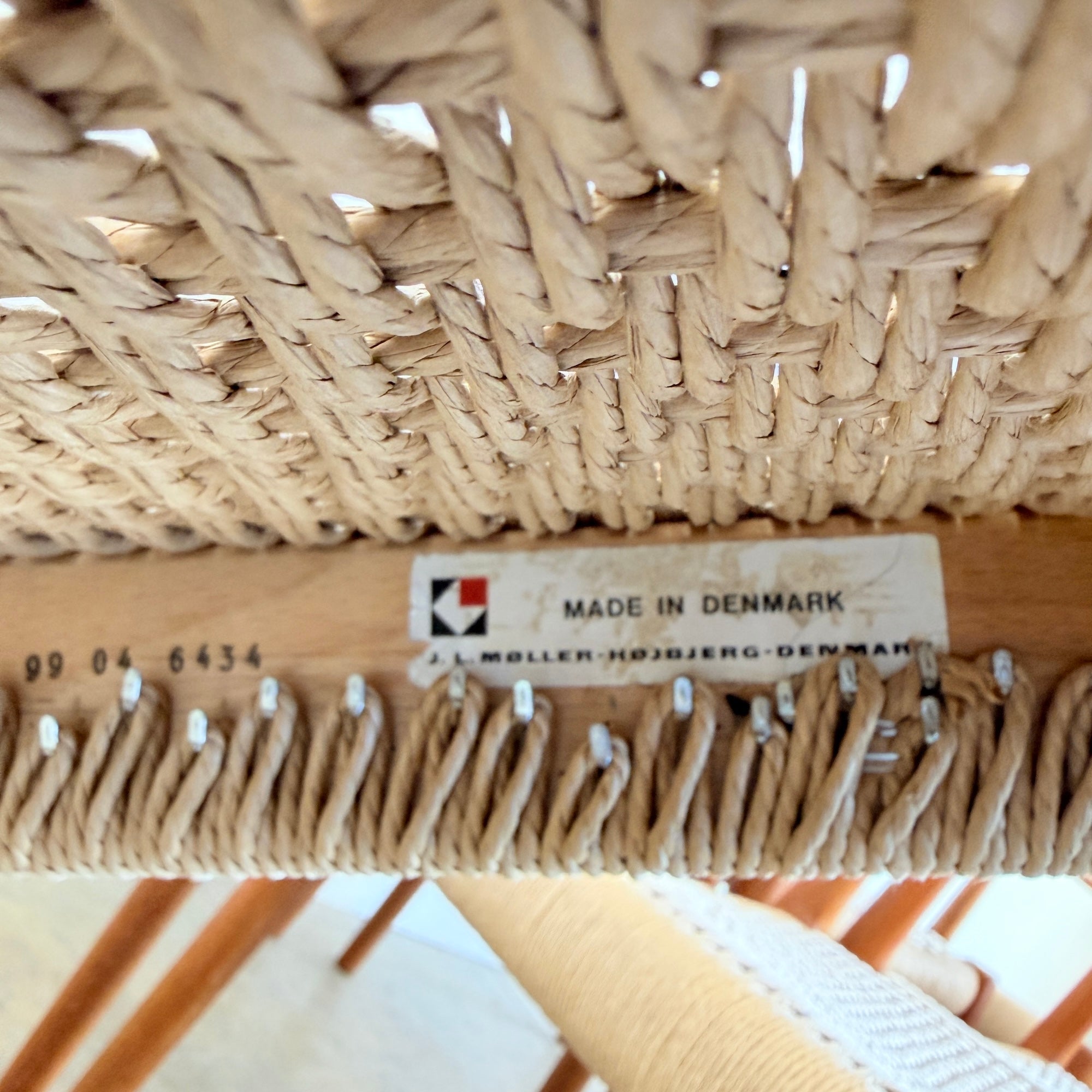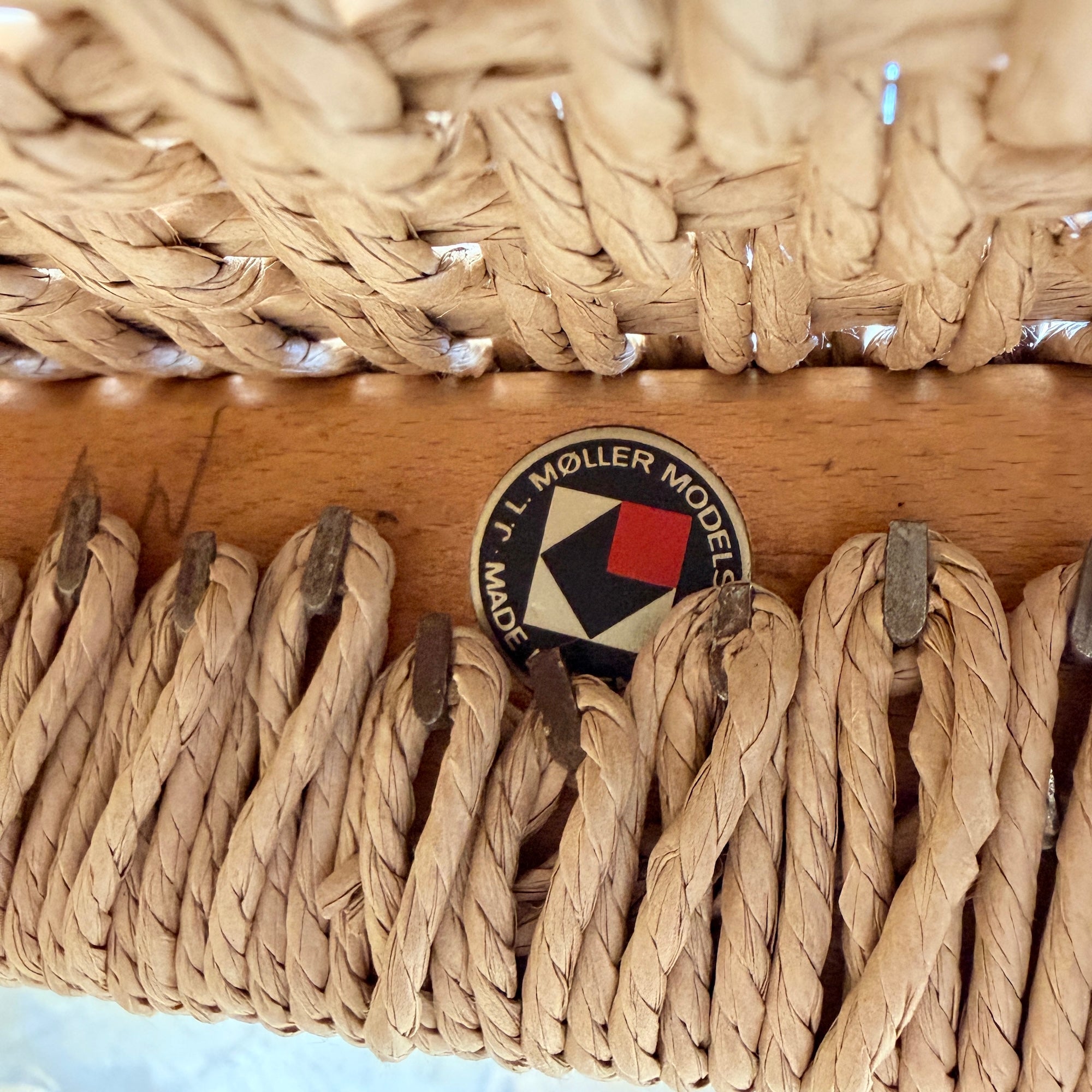 Stamped with the Møller emblem underneath for authenticity and provenance, these chairs embody the craftsmanship and timeless design that made Møller one of the most respected Danish chairmakers of the 20th century.