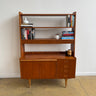 This Danish Modern Teak bookcase cabinet with secretary desk is in excellent vintage condition, with numerous book storage shelving options. It offers a wide range of storage solutions and features a built-in secretary desk.