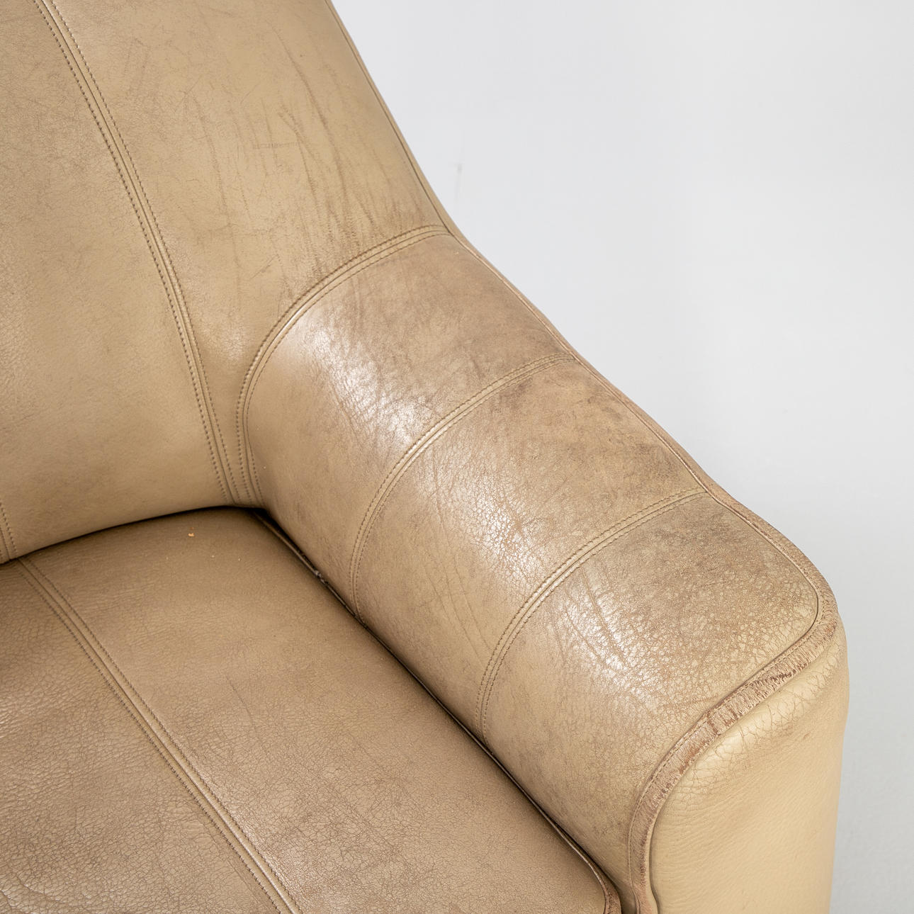 A rare mid-century DS-44, handcrafted in Switzerland and upholstered in De Sede’s celebrated buffalo “Neck” leather. This material is known for its exceptional thickness—up to 5mm—yet remains remarkably soft and supple. The natural grain, prepared in true aniline form, reveals beautiful variations in tone and texture that only improve with age.