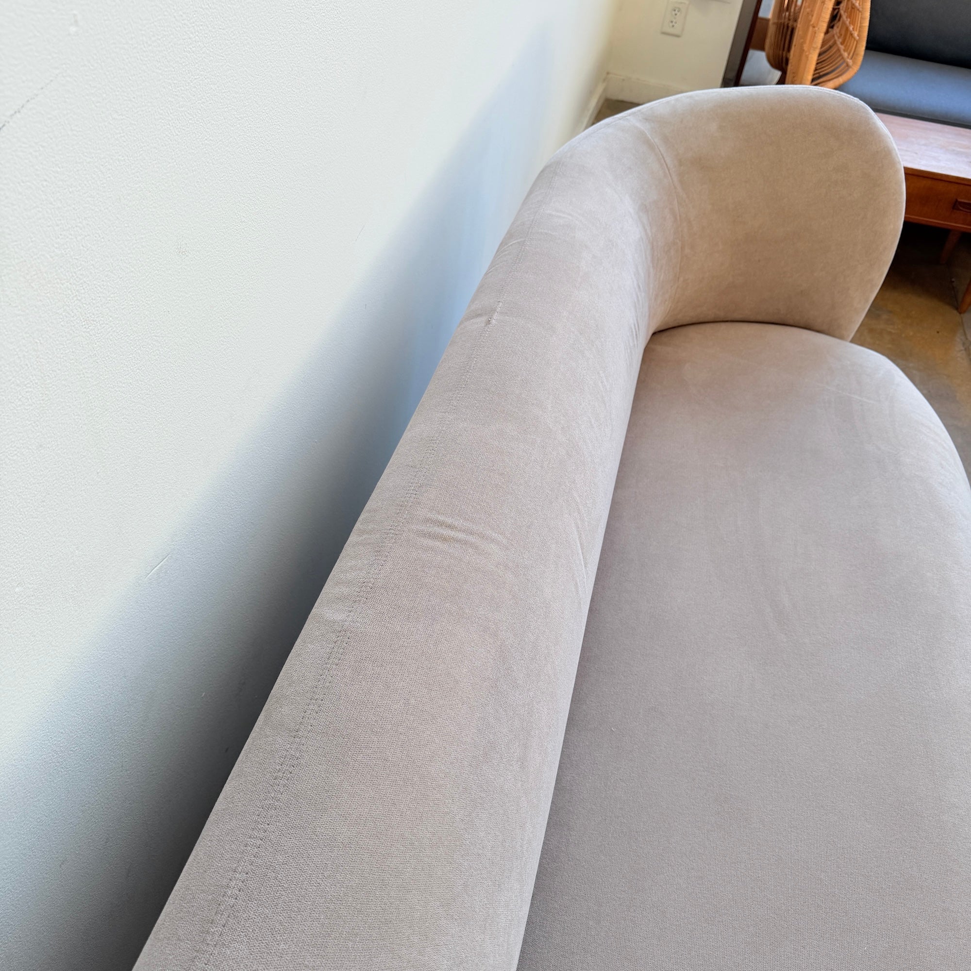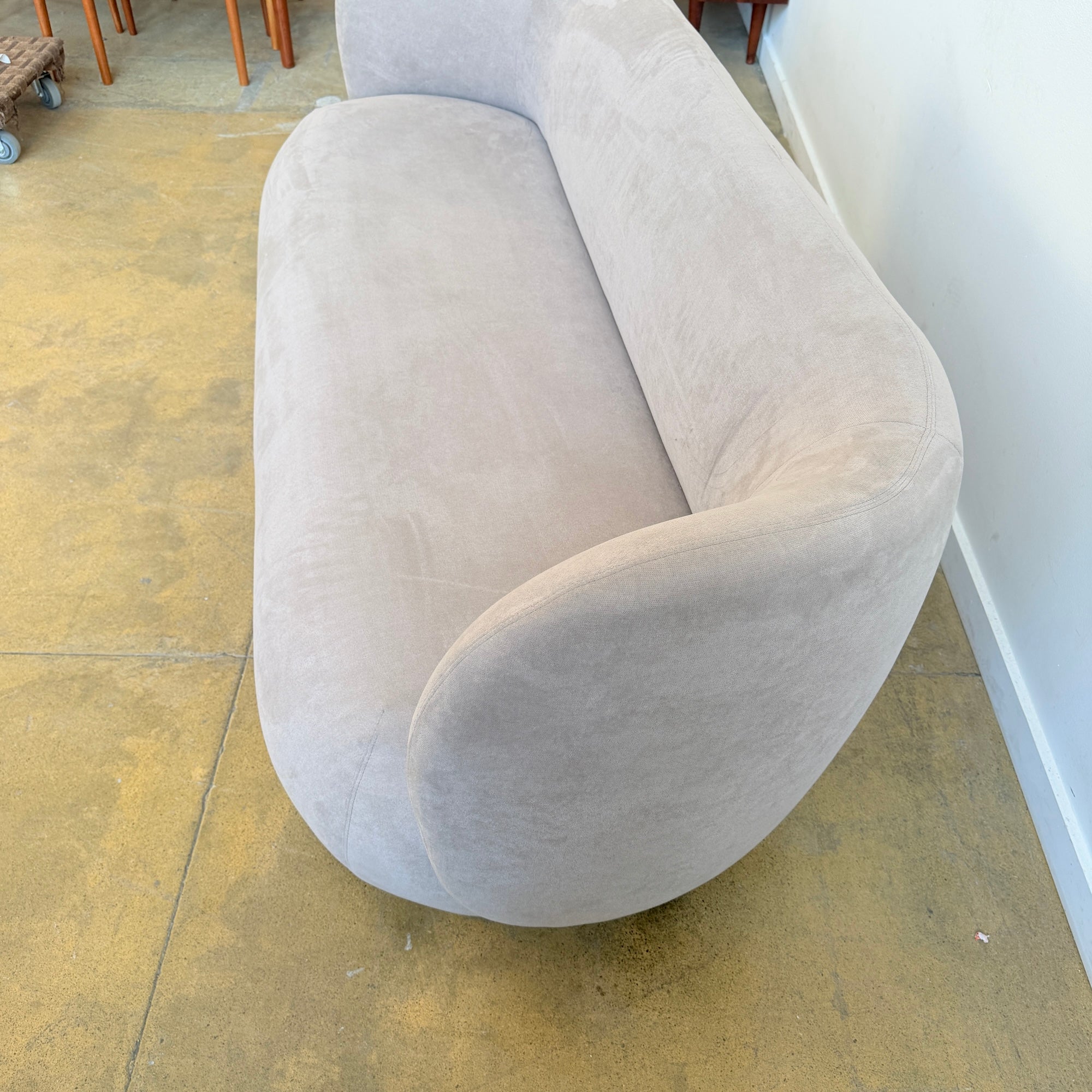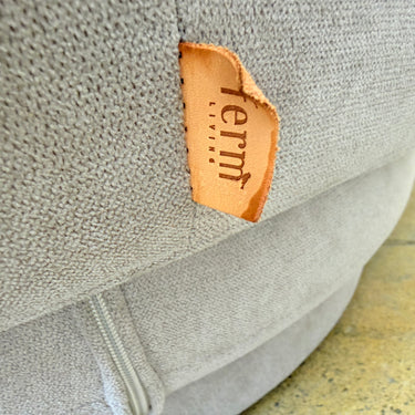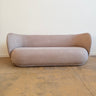 The Ferm Living Rico Sofa, 3-Seater is defined by continuous curves and a fully upholstered form that emphasizes softness and enclosure. Its deep seat and broad profile create visual weight, while the textured surface adds material depth without relying on sharp lines or visible structure.
