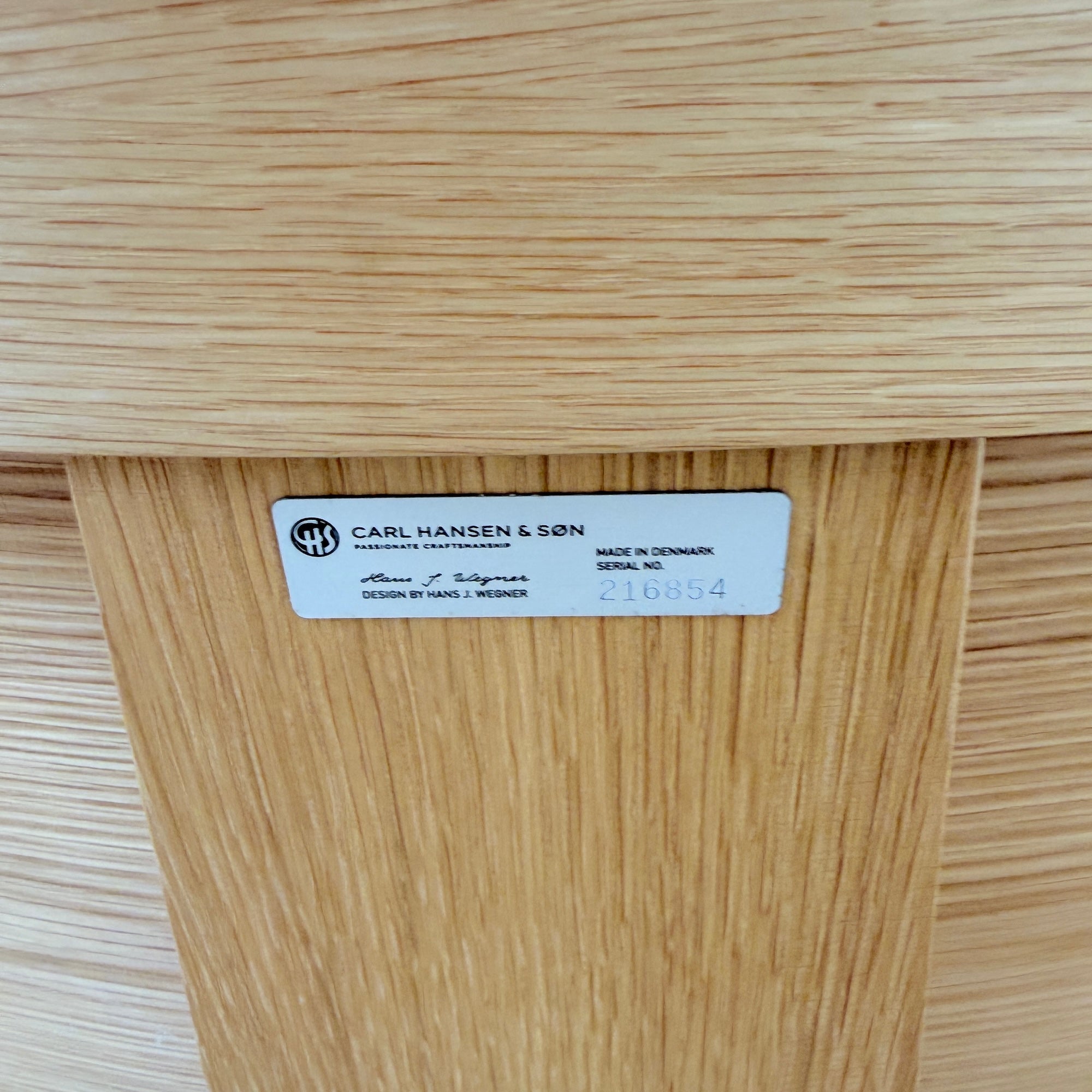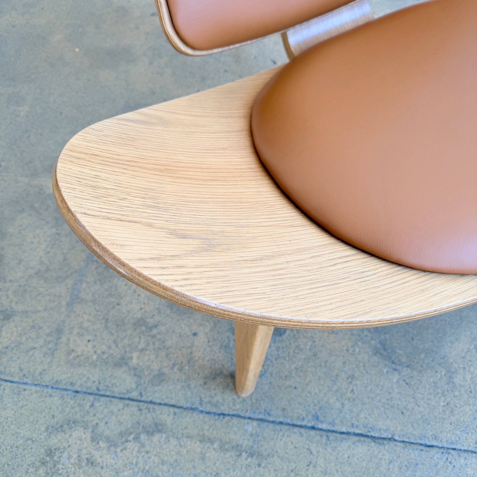 Seat and back are made of formpressed plywood shells. The 3 legs consist of a laminated construction, the 2 front legs are made of one continuous piece and the hind leg is a separate element. To enhance the comfort, Wegner has added 2 upholstered cushions which are fastened to the shell with screws from the back.