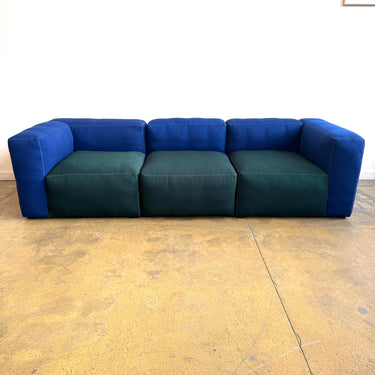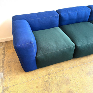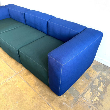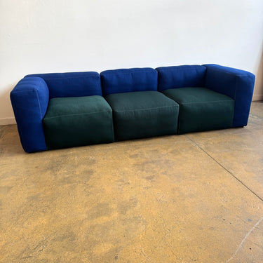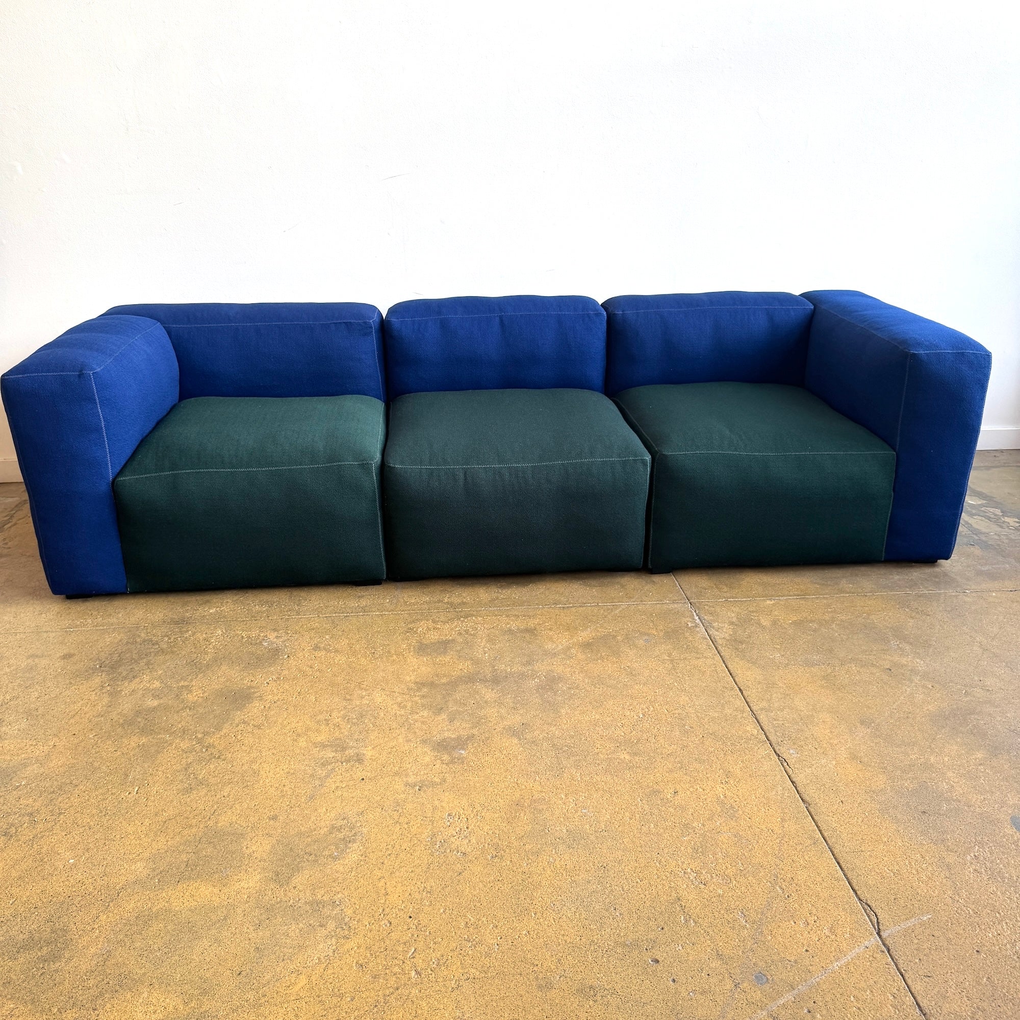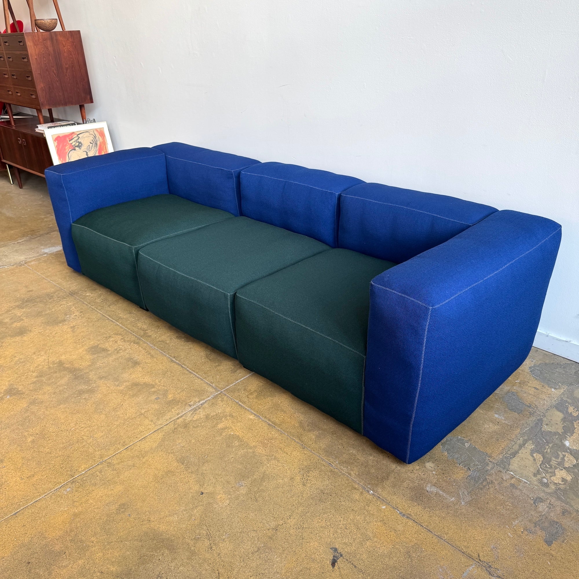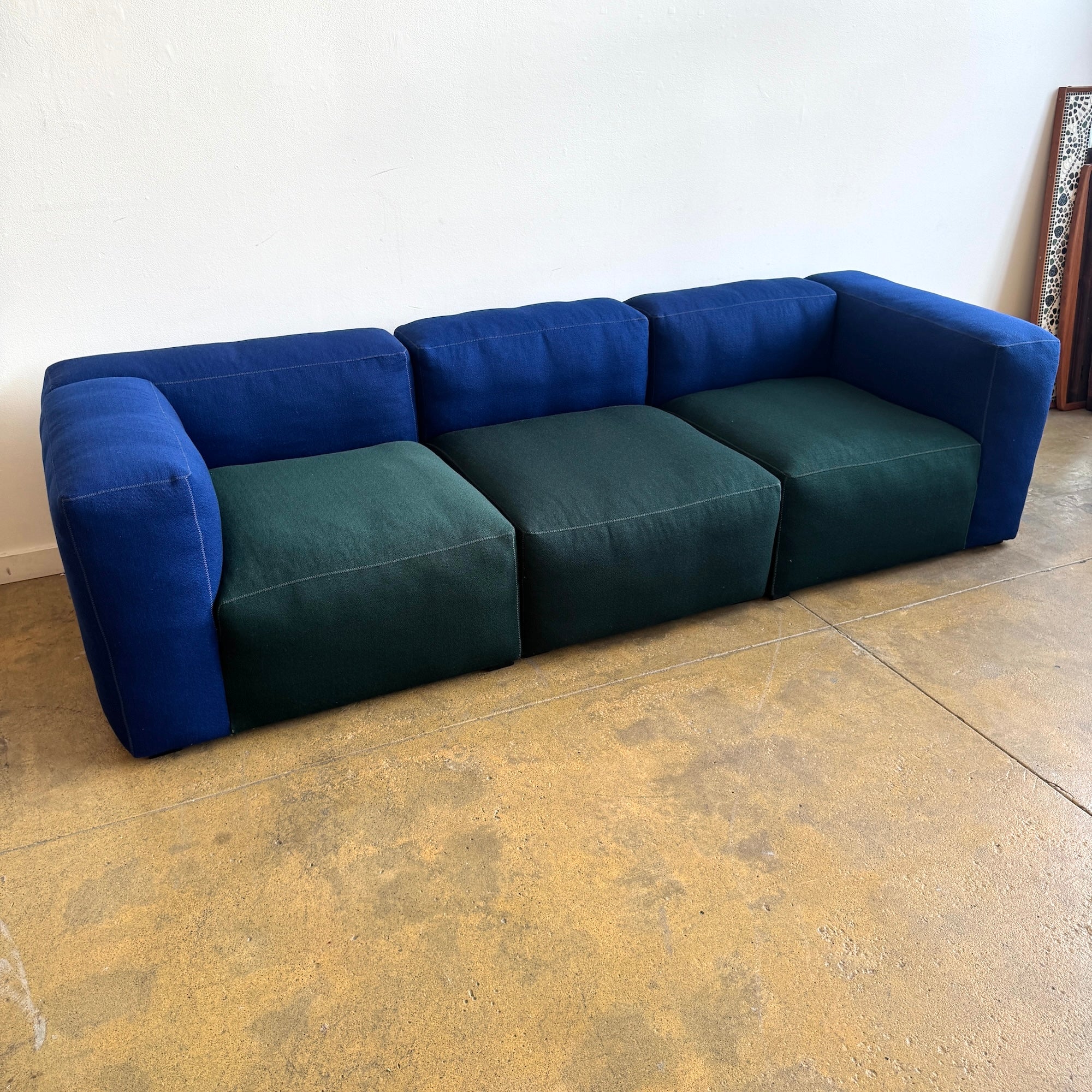 The Mags Soft Low Collection, characterized by its plush cushions and sleek low design, provides a relaxed and inviting seating experience. This sofa remains in pristine condition, having never been used in a home environment. Only removed from its packaging. It functions as a three-piece modular sofa, with the added versatility to transform into a two-piece sofa and convert the central section into a separate chair.