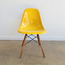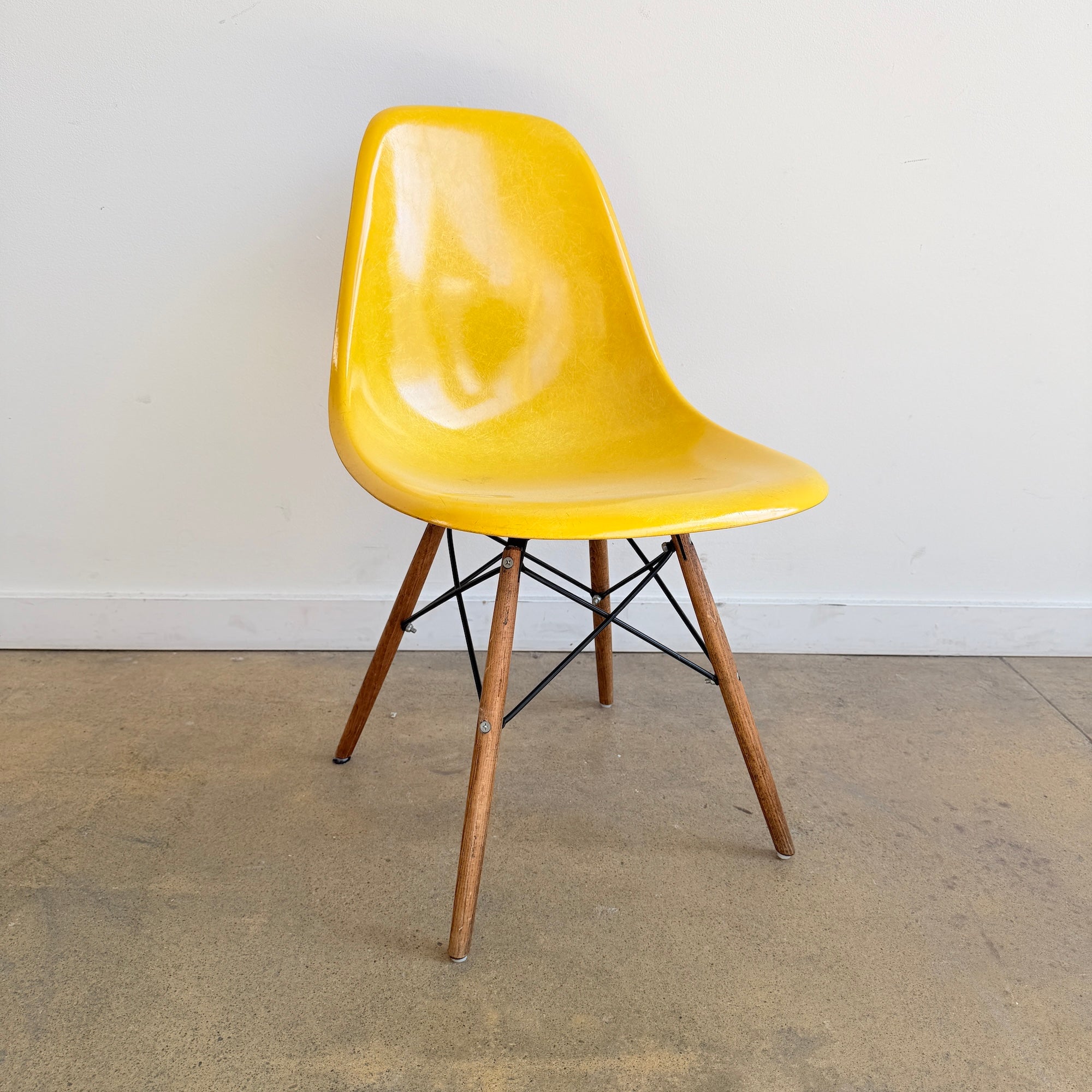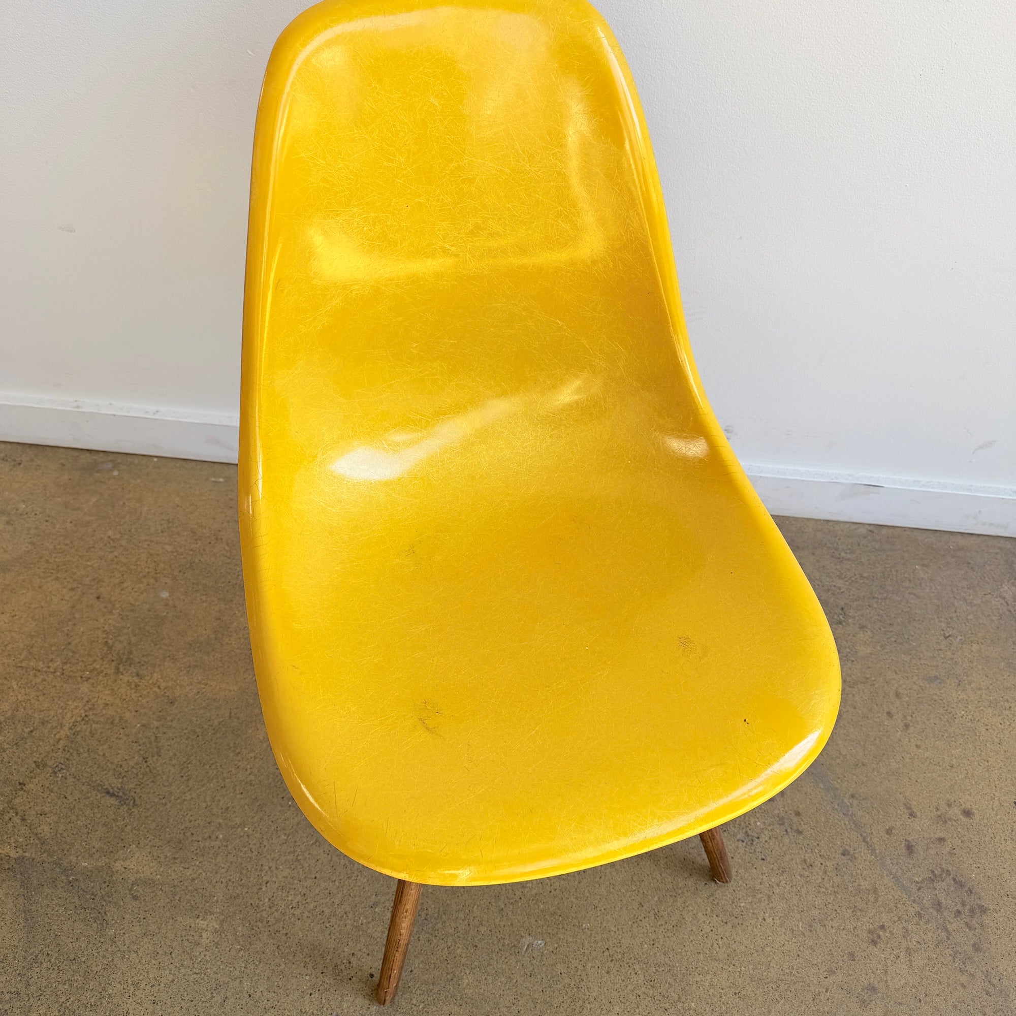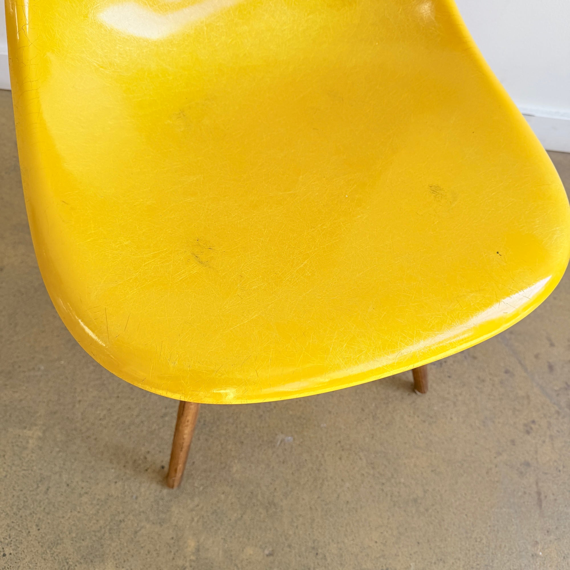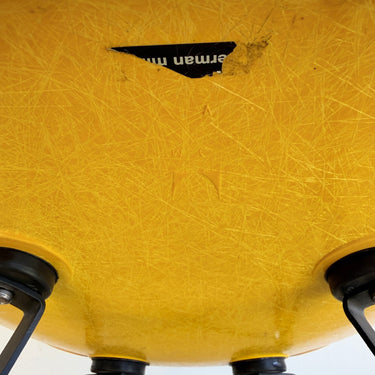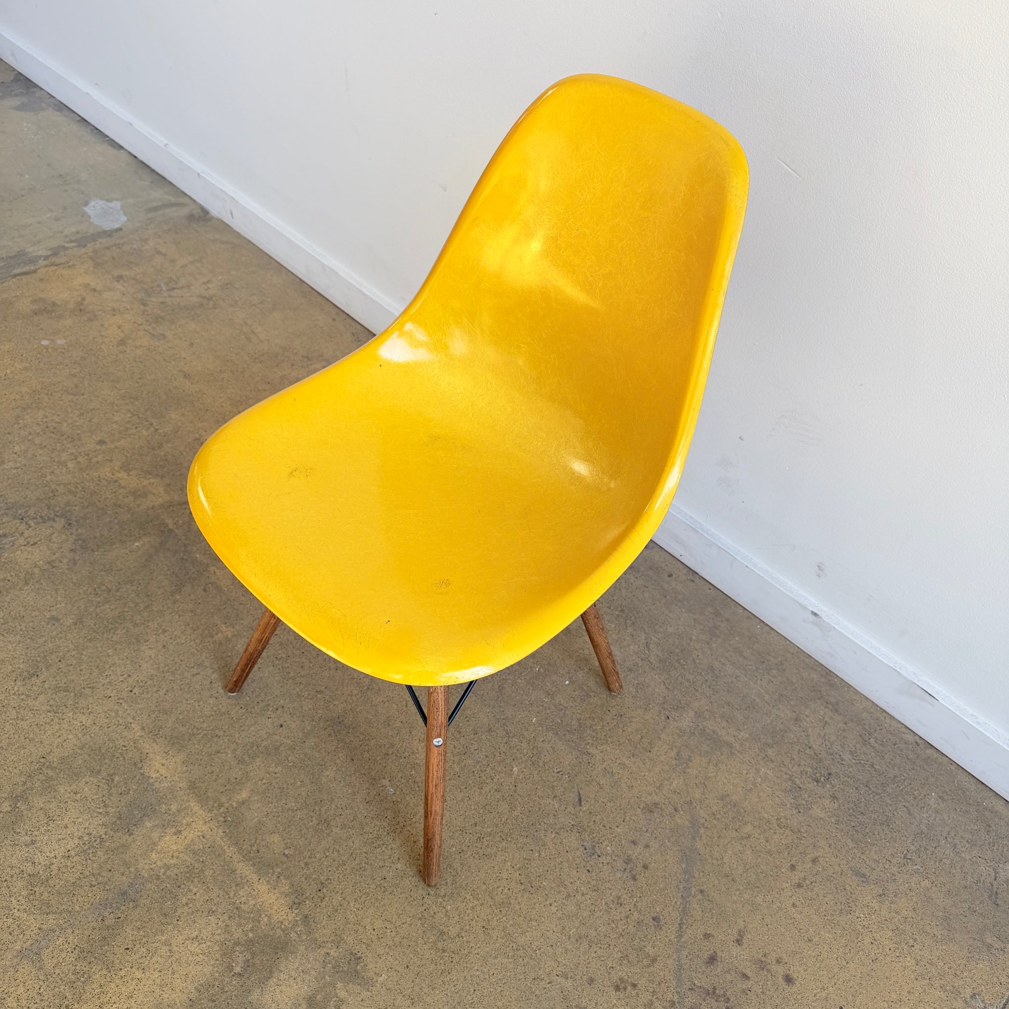 Original Herman Miller fiberglass shell chair featuring the classic dowel base with walnut legs and black cross supports. The shells show beautiful vintage patina with visible fiberglass texture and depth of color. All chairs retain the Herman Miller stamp underneath. In good condition with light wear consistent with age.
