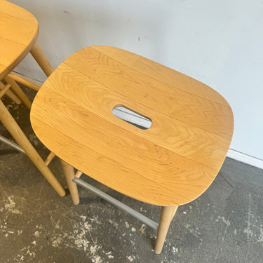 o stool is similarly of 3d machined solid wood and the stool mid and high have painted steel tube footrests. the handle, consisting of an elongated hole machined through the centre of the seat is shaped for maximum comfort when carrying the stool. it is also a familiar typology revitalised with improved comfort and new materials.