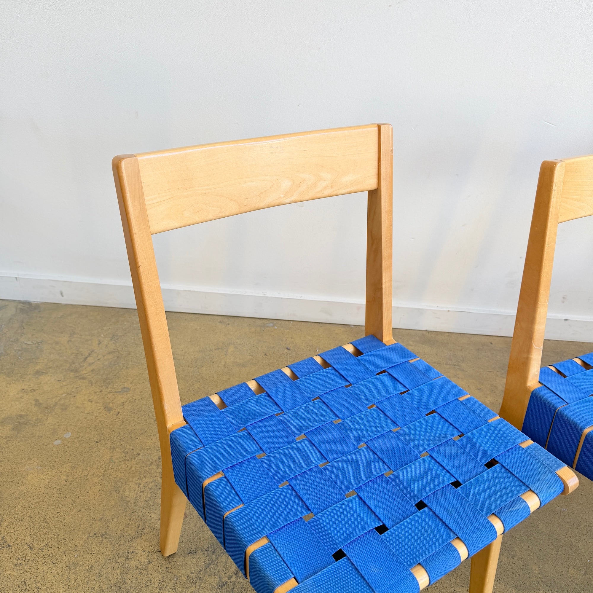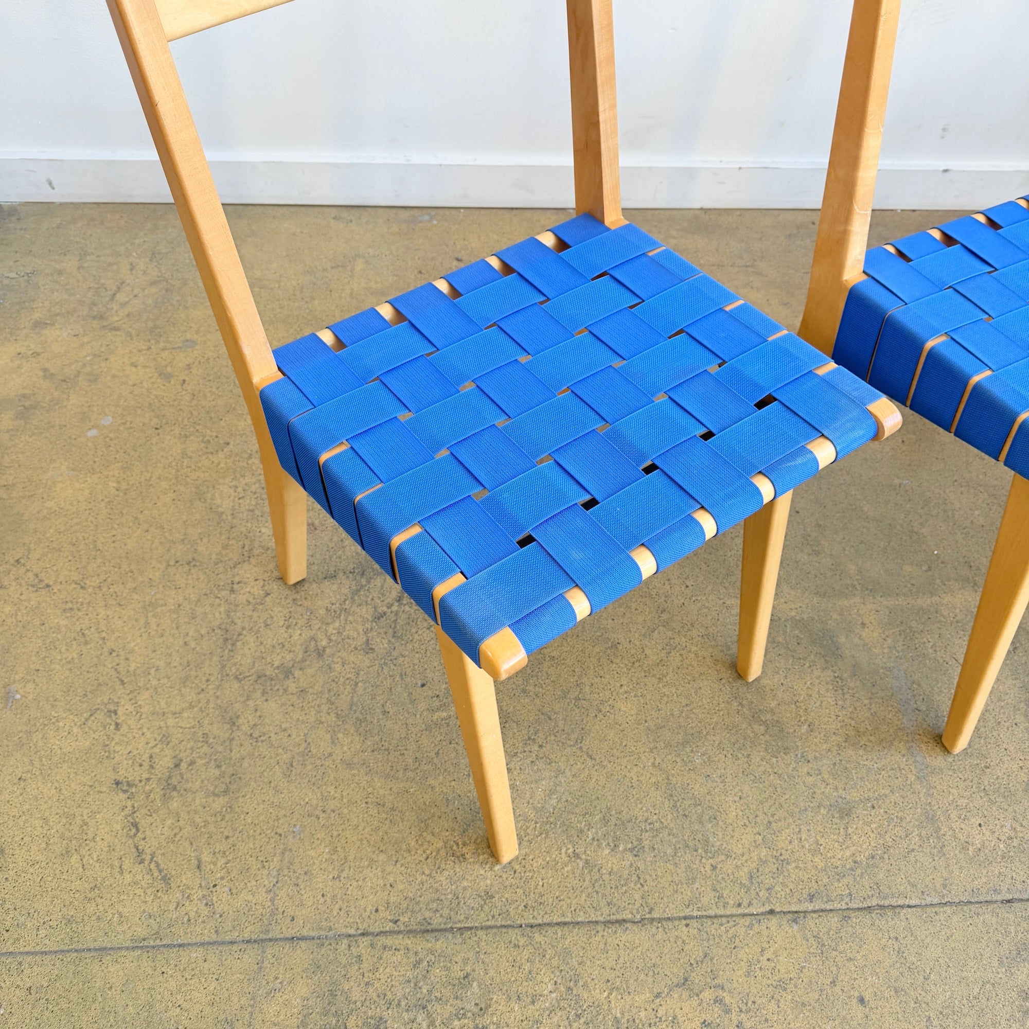 Jens Risom's designs were the first pieces conceived for and manufactured by Knoll. Due to wartime material restrictions, the side chair was originally constructed of simple maple frames and discarded parachute webbing. Described as good, honest furniture design, the collection helped establish Knoll as an early source of modern design in America.