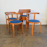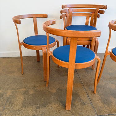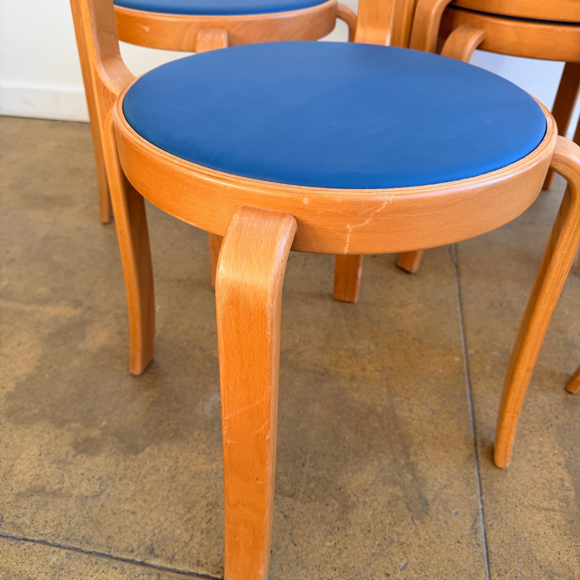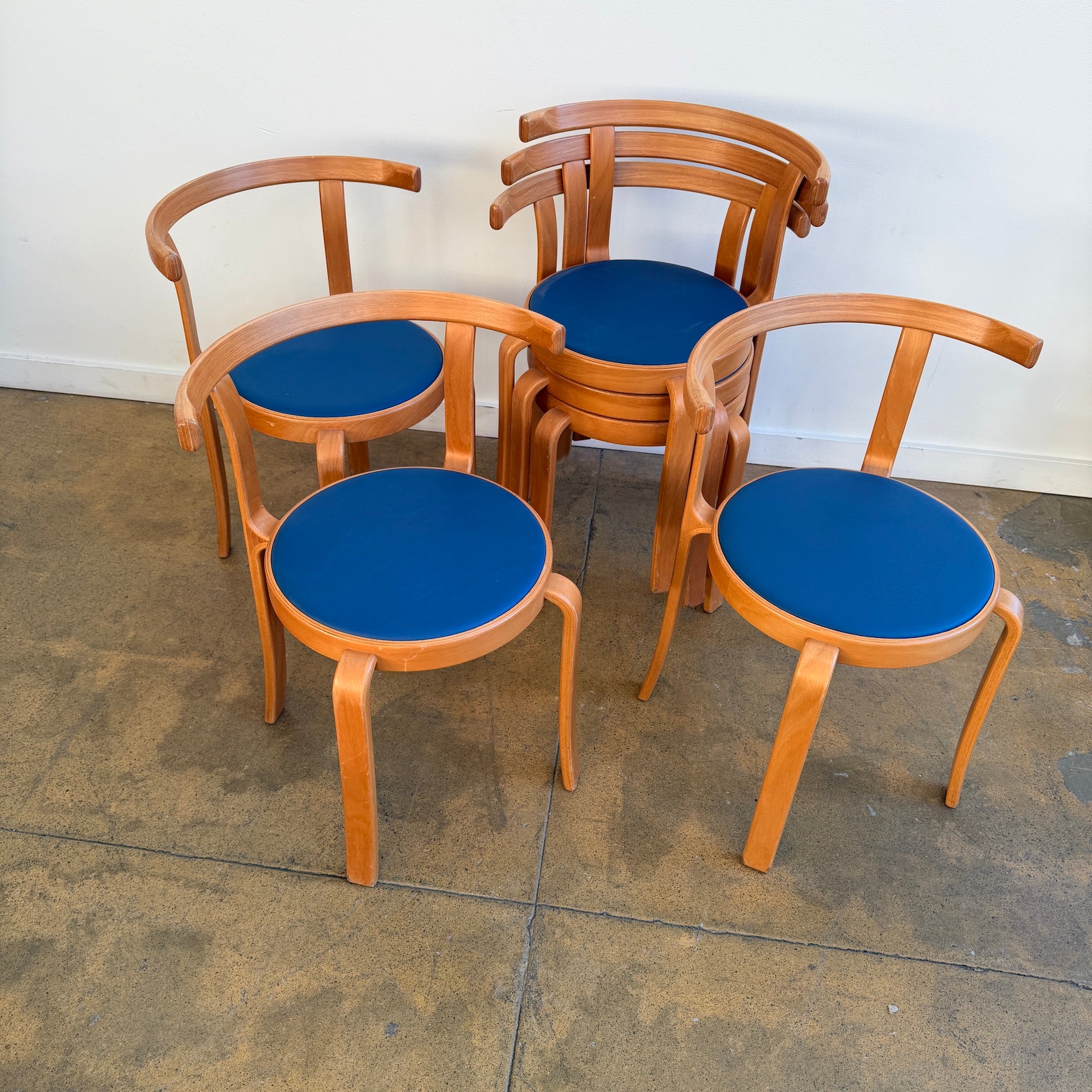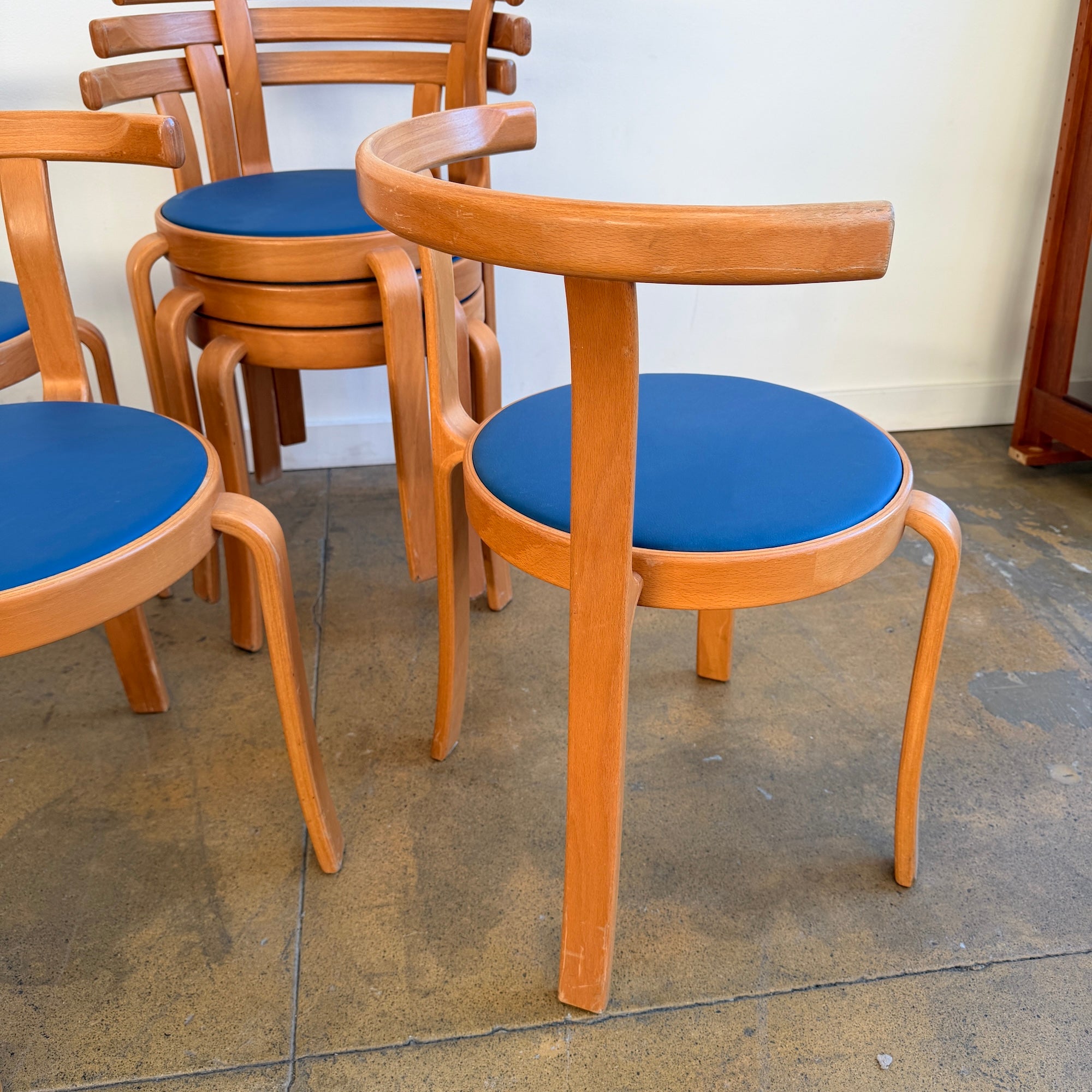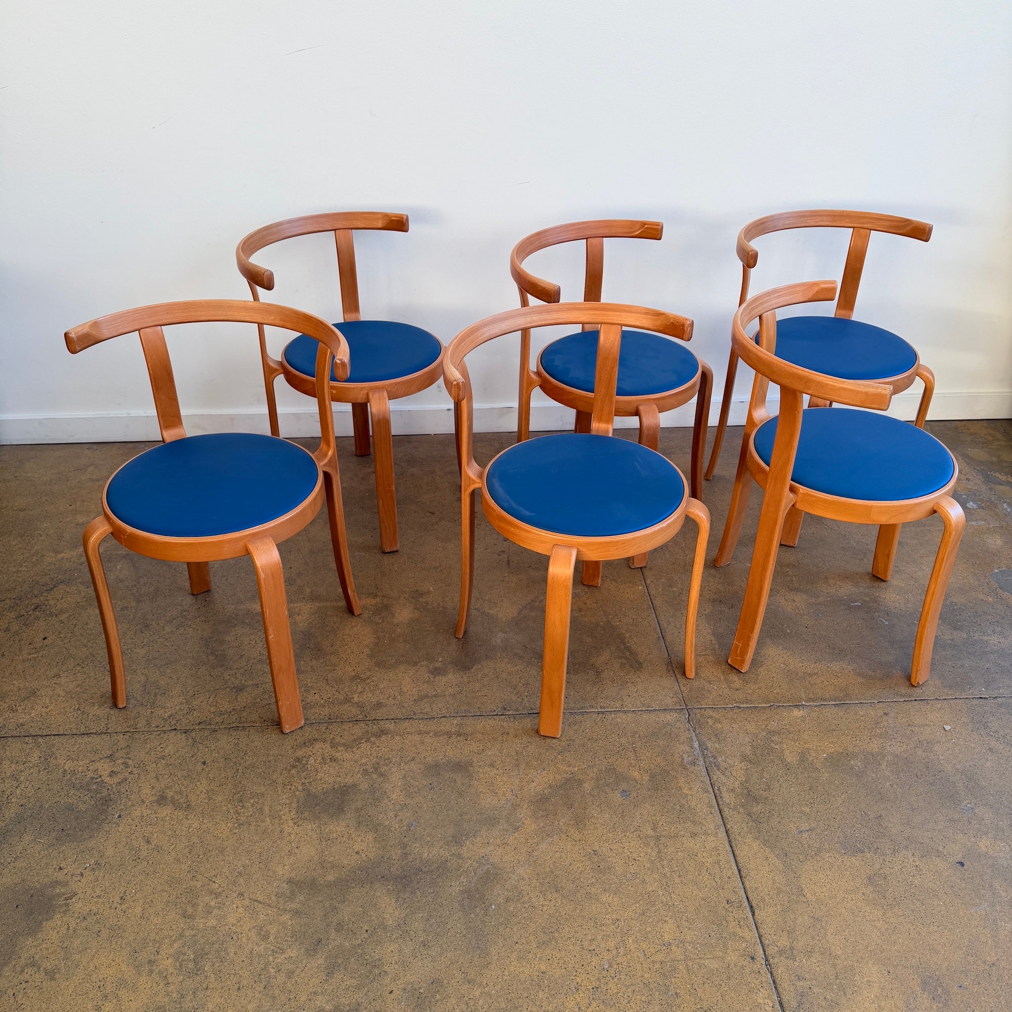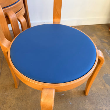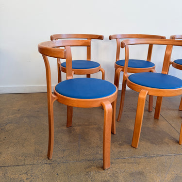 Iconic Danish modern chairs designed by Rud Thygesen and Johnny Sørensen for Magnus Olesen. Featuring sculptural bentwood frames and round upholstered seats. Overall in good vintage condition. Seat is recently upholstered in knoll high grade vinyl leather. Frame has light scuffs and scratches consistent with age and use.