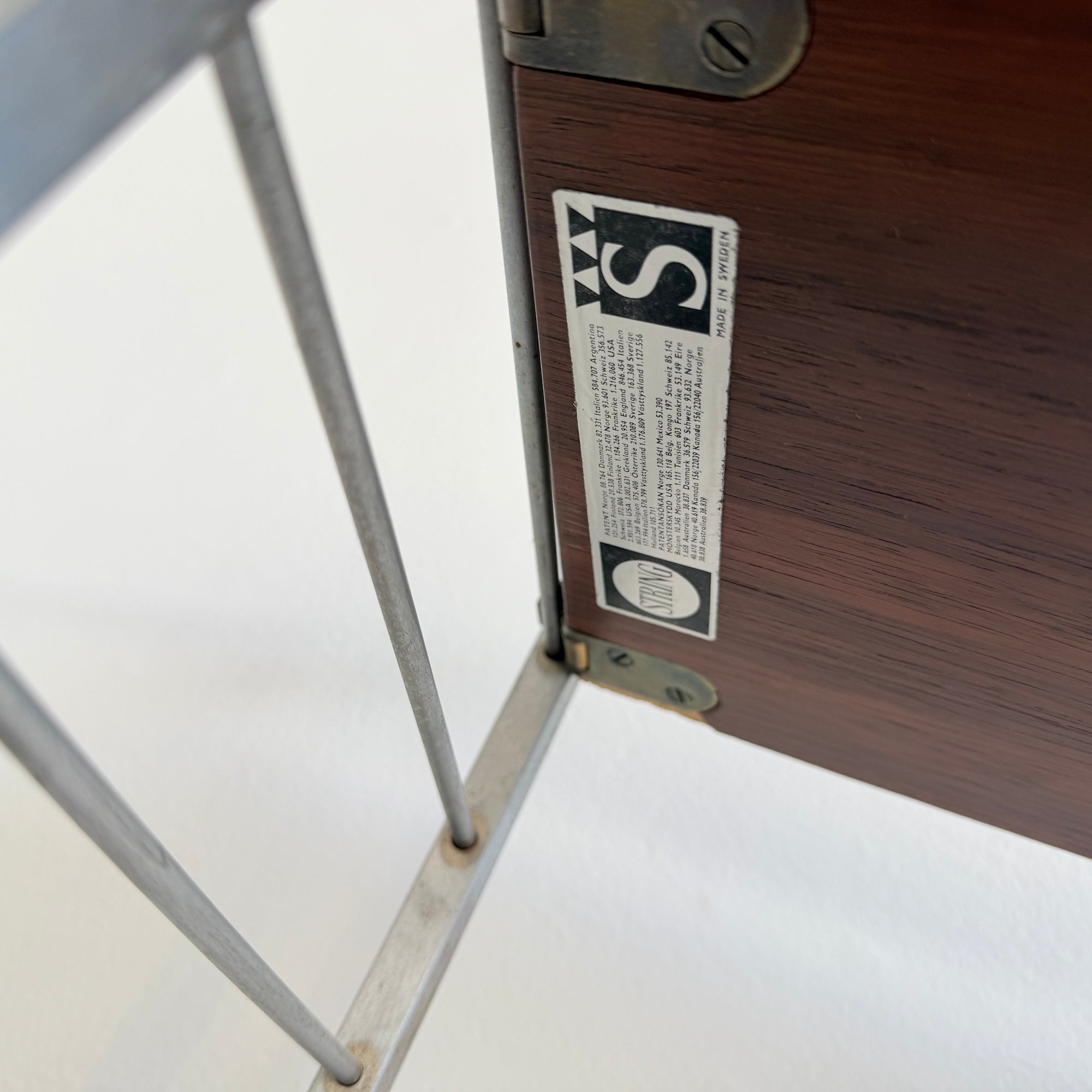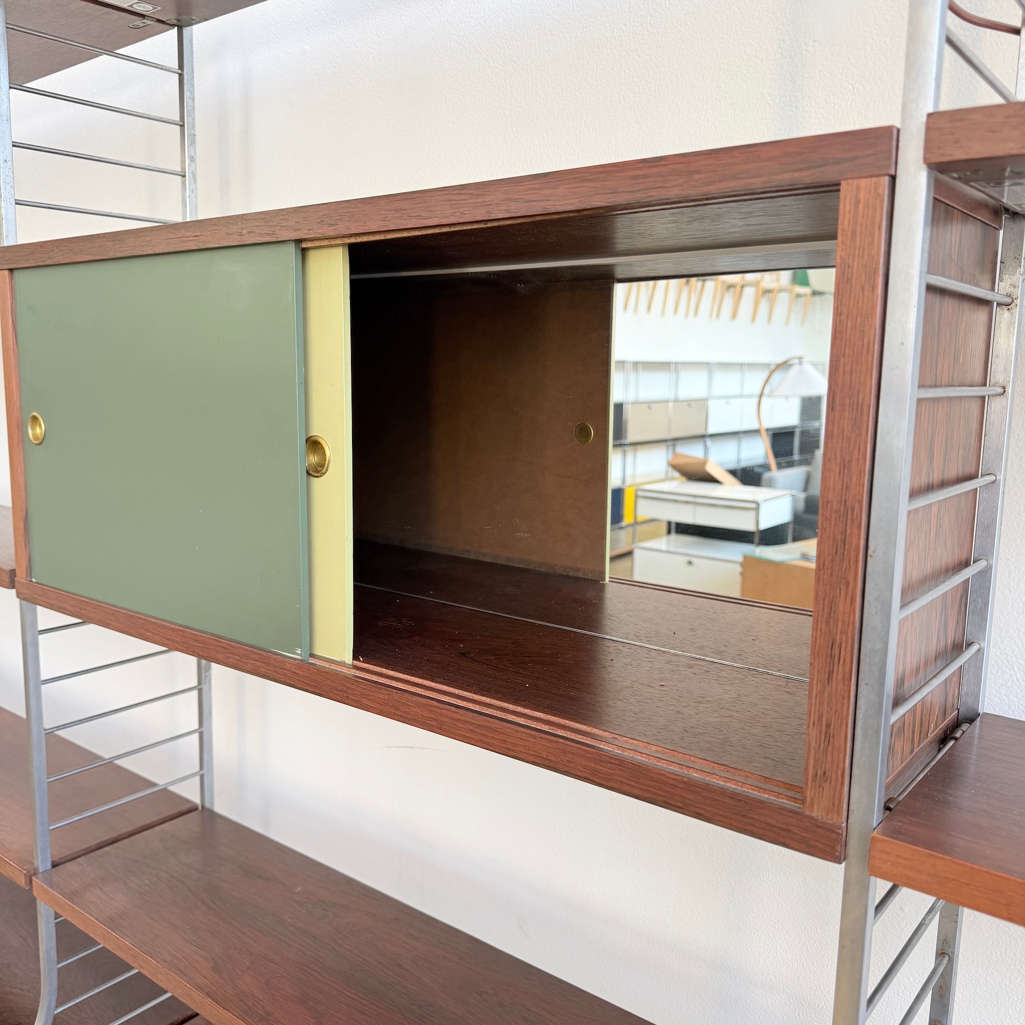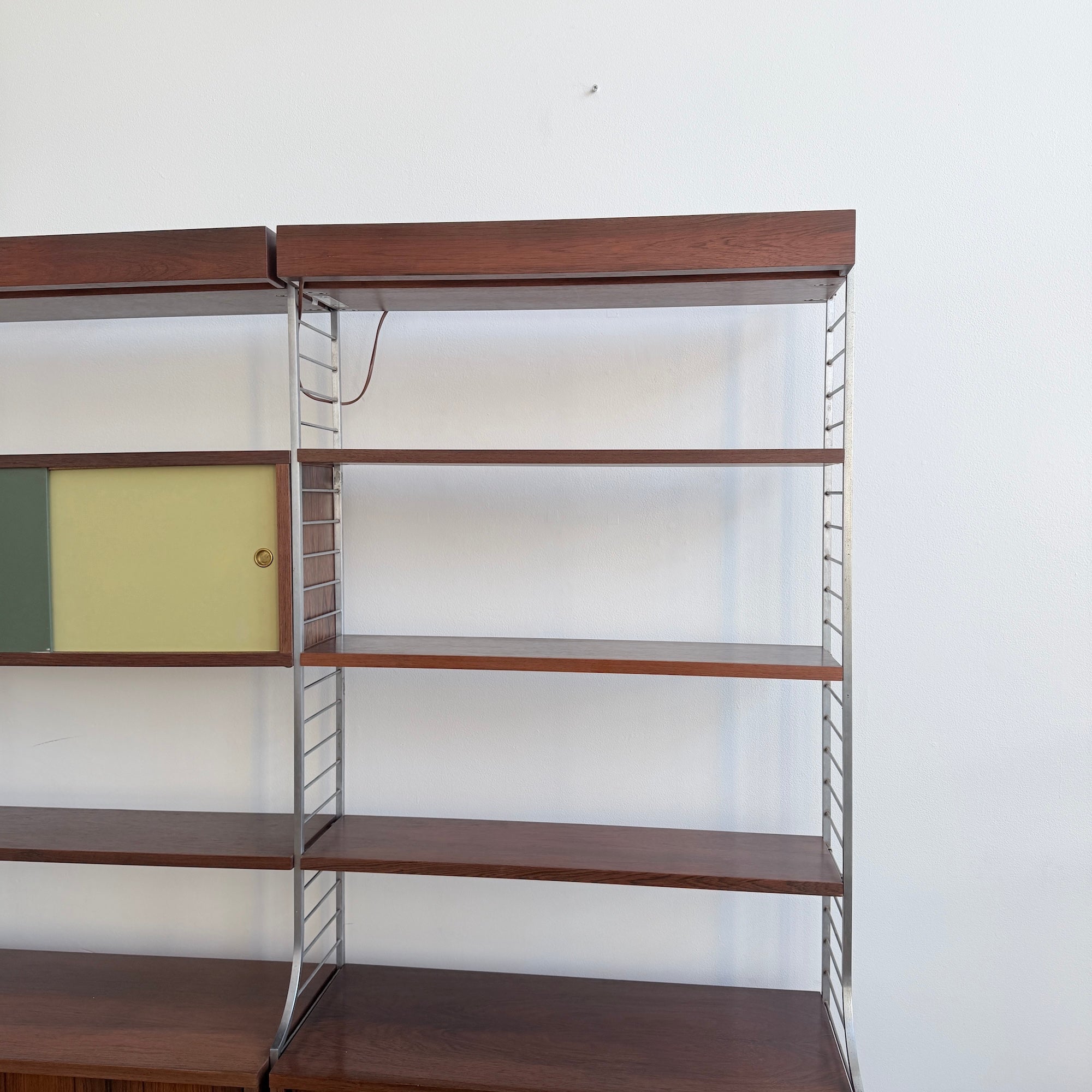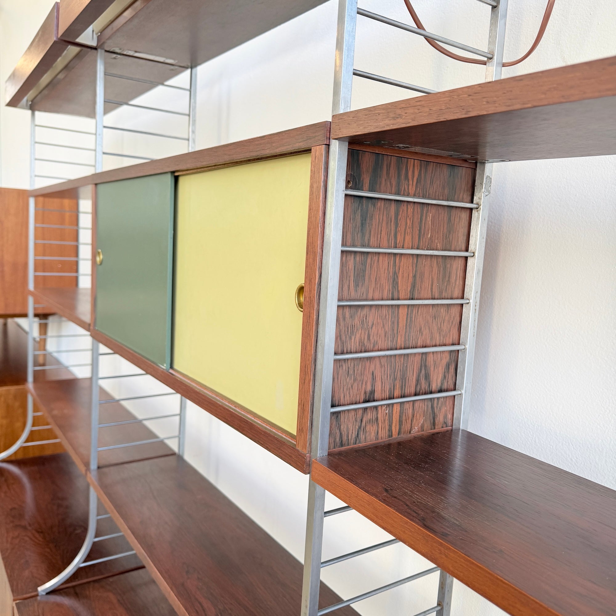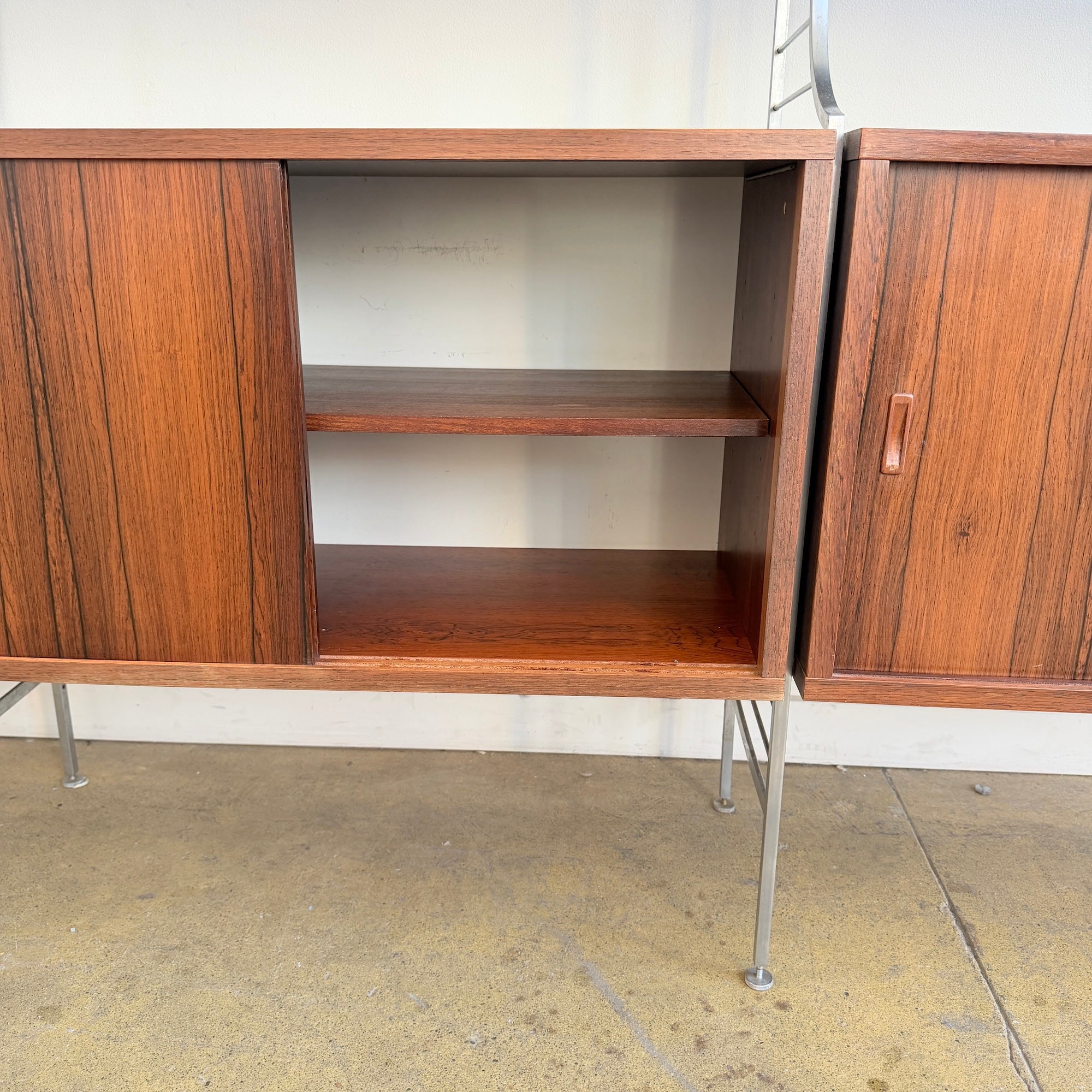 Striking three-section modular shelving system in rosewood with polished chrome supports. An iconic Scandinavian mid-century construction that blends warm wood, clean lines, and airy verticality. The unit features generous open shelving, sliding-door cabinets, and a single upper cabinet with original lacquered doors. Branded.