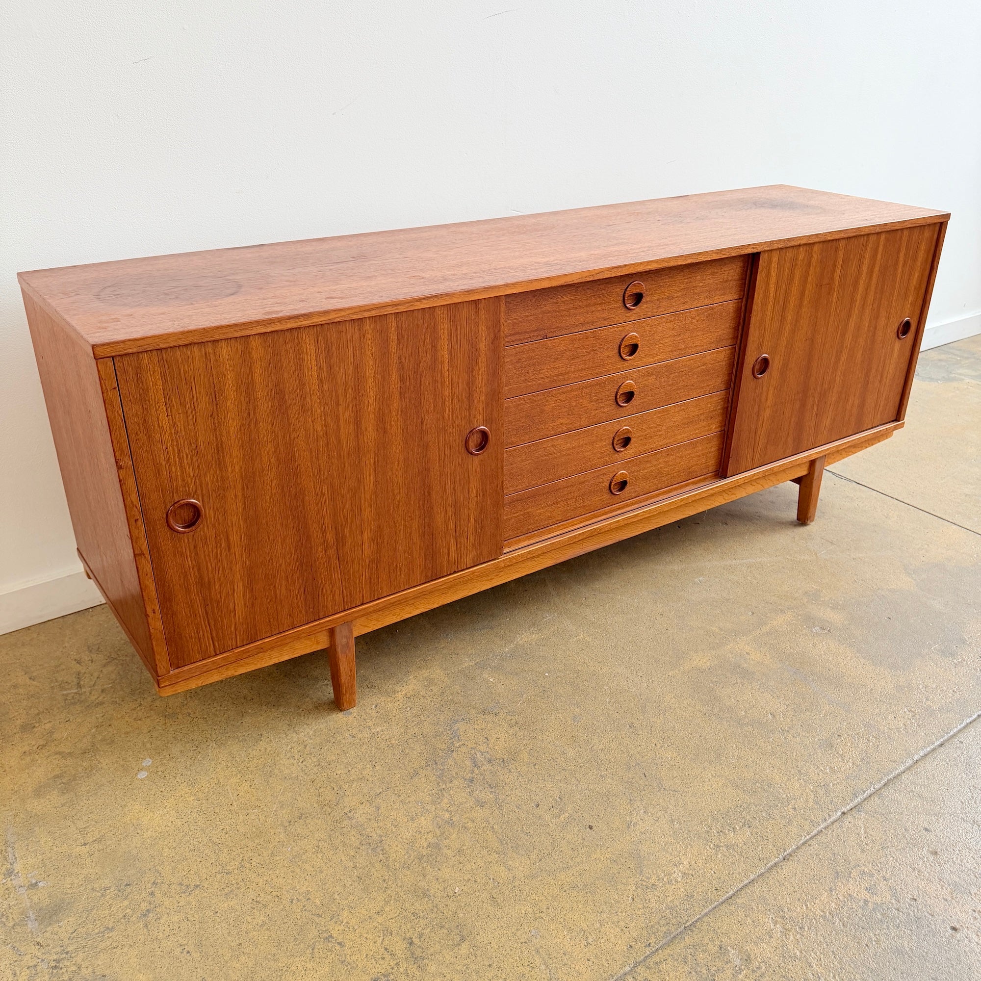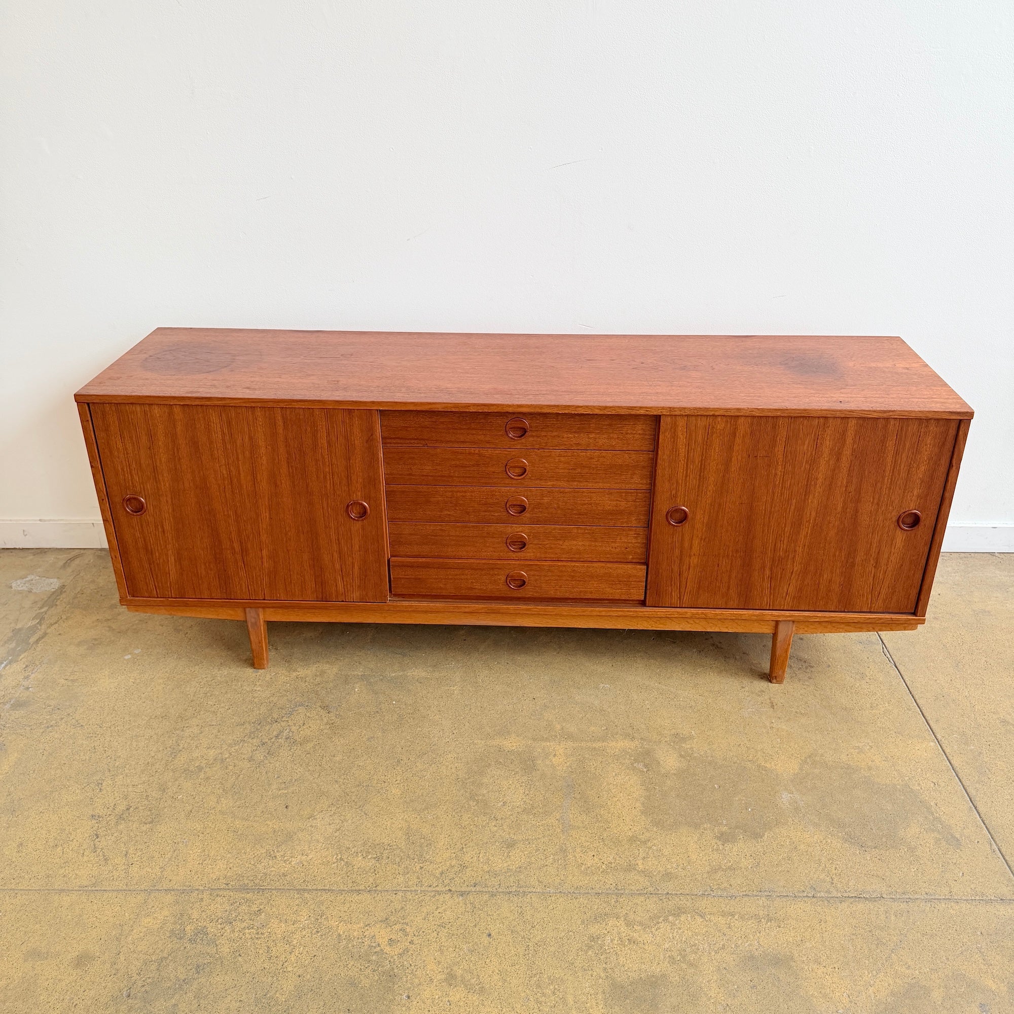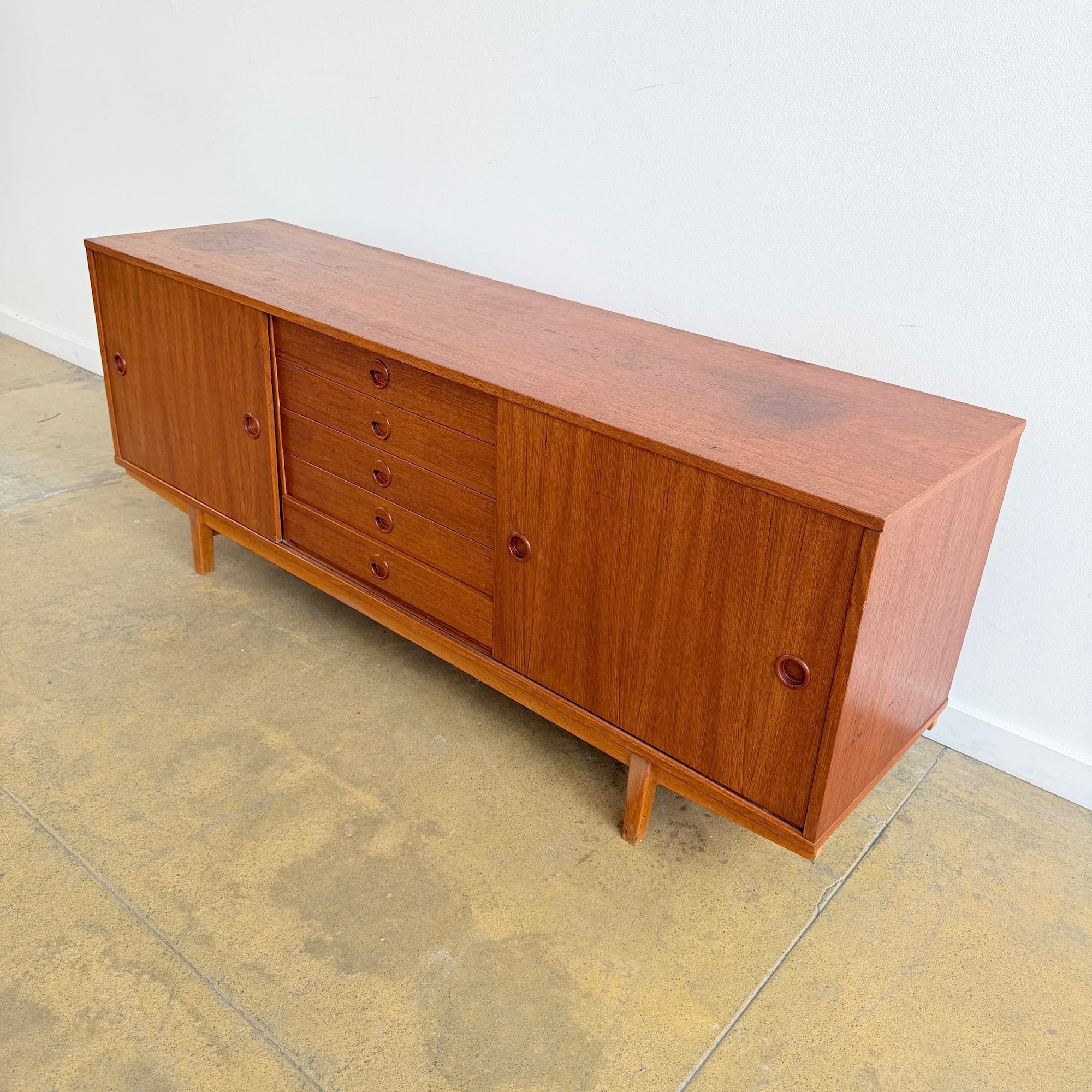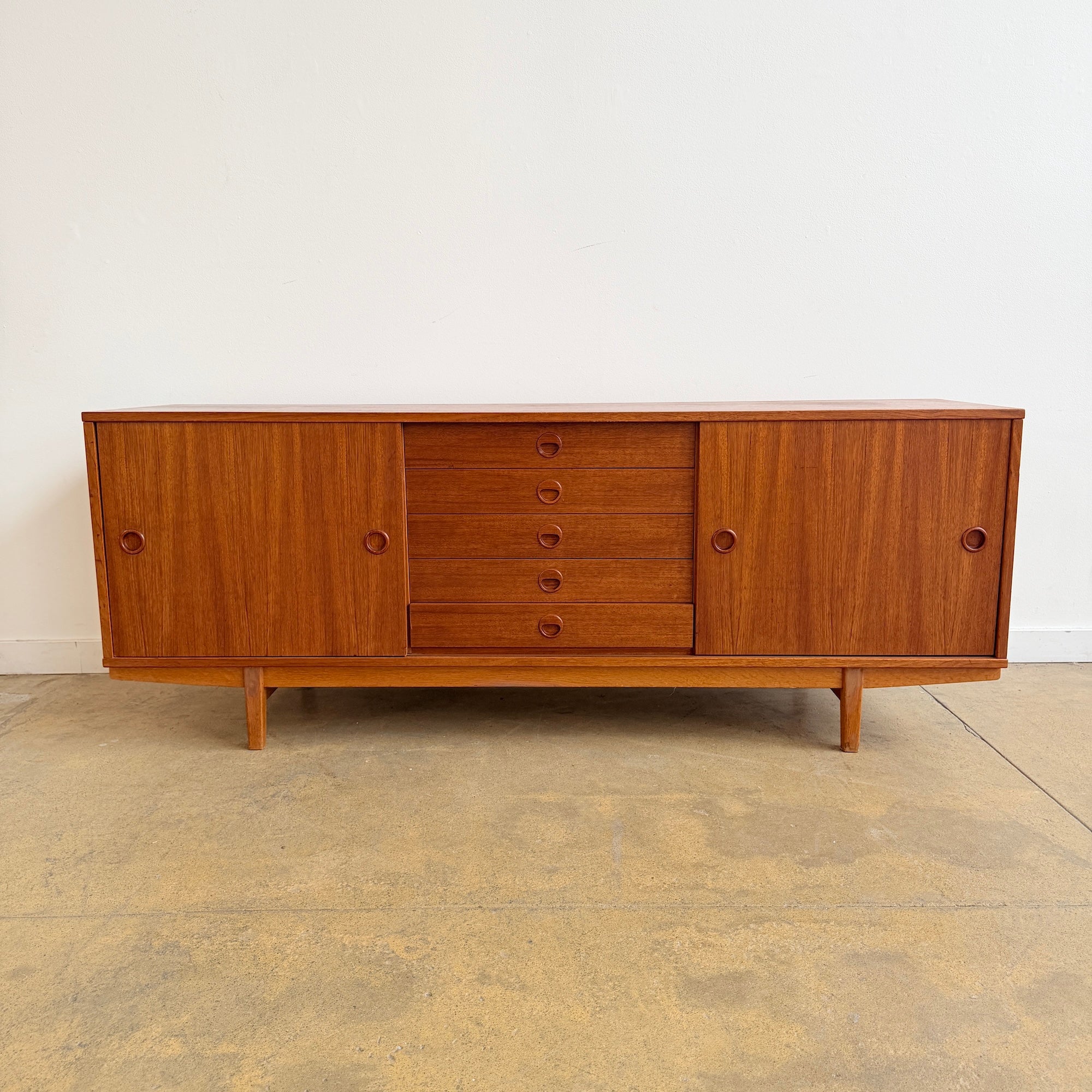 Teak sideboard marked Svensk Möbelindustri, showcasing clean Swedish modern lines with sliding doors and a bank of center drawers. Beautiful proportions and a warm tonal grain throughout.