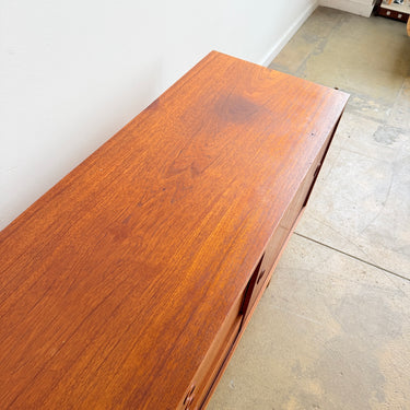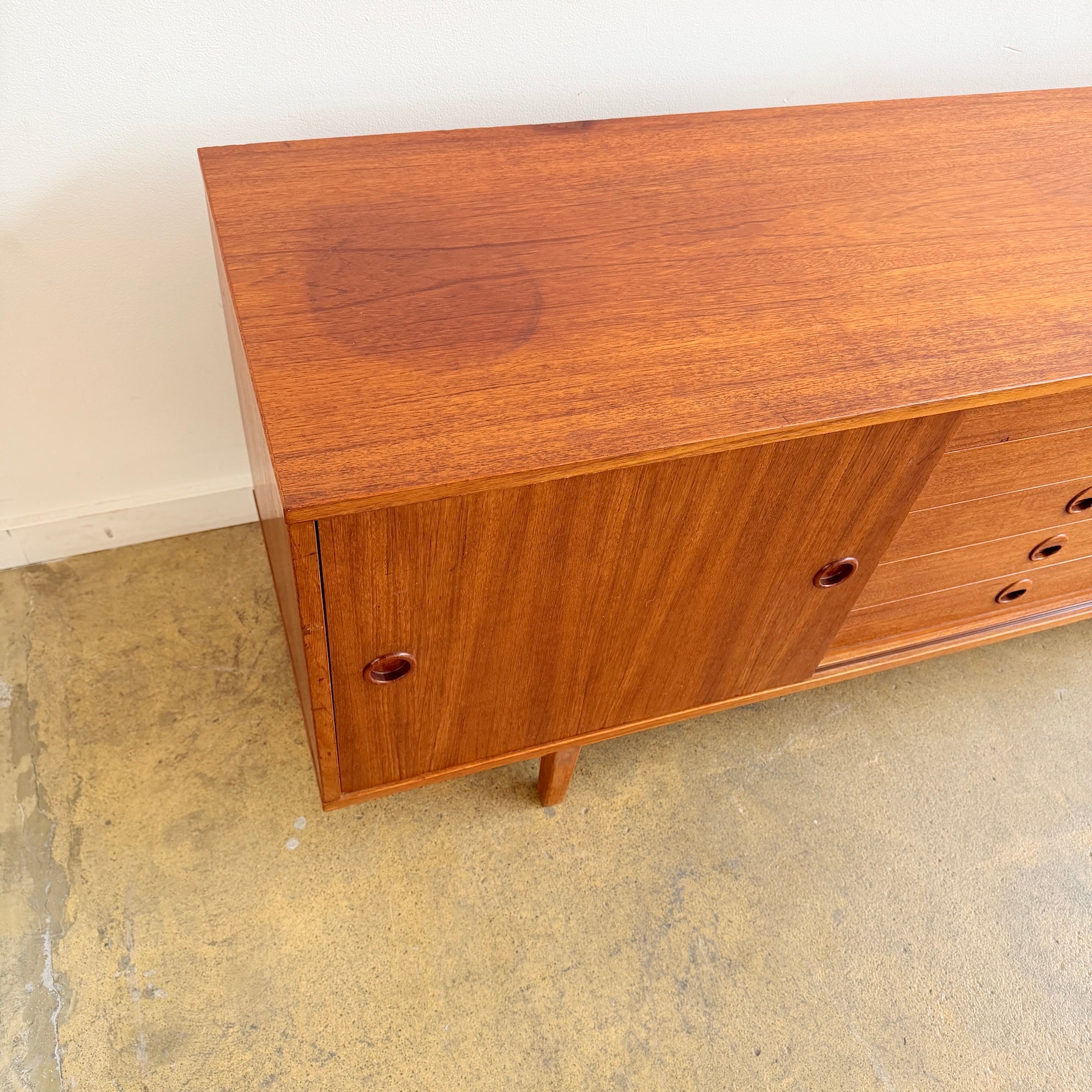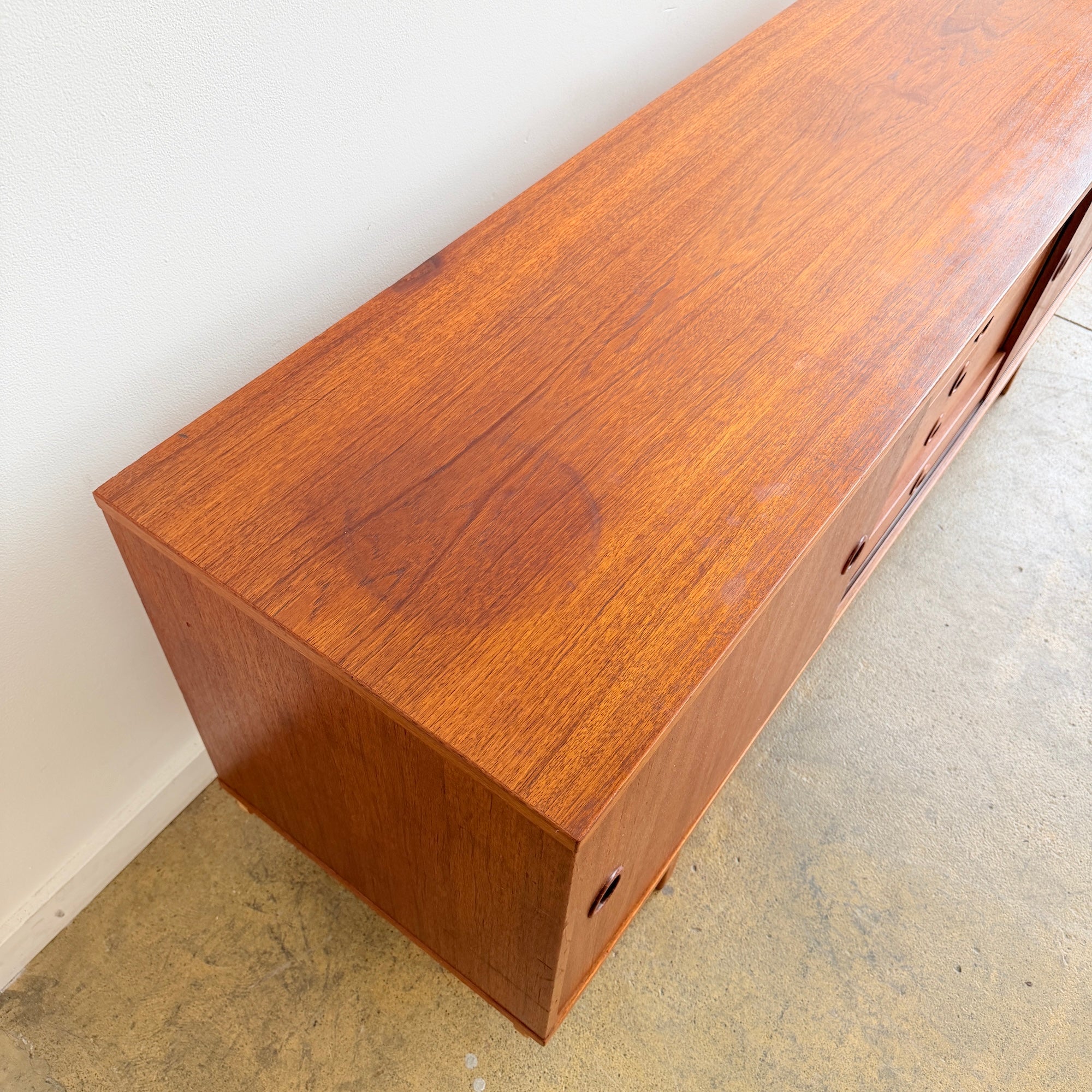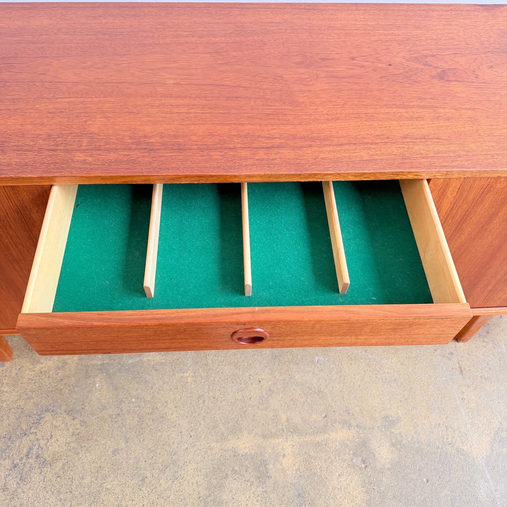 Teak sideboard marked Svensk Möbelindustri, showcasing clean Swedish modern lines with sliding doors and a bank of center drawers. Beautiful proportions and a warm tonal grain throughout.