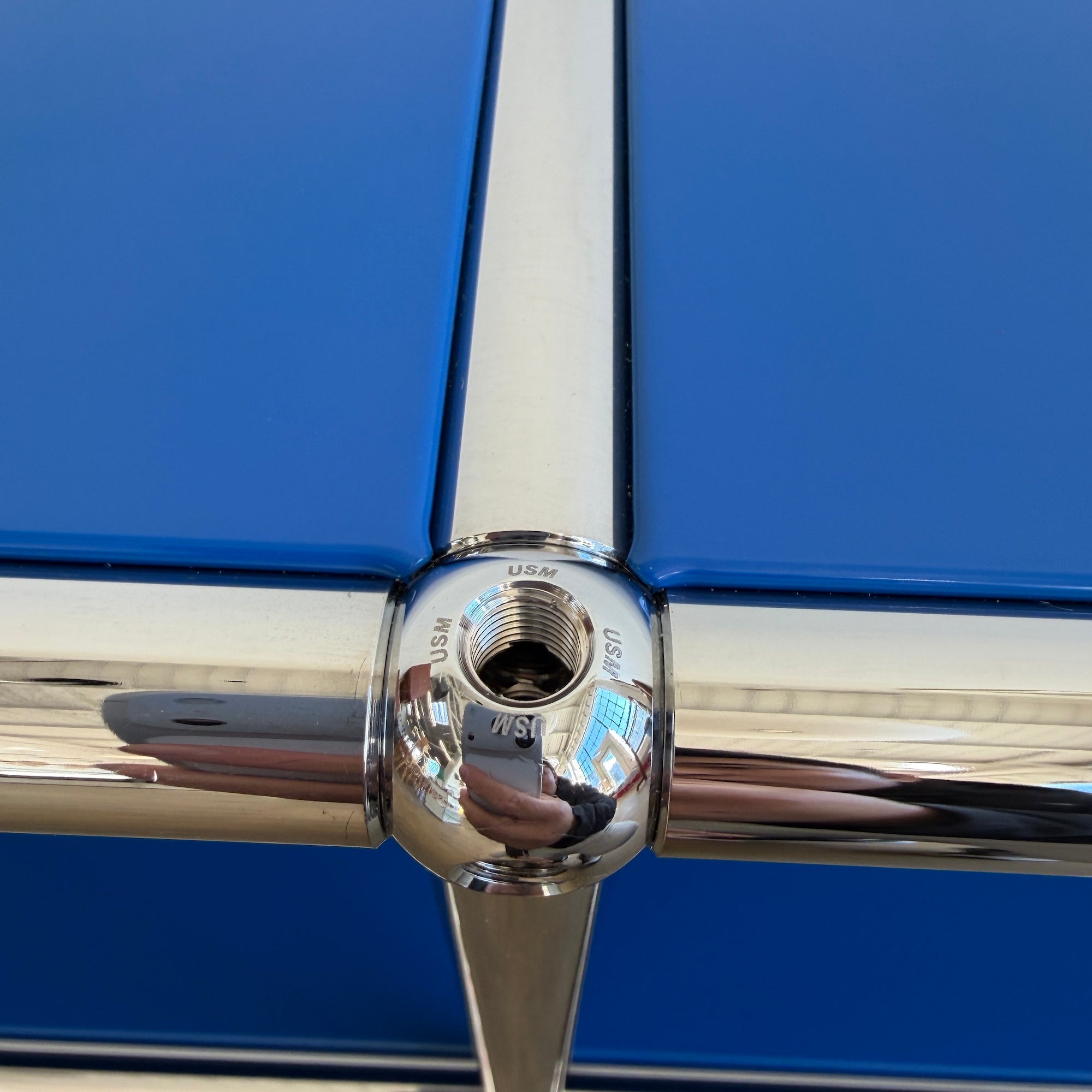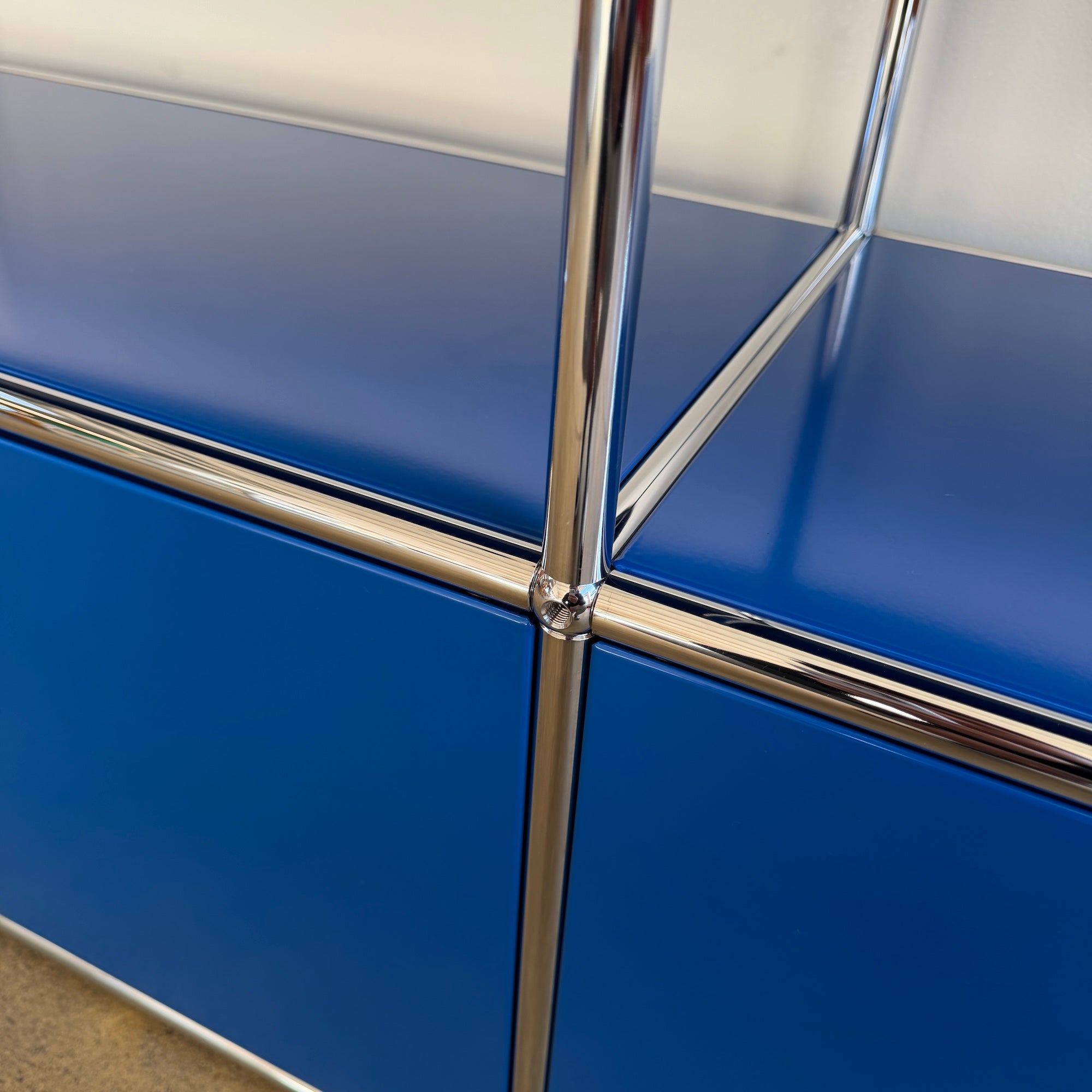 The USM HALLER Media Console was created in 1963 by Swiss architects Fritz Haller and Paul Schaerer. It features custom-made powder-coated steel panels and chrome tubes, providing long-lasting durability that can span generations.