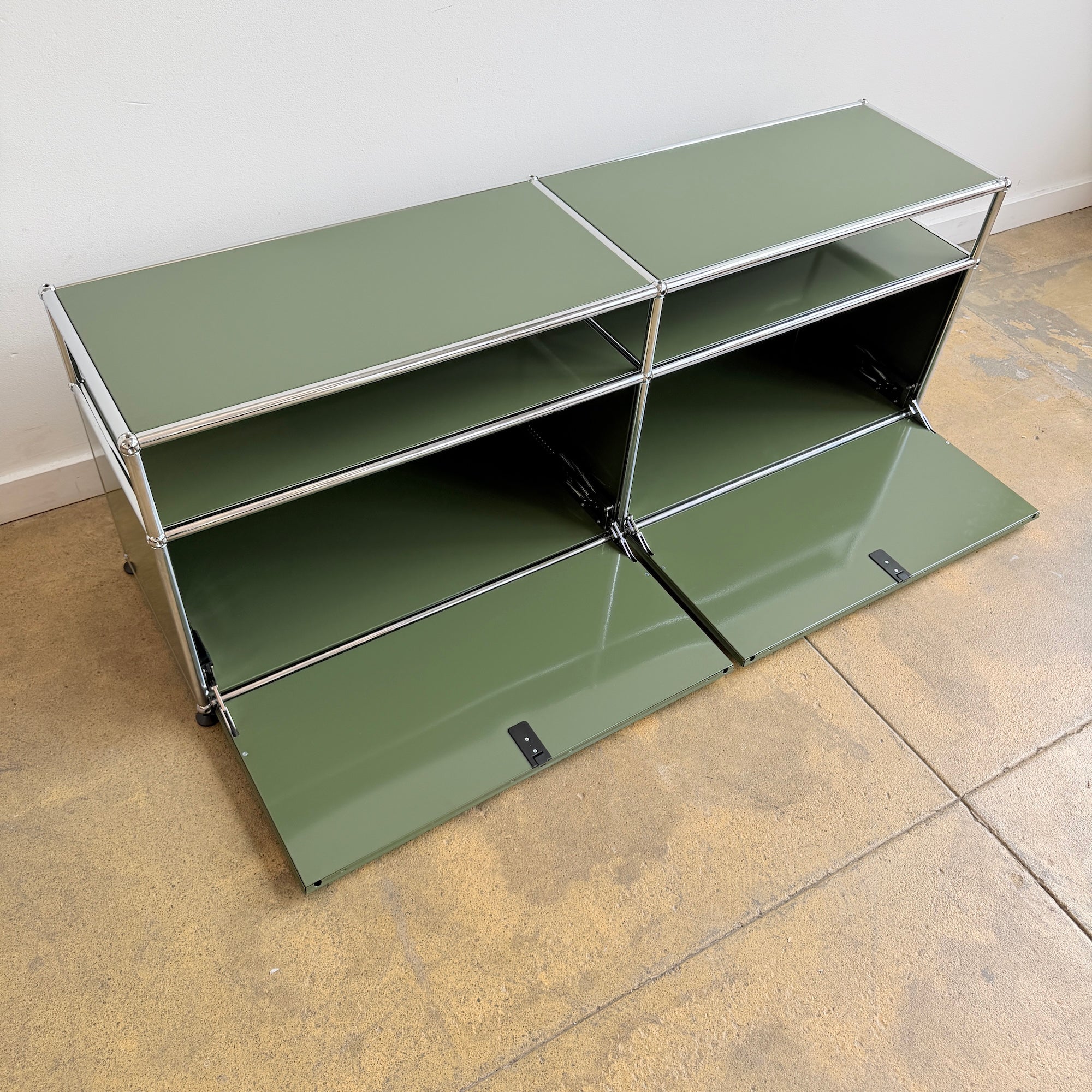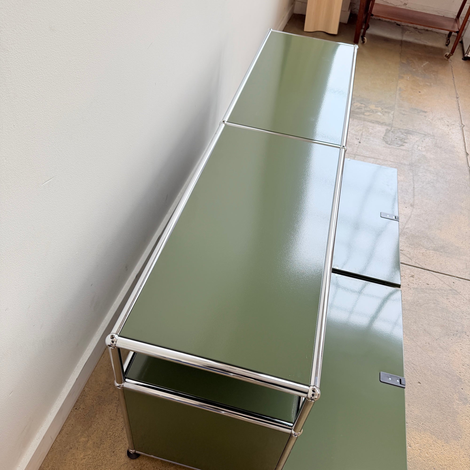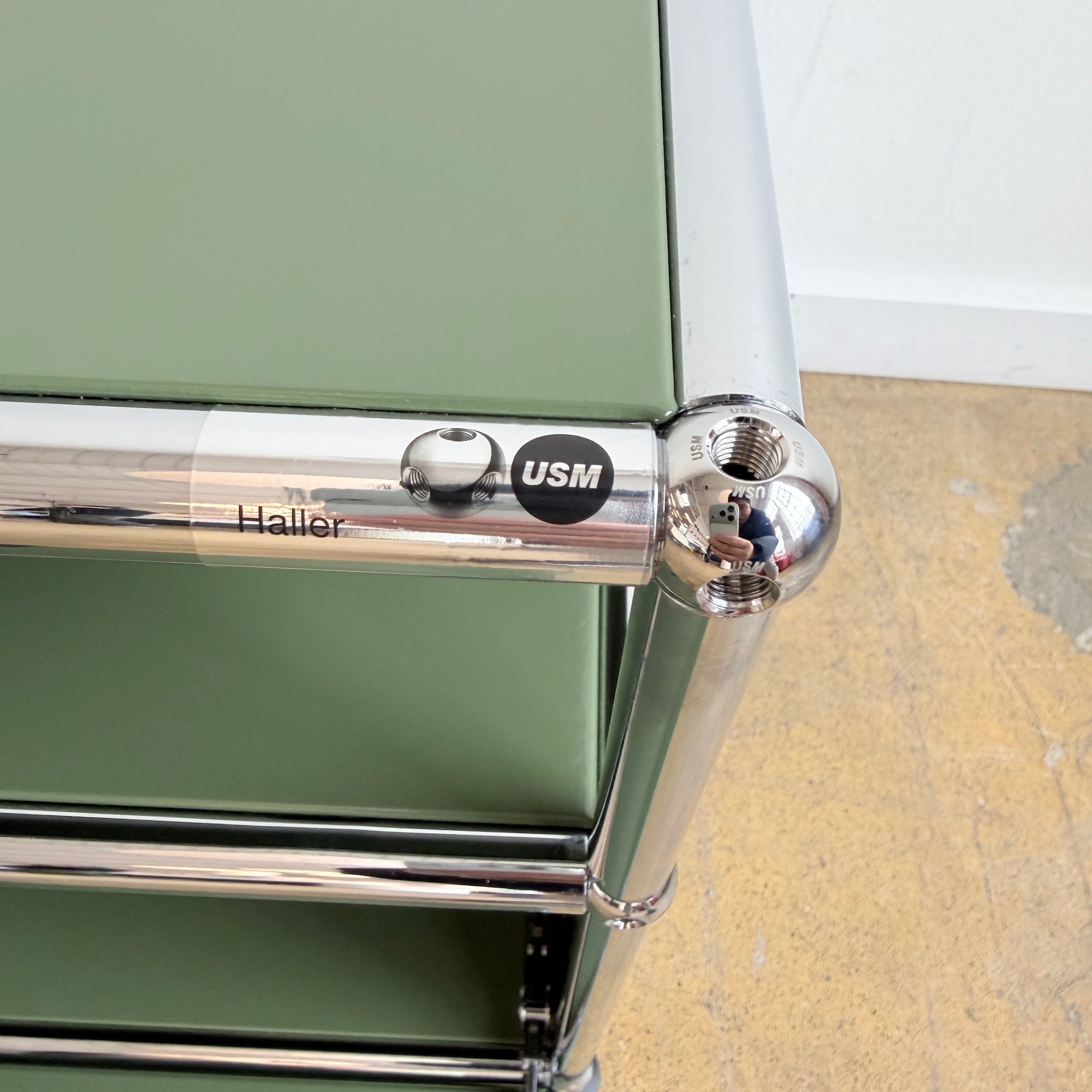 The USM HALLER was created in 1963 by Swiss architects Fritz Haller and Paul Schaerer. It features custom-made powder-coated steel panels and chrome tubes, providing long-lasting durability that can span generations.