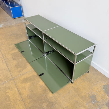 A versatile storage credenza with two 14" H drop down doors that lock with the twist of a coin. In pristine condition with soft opening and closing doors.