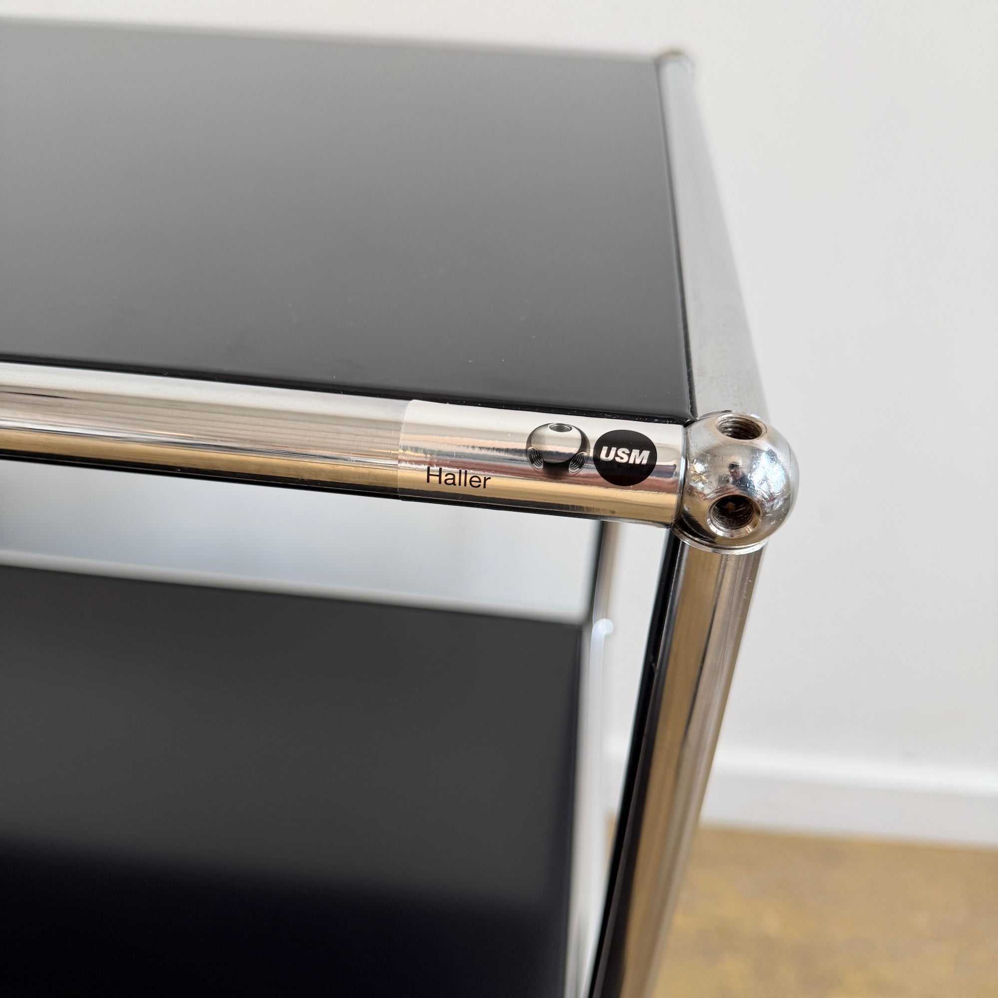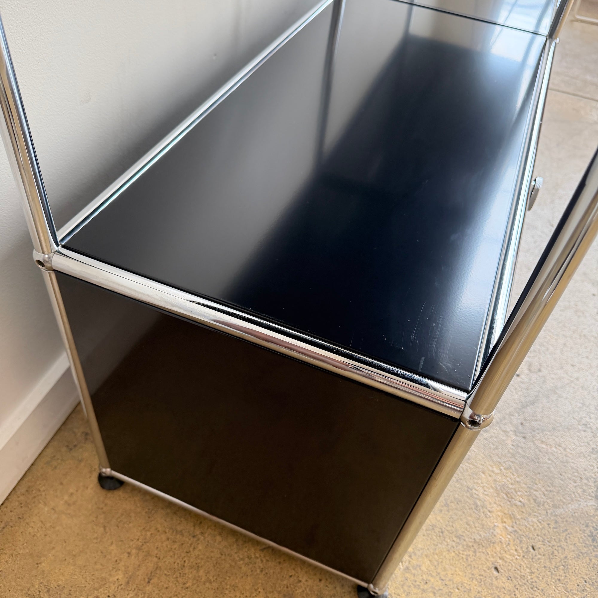 The USM HALLER was created in 1963 by Swiss architects Fritz Haller and Paul Schaerer. It features custom-made powder-coated steel panels and chrome tubes, providing long-lasting durability that can span generations.