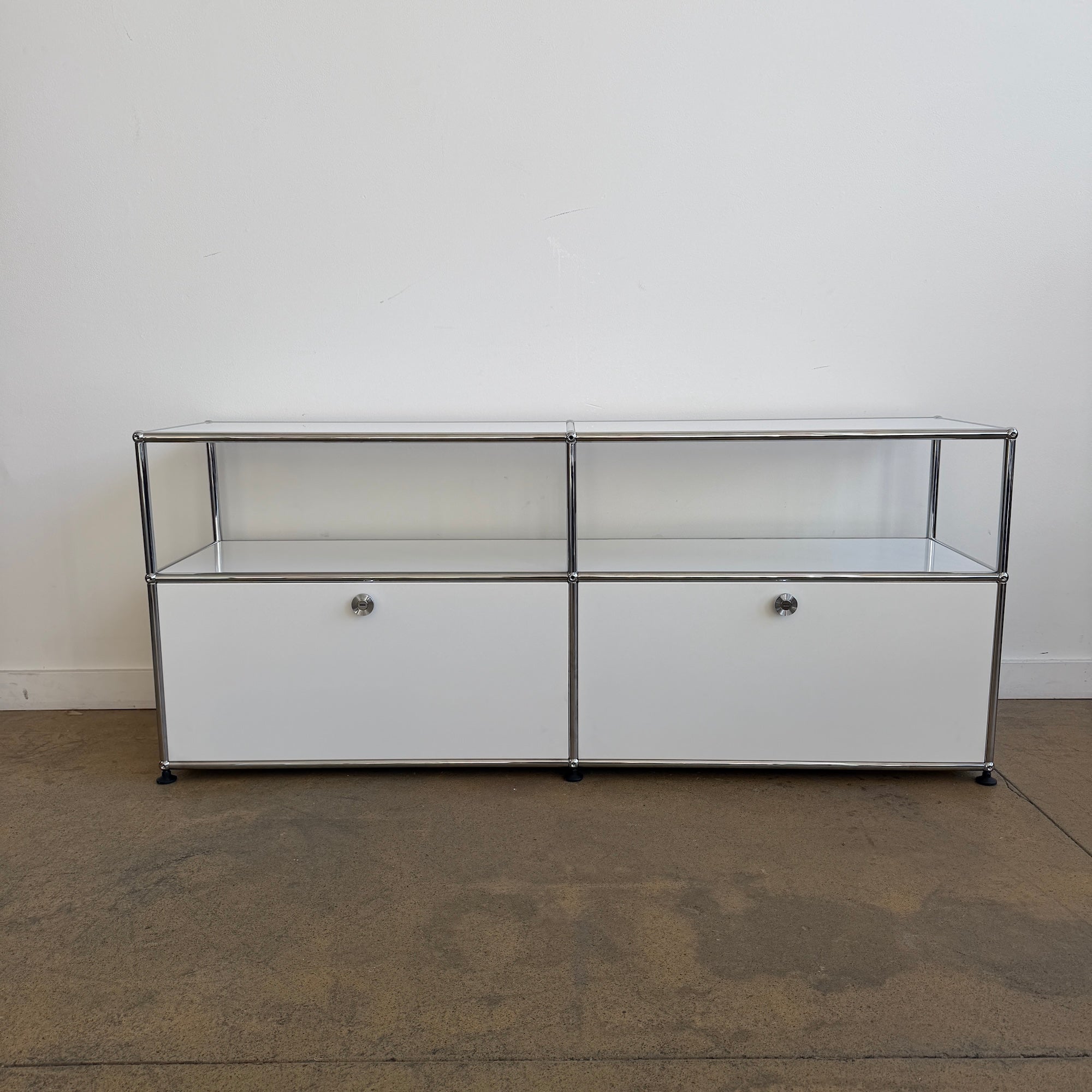 This USM Haller console is in brand condition. The two upper unit is left open with two drop down closed door. Equipped with latest upgrade of soft opening and closing.