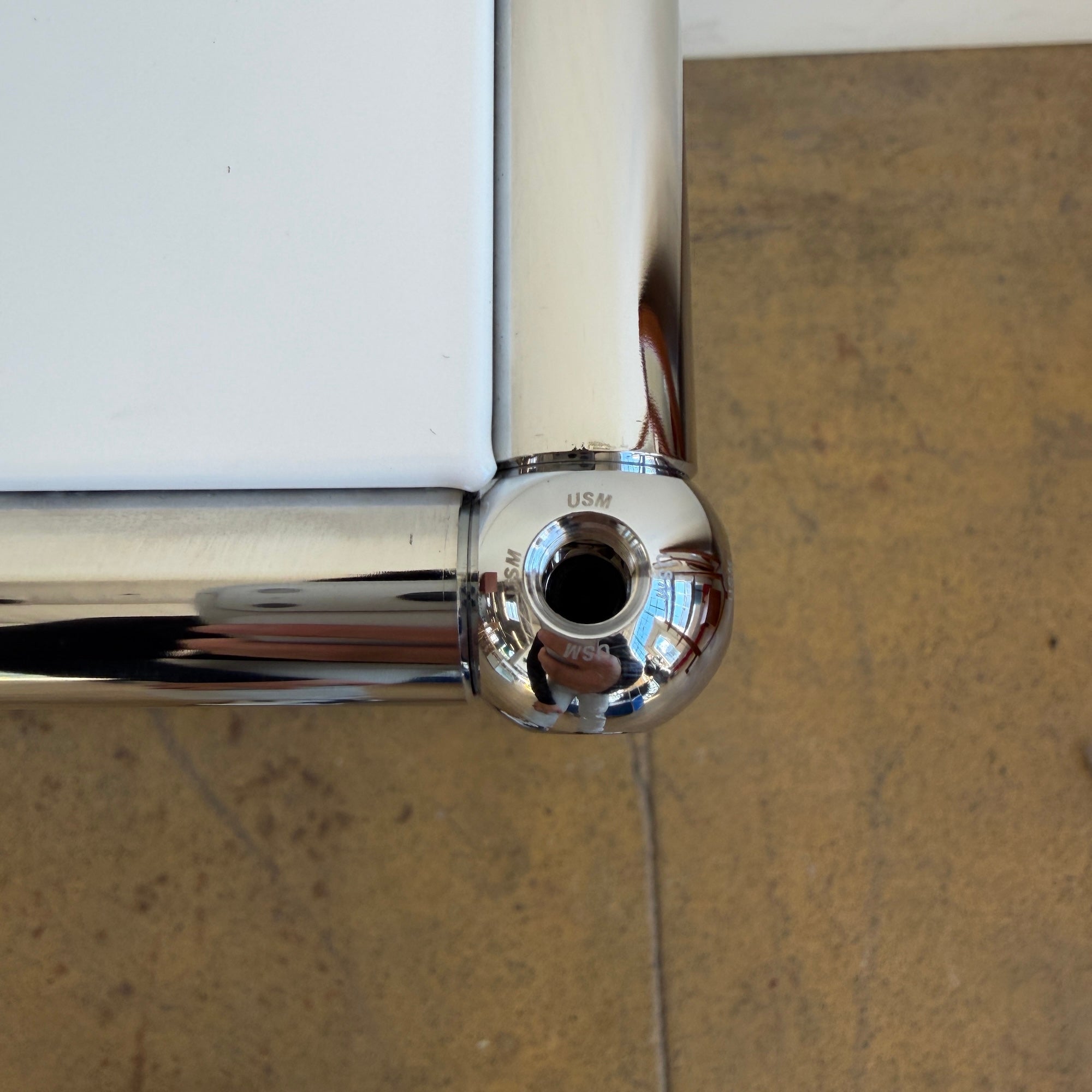 The USM HALLER Media Console was created in 1963 by Swiss architects Fritz Haller and Paul Schaerer. It features custom-made powder-coated steel panels and chrome tubes, providing long-lasting durability that can span generations.