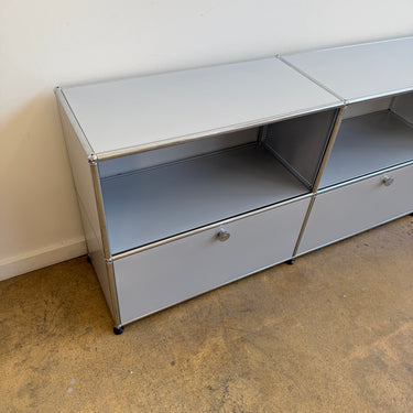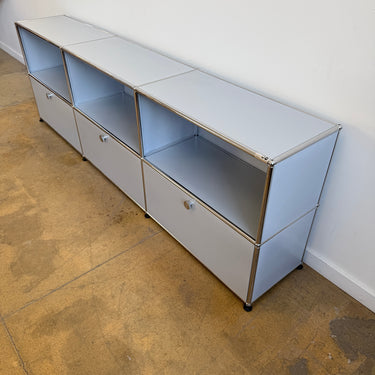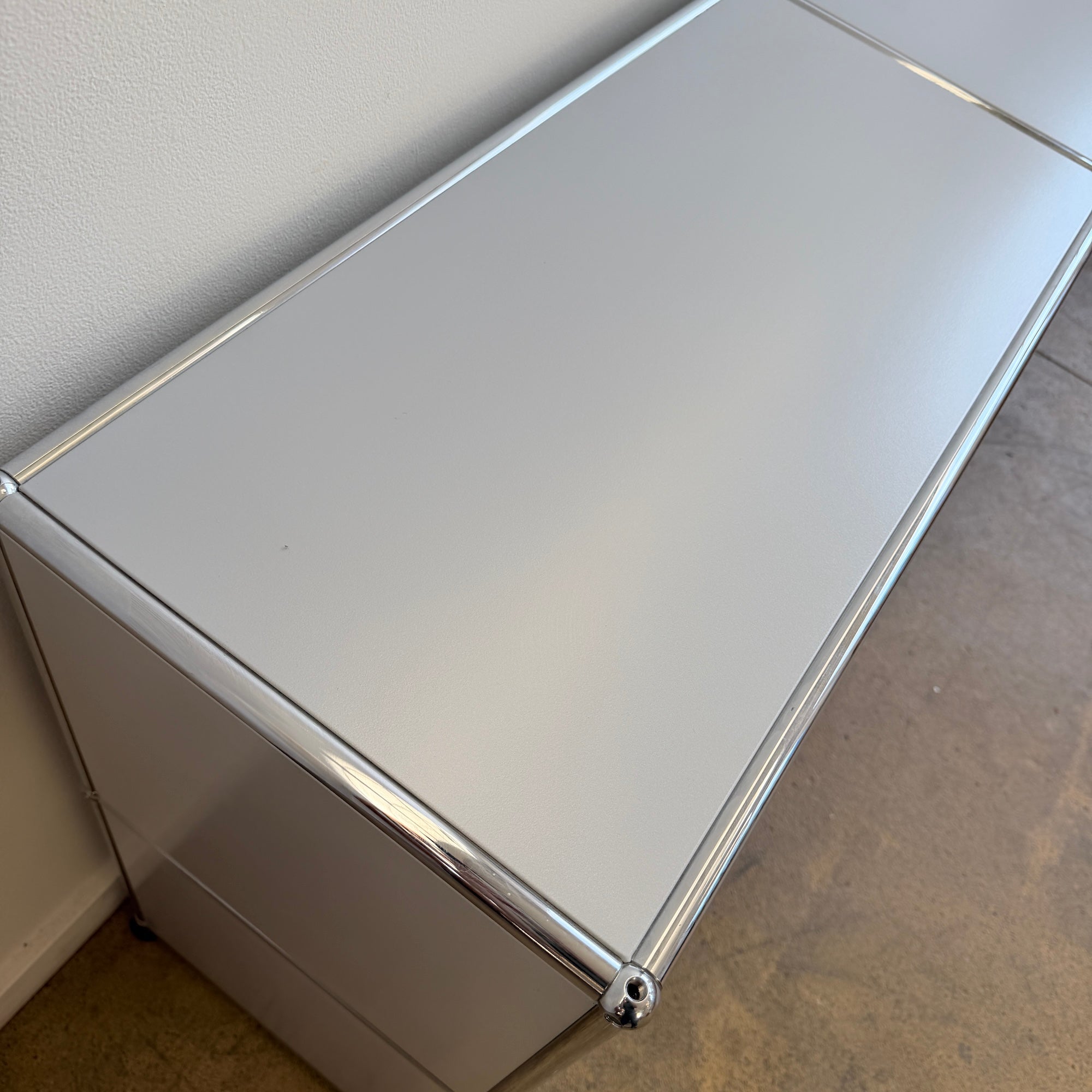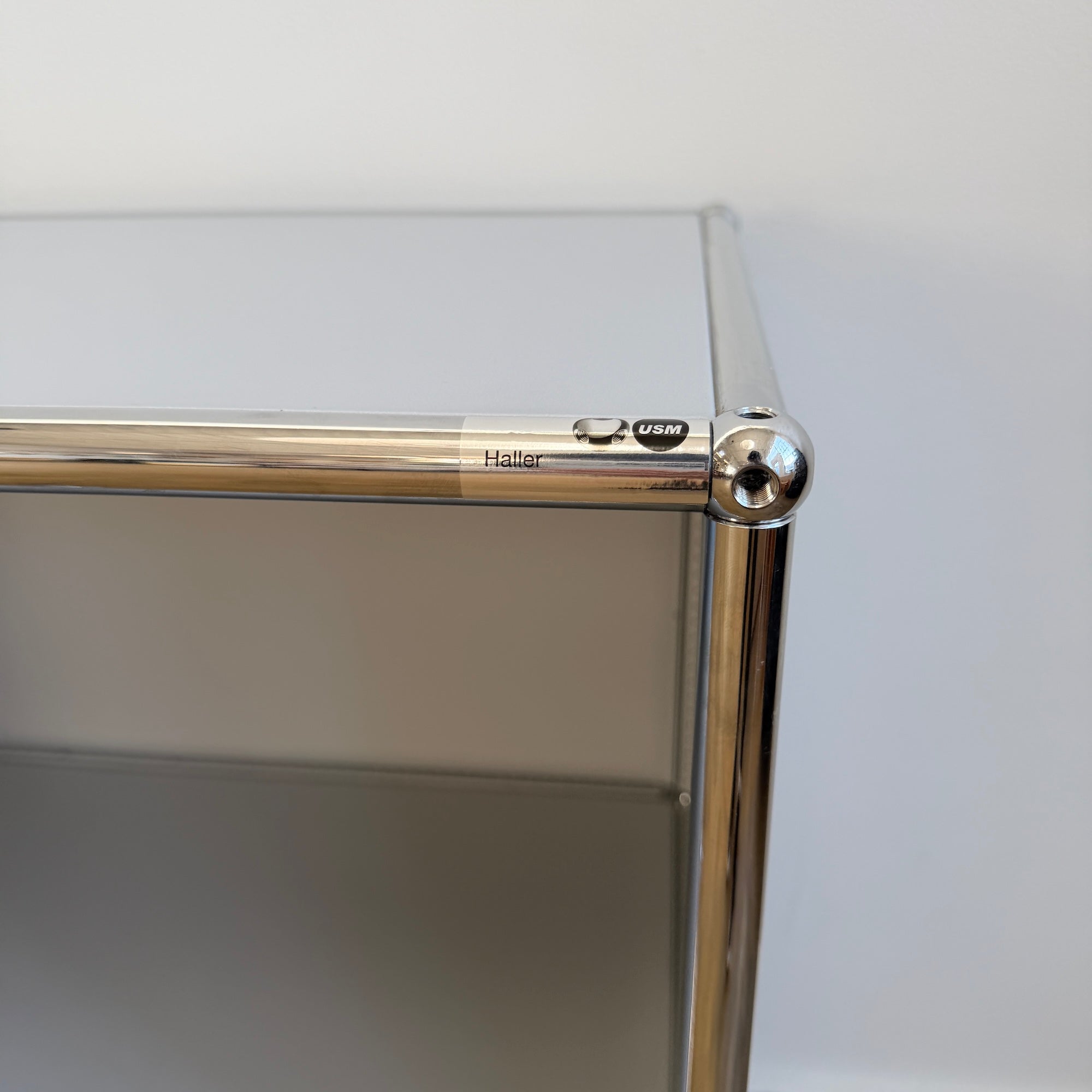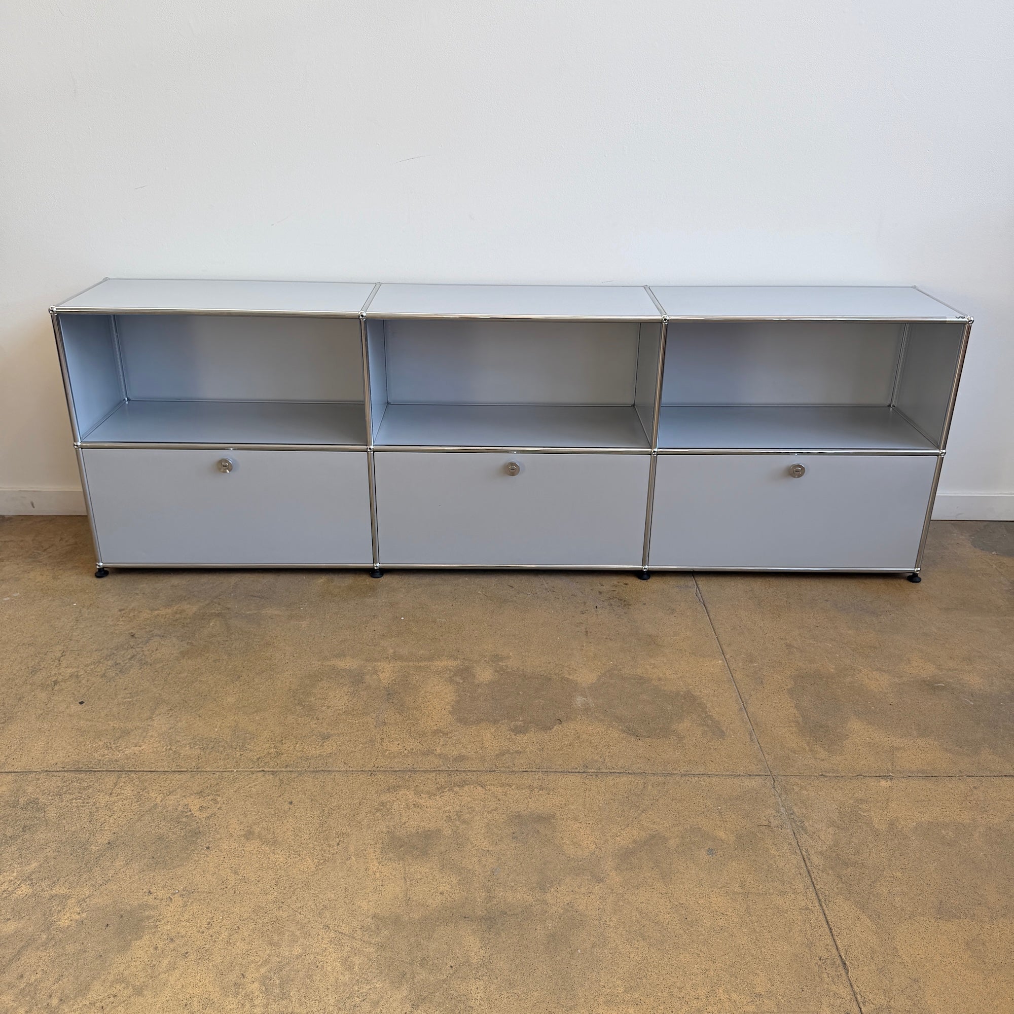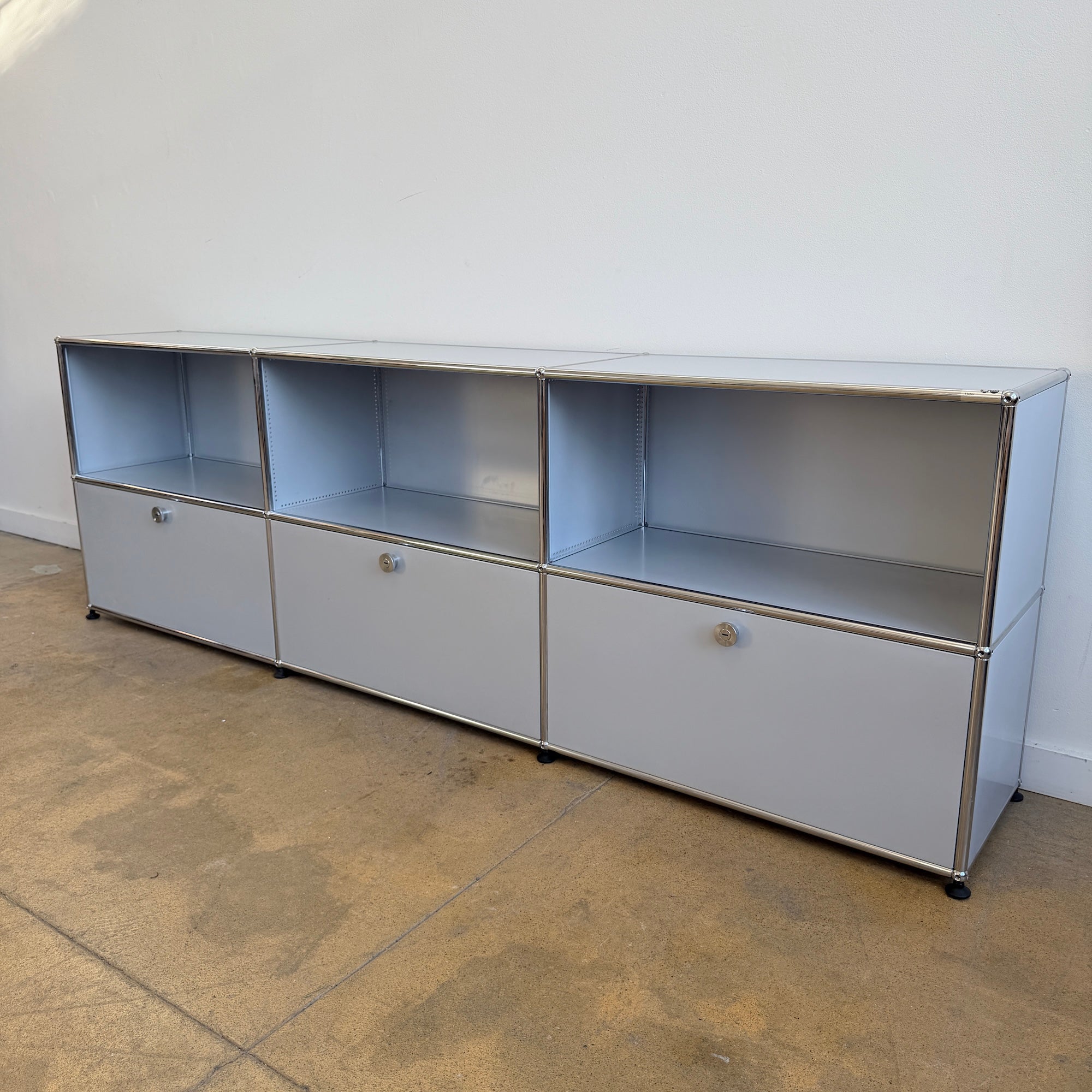 This USM Haller console is in good condition with rare silver color. Silver is very scratch resistant offers a more neutral white than pure white. There is three drop down doors with latest soft closing and opening.