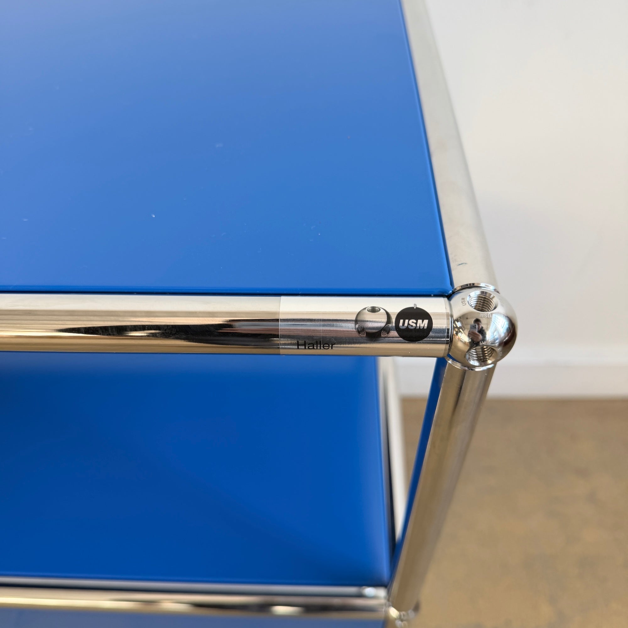 The USM HALLER Media Console was created in 1963 by Swiss architects Fritz Haller and Paul Schaerer. It features custom-made powder-coated steel panels and chrome tubes, providing long-lasting durability that can span generations.