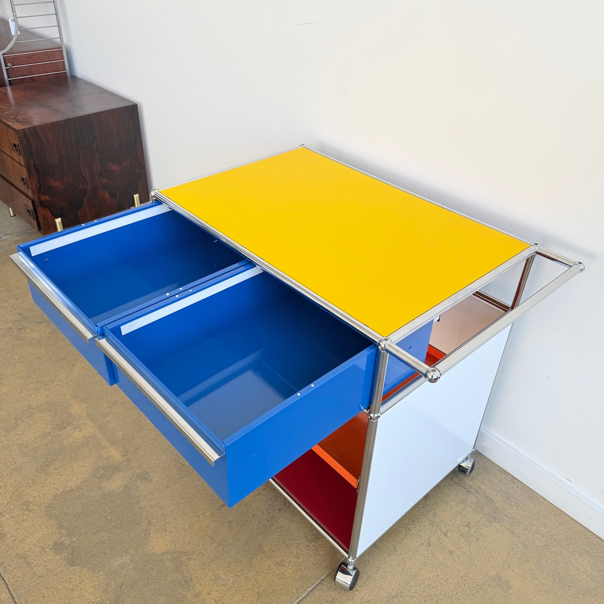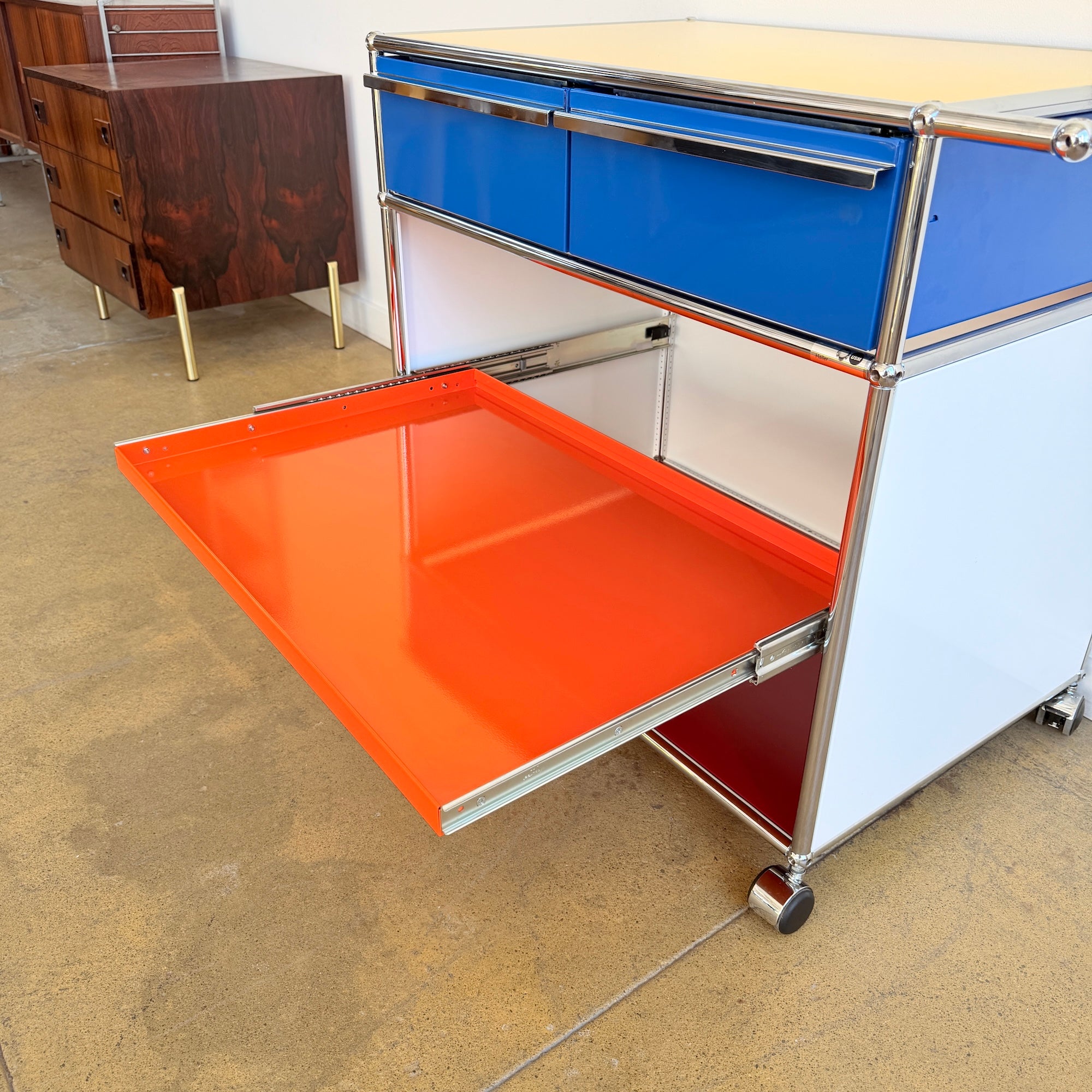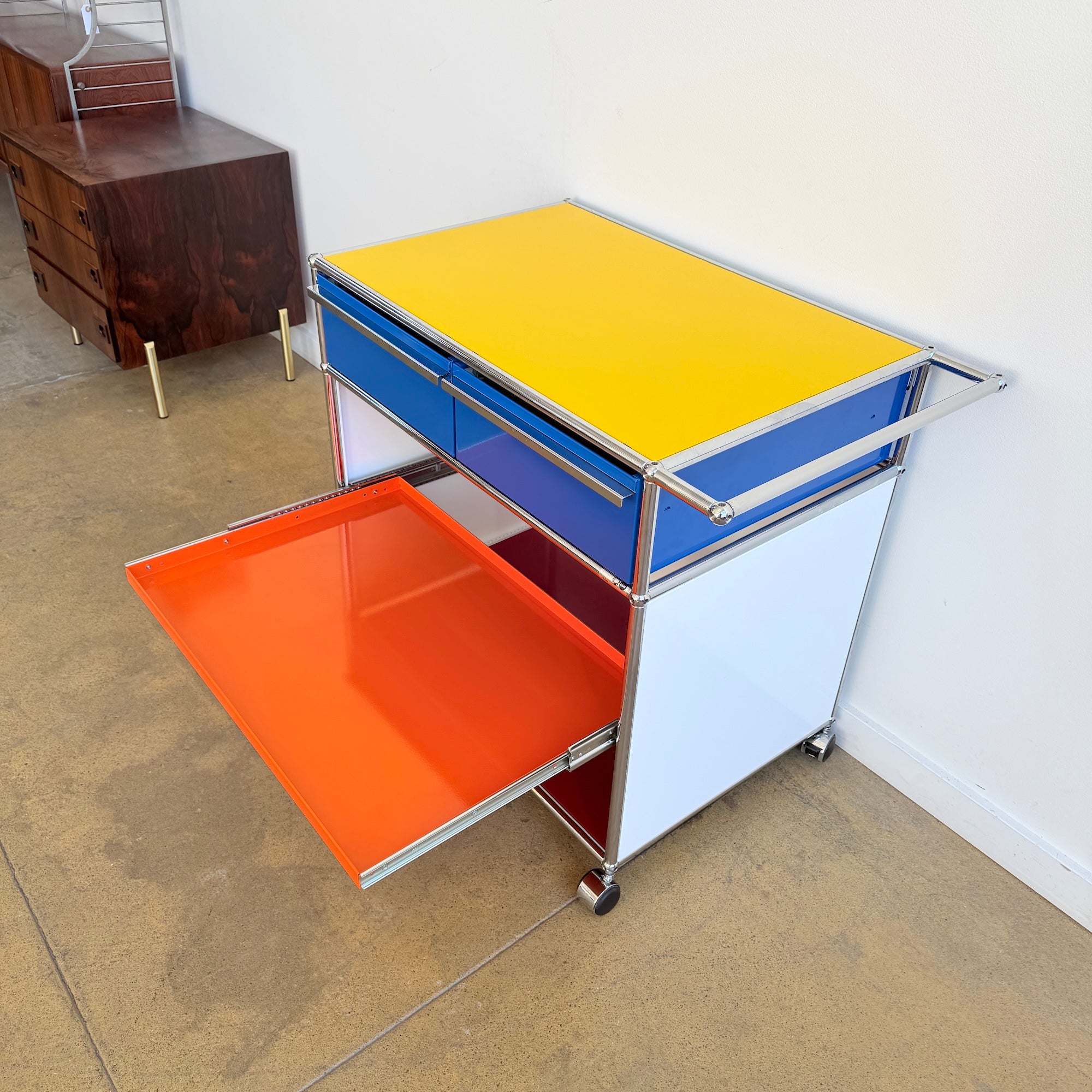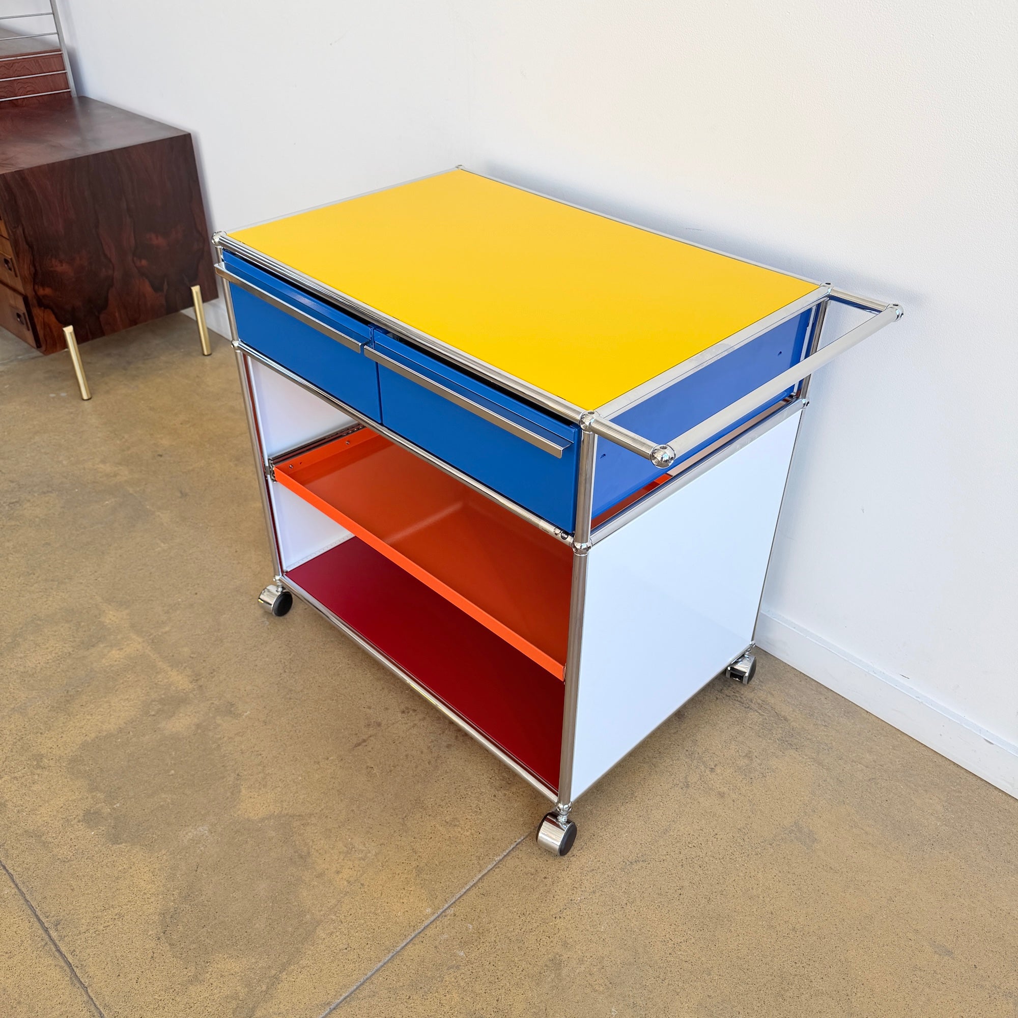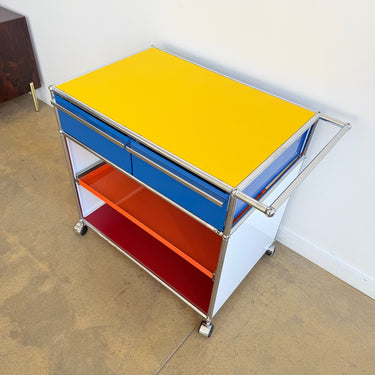 This USM Haller modular storage unit features a striking five-color panel configuration paired with a polished chrome frame. Designed for both function and flexibility, it includes two pull-out drawers on the top level and a pull-out tray in the middle, offering convenient storage and easy access. Set on casters for effortless mobility, it works equally well as a bar cart, coffee station, office storage, or accent piece in your living room. In excellent overall condition.