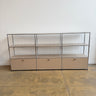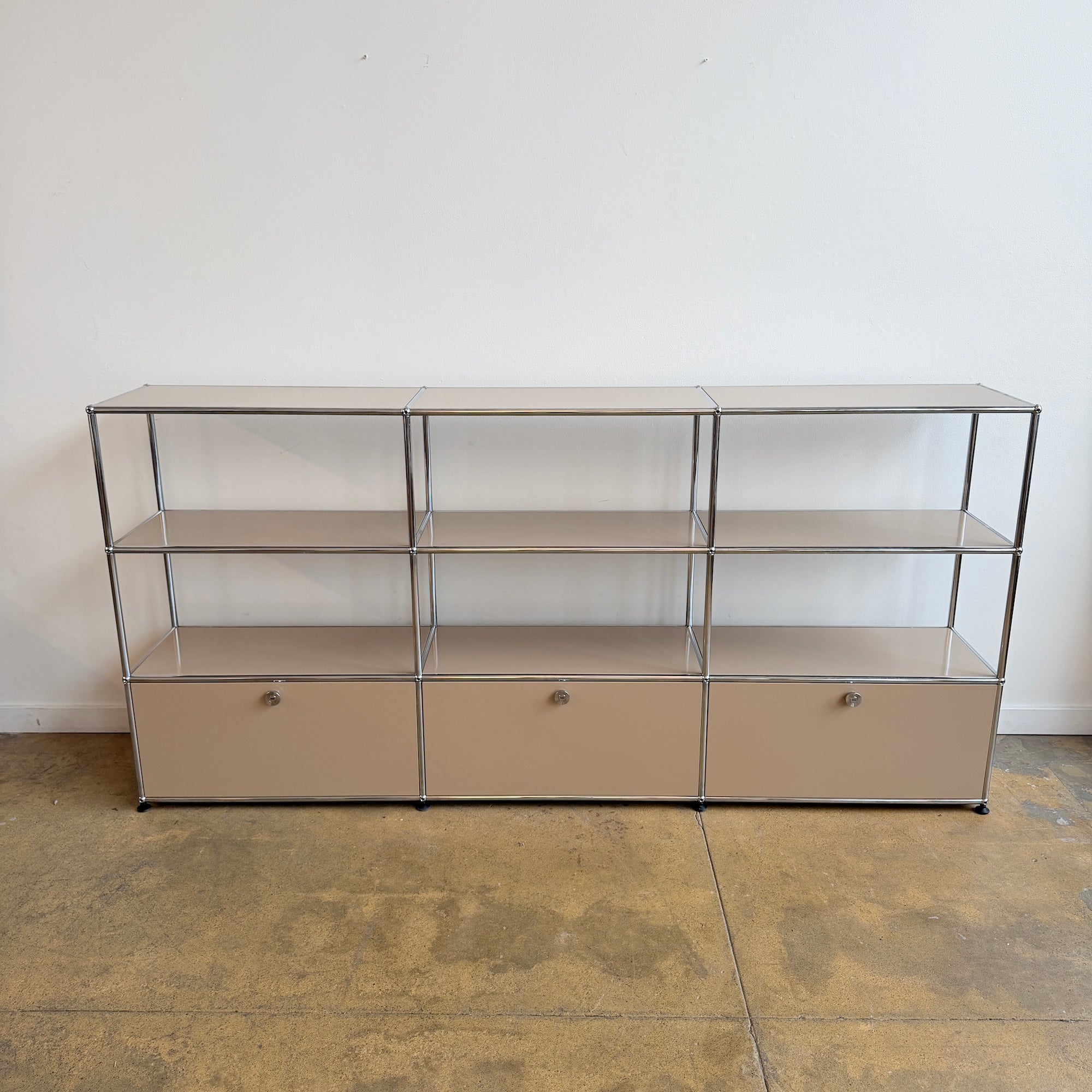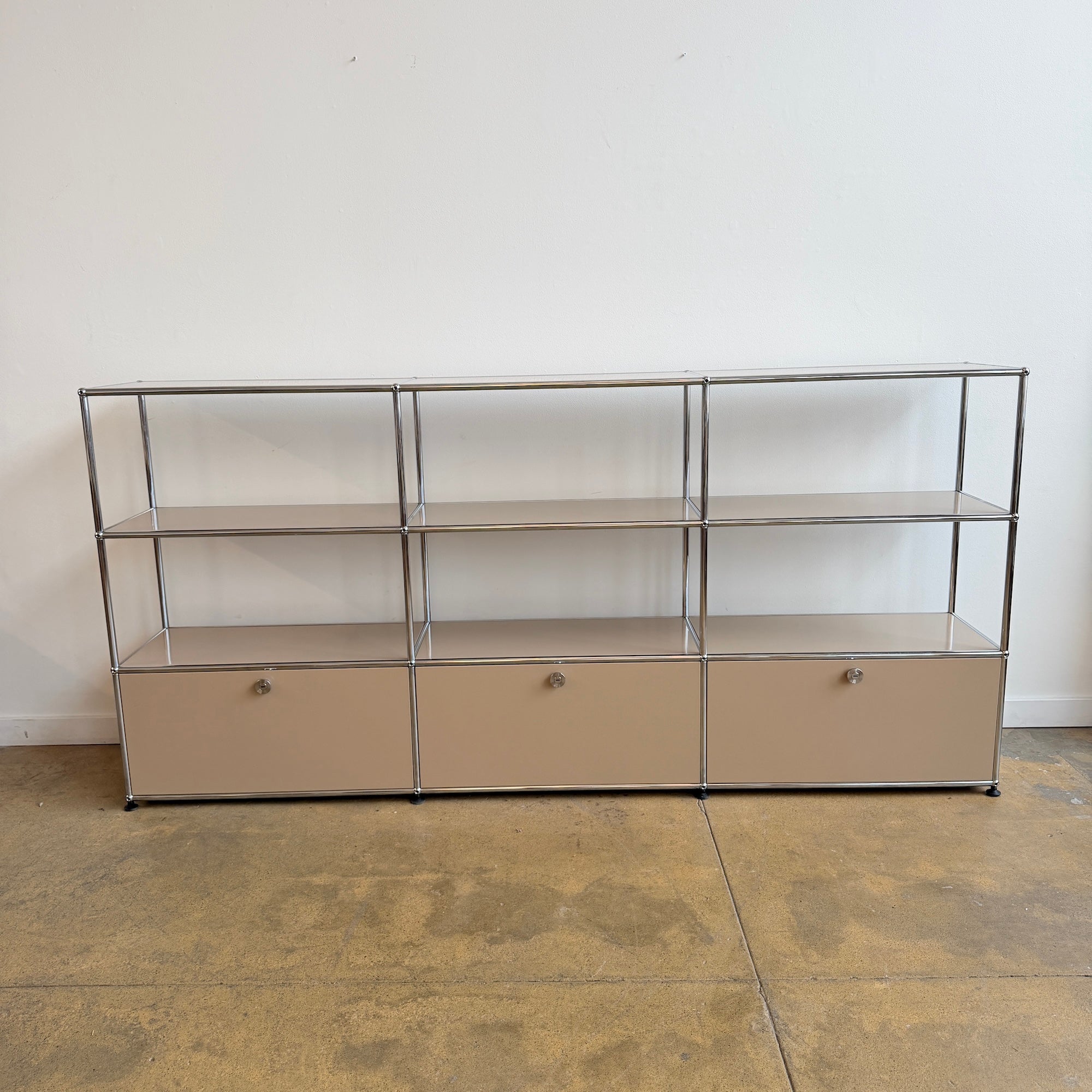 This USM Haller console is in excellent condition and features three drop-down doors. All the beige panels and doors are brand new without any scratches or damage. It is equipped with the latest soft-opening and soft-closing mechanism for smooth, effortless use. Additional panels and doors can be added for extra charge. Reach out for customization.