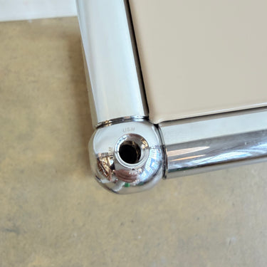 The USM HALLER was created in 1963 by Swiss architects Fritz Haller and Paul Schaerer. It features custom-made powder-coated steel panels and chrome tubes, providing long-lasting durability that can span generations.