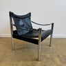 Distinctive Swedish modern safari lounge chair featuring a chrome tubular frame with sling-style arms and suspended seat in supple black leather. Designed by Börje Johanson and produced by Johanson Design. A sculptural and comfortable statement piece in very good vintage condition. Two available. Price is per.
