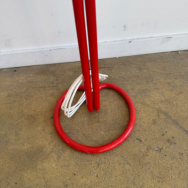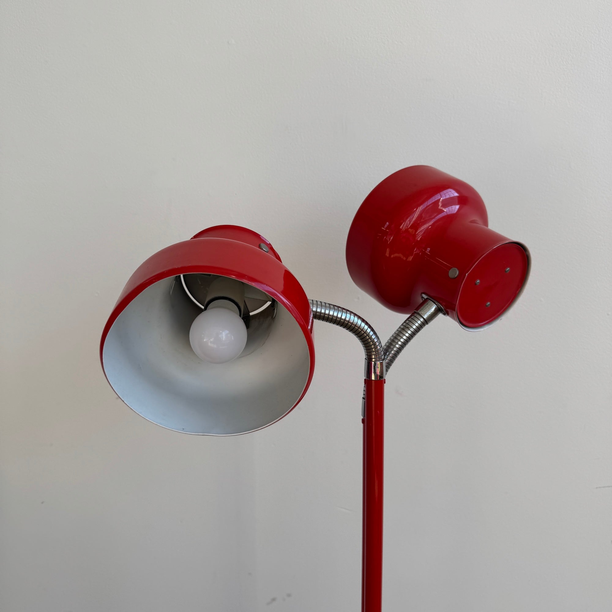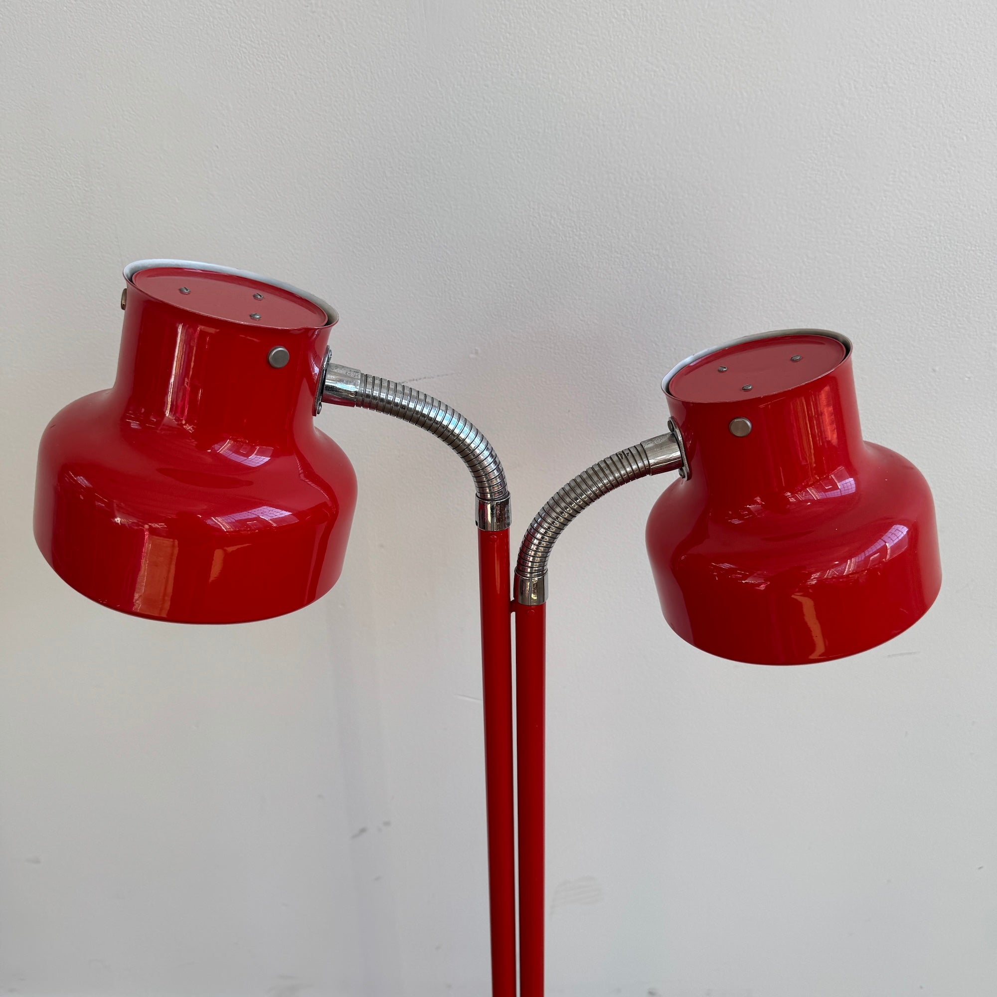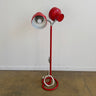 Vintage double-head Bumling floor lamp by Anders Pehrson for Ateljé Lyktan. Features two red lacquered steel shades with chrome gooseneck arms that can be adjusted and configured in multiple directions for flexible lighting. Supported by a circular red base with matching lacquered stem.