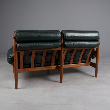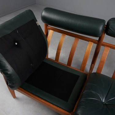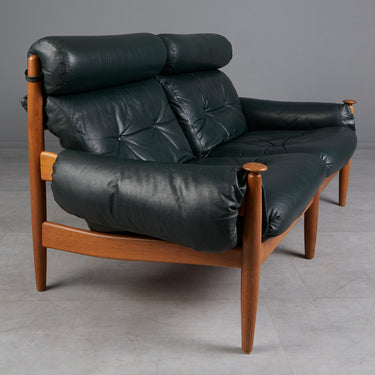 Beautiful two-seater “Admiral” sofa designed by Eric Merthen for Ire Möbler in Sweden during the late 1960s. The frame is crafted in solid oak with soft lines and precise joinery, supporting generously padded cushions upholstered in original dark green leather. The tufted backrests and cylindrical headrests provide an elegant yet relaxed profile, while the wrap-around armrests add comfort and sculptural presence.