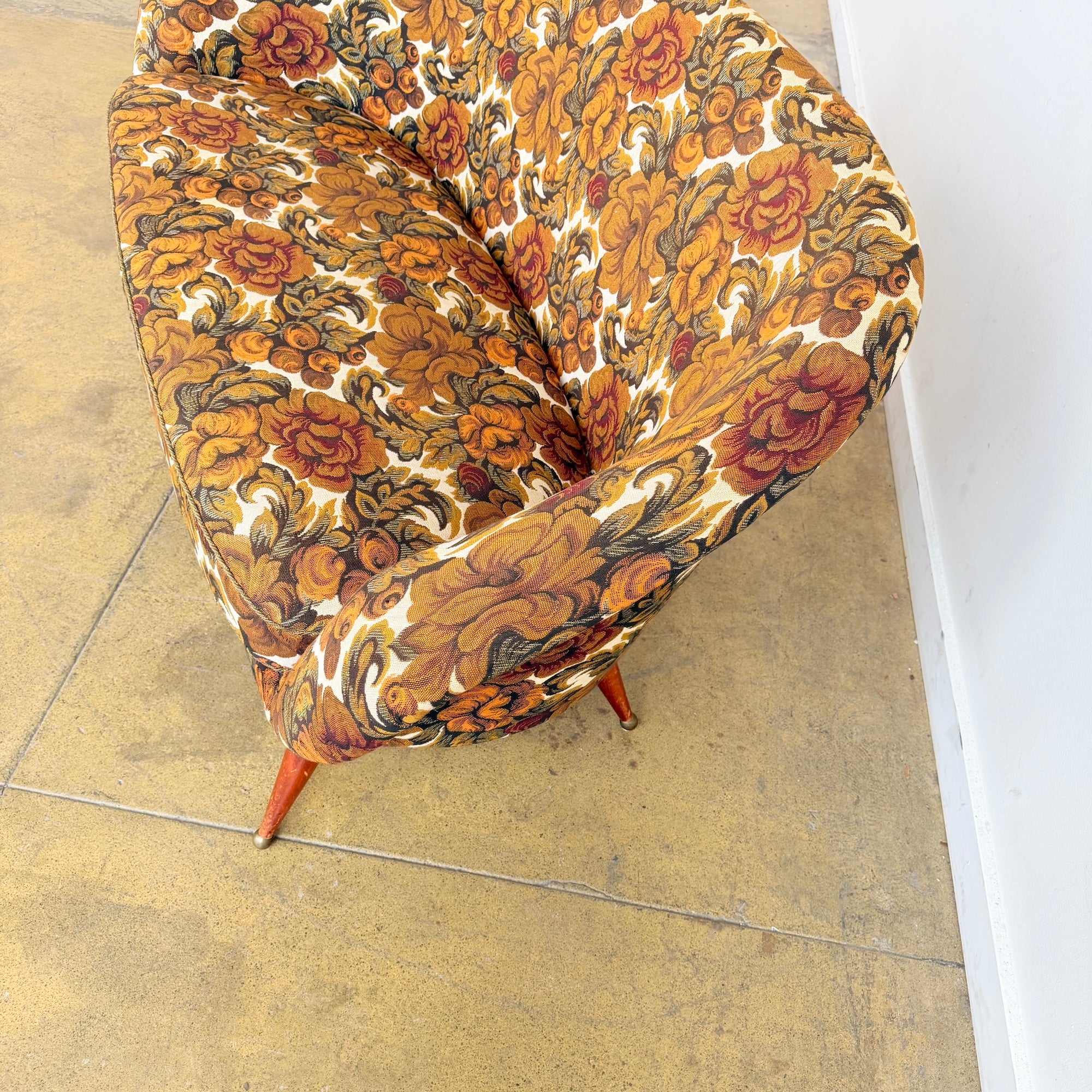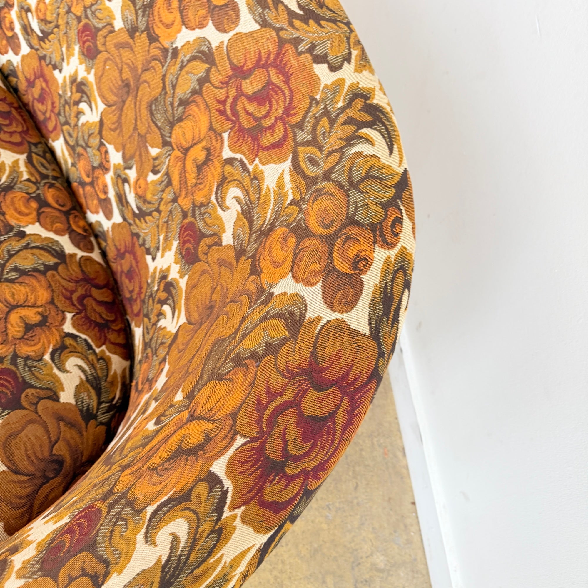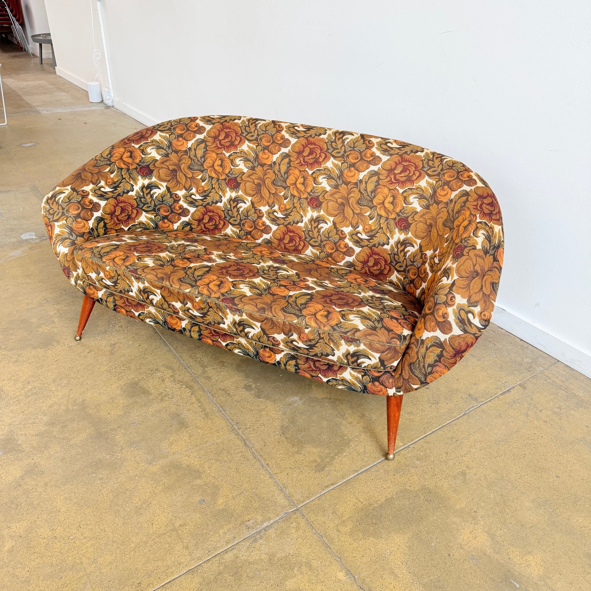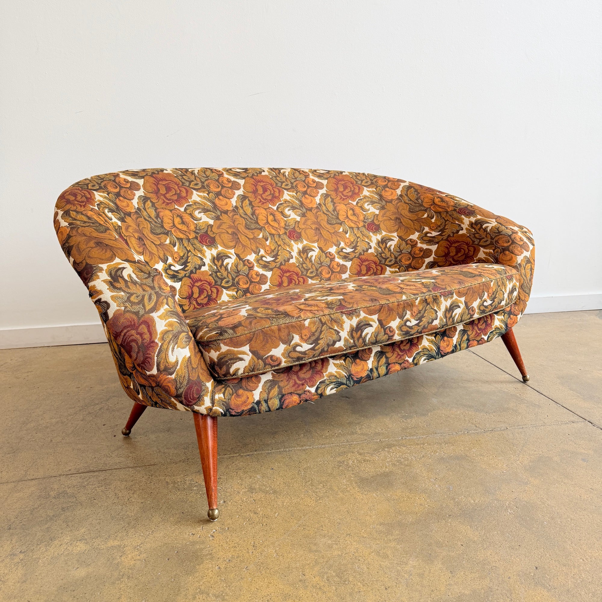 In beautiful original upholstery with no stains, tears, or damage. The fabric presents very well and the sofa remains structurally solid and comfortable with many years of life ahead.