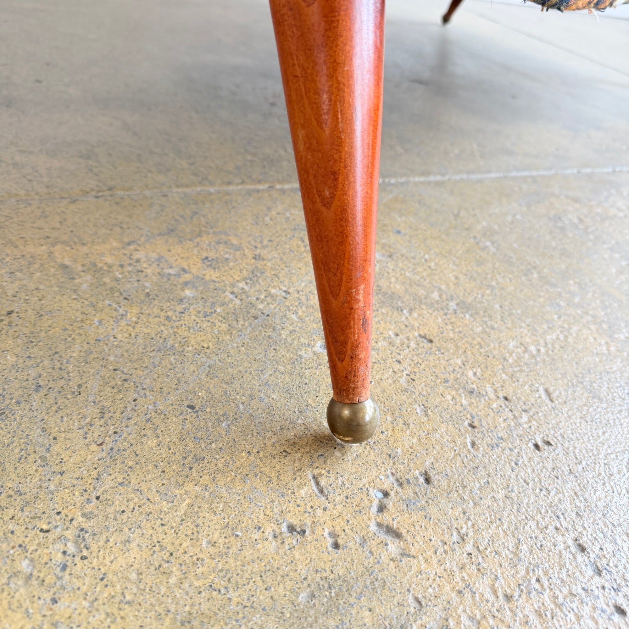 Designed by Folke Jansson in 1956, the Tellus sofa is a beautiful example of mid-century Swedish design with soft, sculptural lines and an inviting silhouette. The gently curved back flows seamlessly into the rounded armrests, giving the piece an elegant, cocoon-like form. It stands on four tapered wooden legs finished with subtle brass caps, adding a refined contrast and lightness to the overall design.