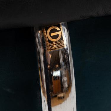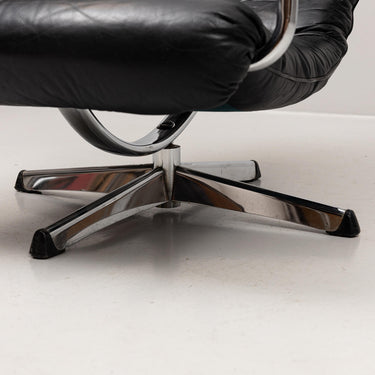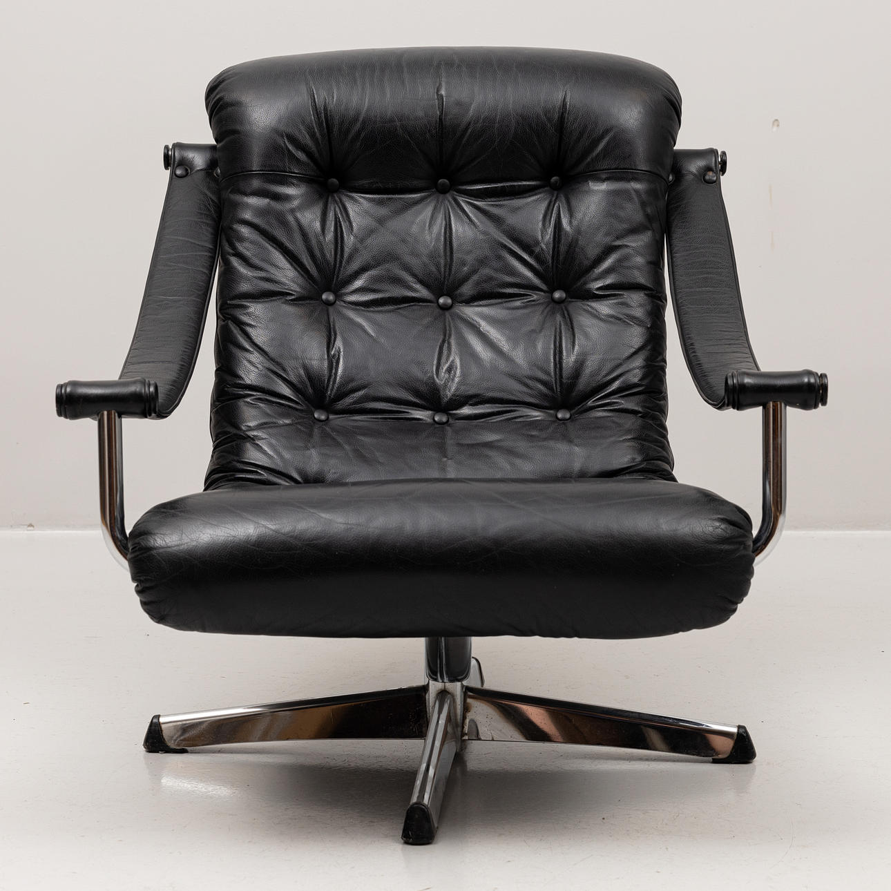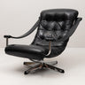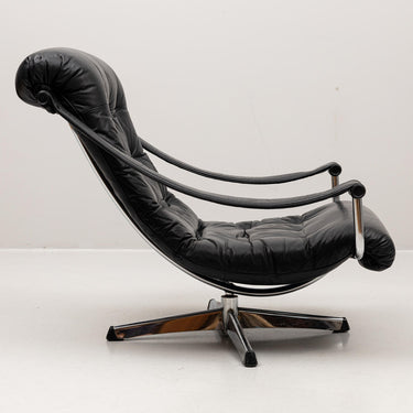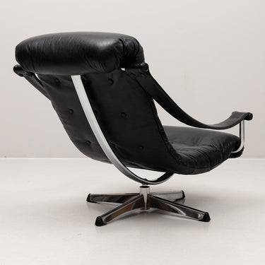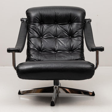 Elegant and comfortable Swedish swivel chair designed and produced by Göte Möbler Nässjö in the 1970s. The model “Lagun” features a tufted black leather seat with plush cushioning, curved arm supports wrapped in matching leather, and a polished chrome frame resting on a four-star swivel base. A timeless design that balances comfort with sculptural form.