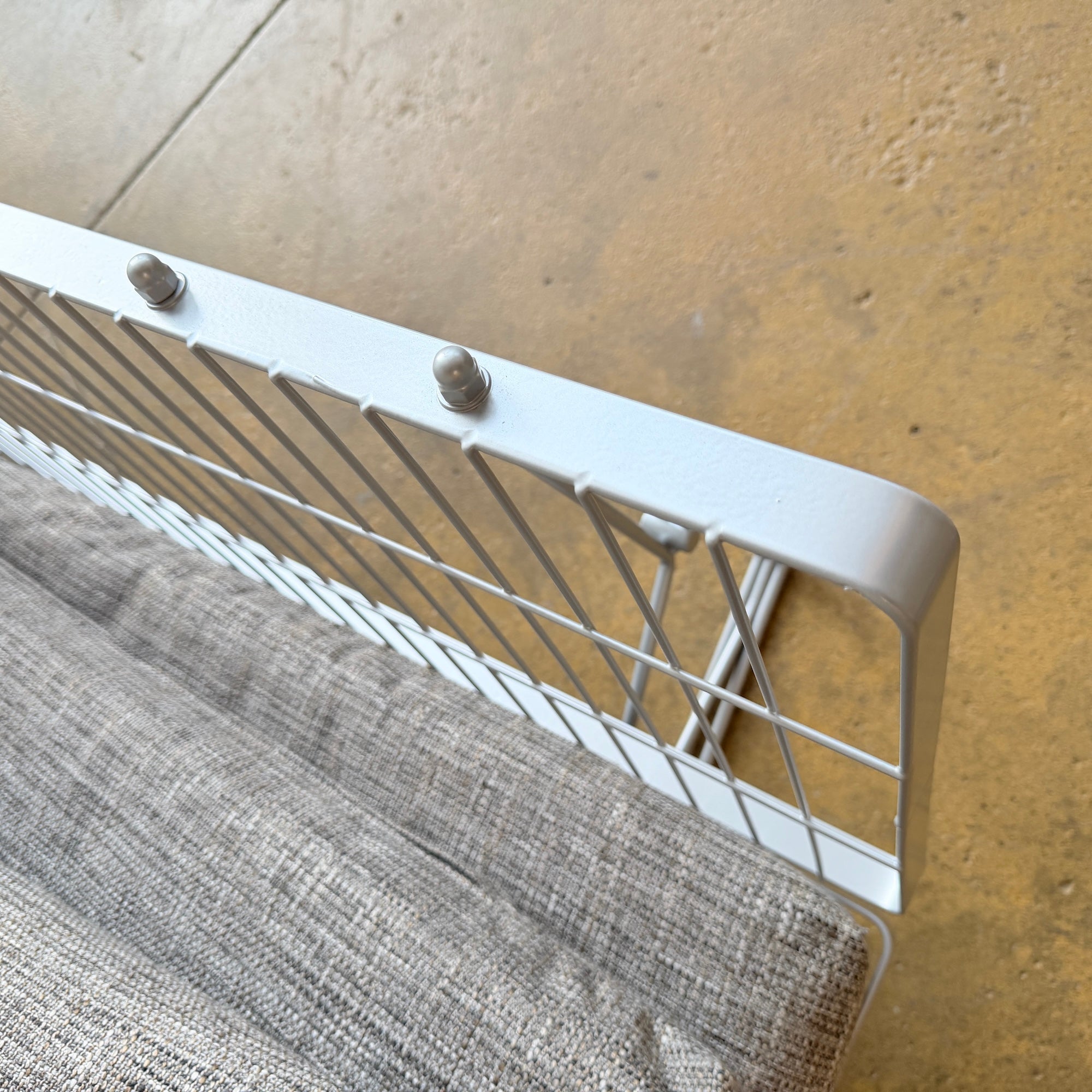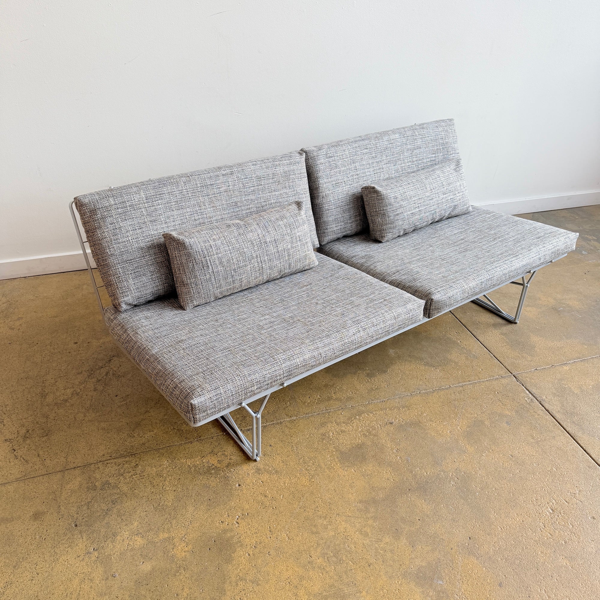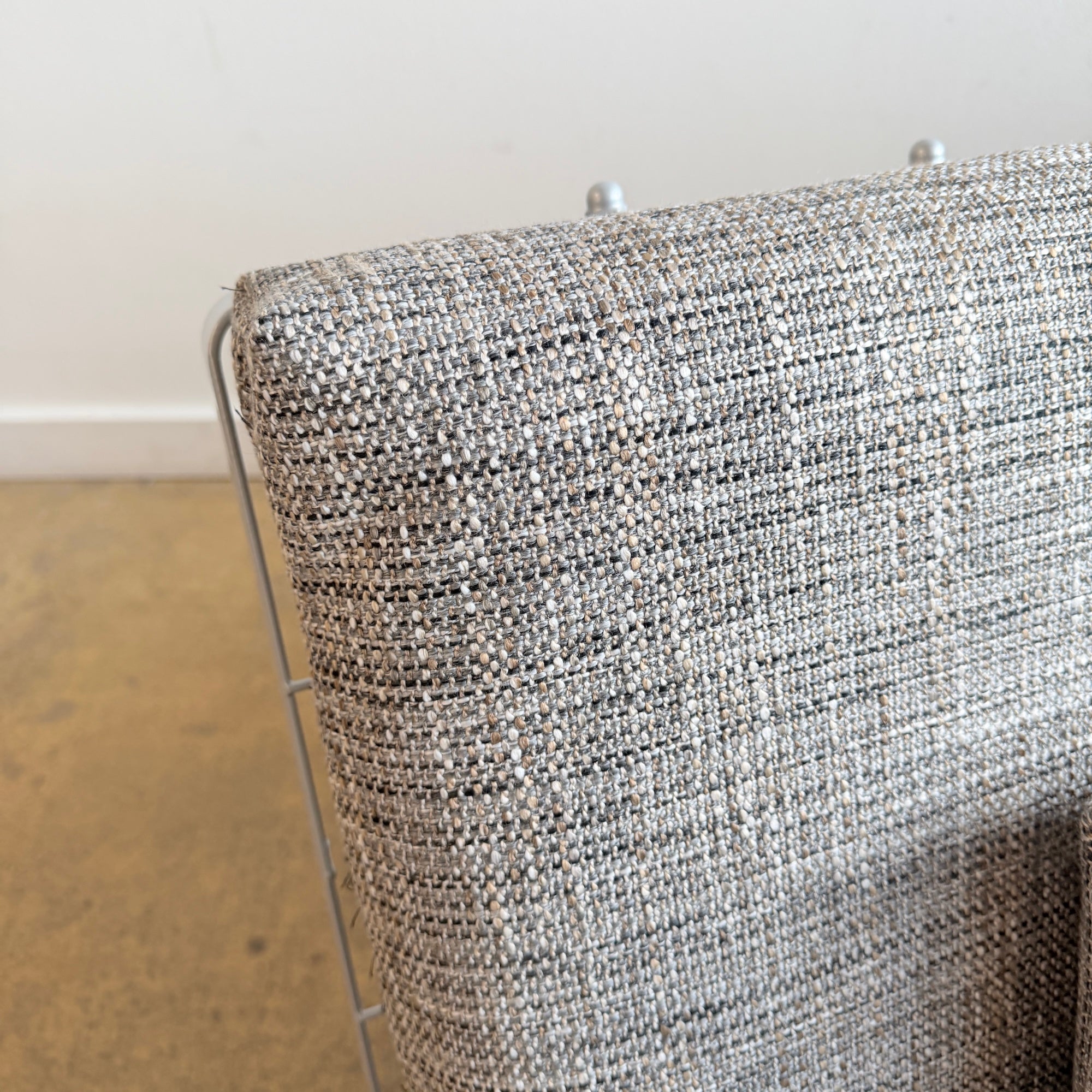 Fully restored with a period-accurate powder coated frame and newly upholstered cushions in performance tweed by Designtex.