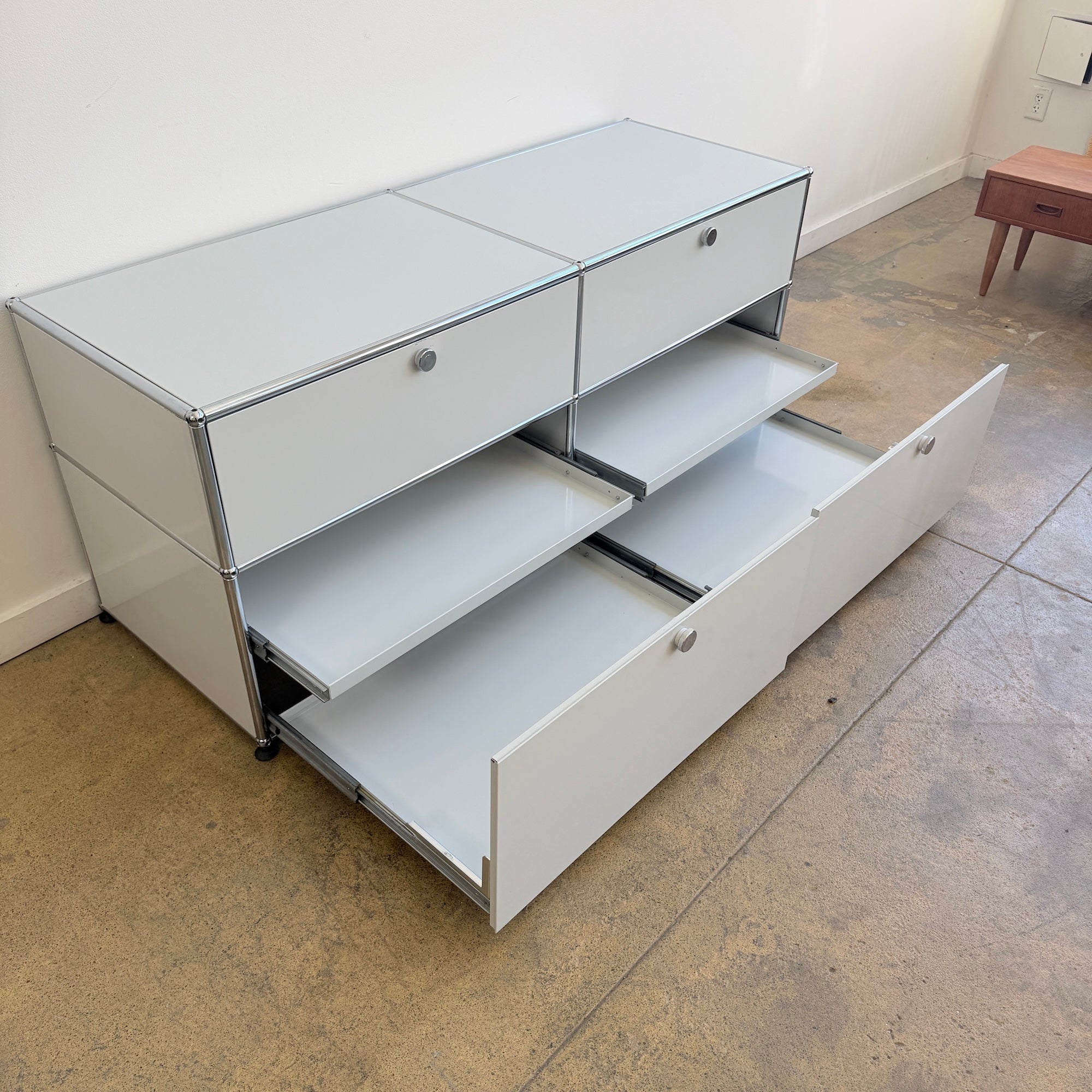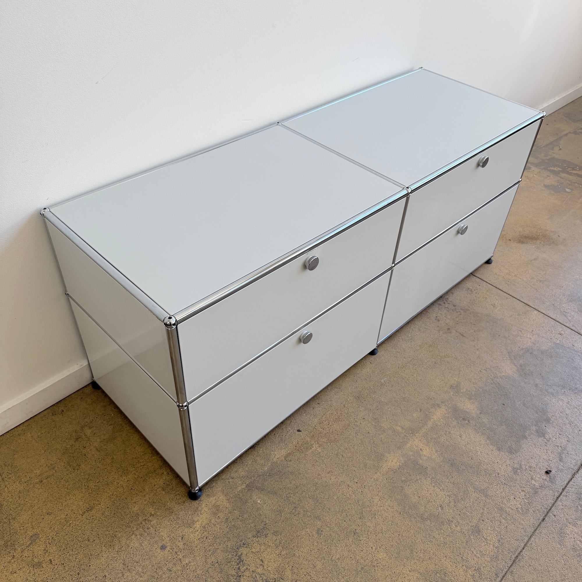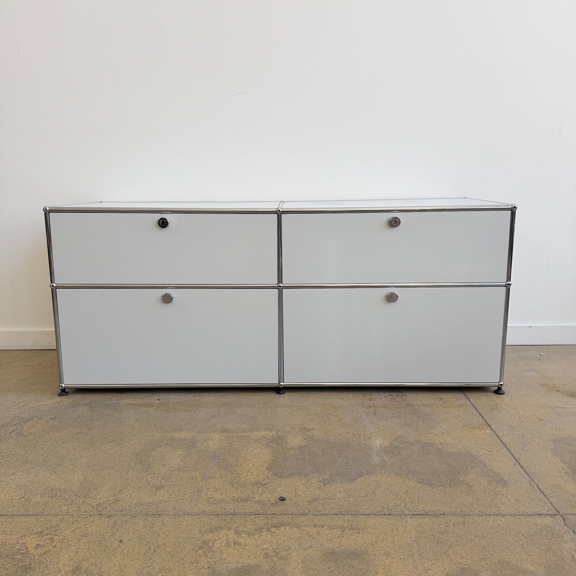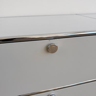Vintage USM Haller first-generation storage system in good vintage condition. Finished in light grey with chrome framing, this configuration features two drop-down doors in the top, and two large lower compartments with integrated pull-out trays. All drawers and doors glide smoothly and function as they should. Hard to find original first generation USM in this condition, especially with this much built-in storage. Estimated value in the current configuration is around $8,500 with current configuration. Some light scuffs here and there.